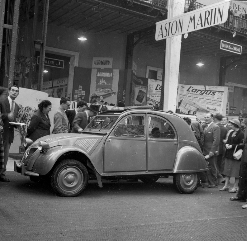 Bien que tous les choix techniques n’aient pas été encore validés, en 1948 la décision est prise de la présenter au 35ème salon de l’automobile et du cycle en octobre. Le secret restera total jusqu’à l’heure de l’inauguration. Sa présentation fut un évènement au sens propre du terme, dans une France se remettant à peine du second conflit mondial. Dès l’ouverture du salon, la foule se presse pour découvrir cette petite auto. Trois véhicules sont présents sur le stand qui fait face à celui de la Régie Renault. Le stand Citroën ne fut pas le premier que le président Auriol visita lors de l’inauguration du Salon de Paris et il était surtout intéressé par les Traction Avant de la firme de Javel, et cette petite voiture grisonnante ne l’inspirait pas outre mesure. Sur le stand, les 3 autos sont encore recouvertes de bâches lorsque le président arrive. Une armée d’hommes en complet-veston empêche les curieux d’approcher. Il n’est que 9h du matin, mais la foule est déjà considérable. Lorsque PJB, après les formules de politesses usuelles et le discours de bienvenue expédiés, demande à deux hommes de procéder au débâchage de la voiture, la foule est interloquée !C’est la première fois que l’on voit un véhicule d’encombrement normal, à quatre vraies places, aussi dépouillé, aussi utilitaire sinon démodé avec ses phares rapportés et une suspension aussi souple. Impossible de voir le moteur, le capot avant est scellé. On précise juste que c’est un moteur de 375 cm3 bicylindre à quatre temps refroidis par air et qu’elle consomme quatre à cinq litres au 100 Km. On précise également que le démarrage à mécanique ne nécessite pas d’accus, livraison courant 1949 pour 185 000 Fr (Anciens Francs). Seule la réputation de Citroën empêche de croire à une supercherie. La réputation de la 2CV se fait toute seule, elle va partout, par tous les temps. Tous l’adoptent : de l’agriculteur au V.R.P. en passant par la religieuse. La presse ne tarit pas d’éloges sur son confort, sa facilité d’utilisation et sa robustesse, mais déplore la finition un peu trop spartiate et faibles aptitudes en côte.