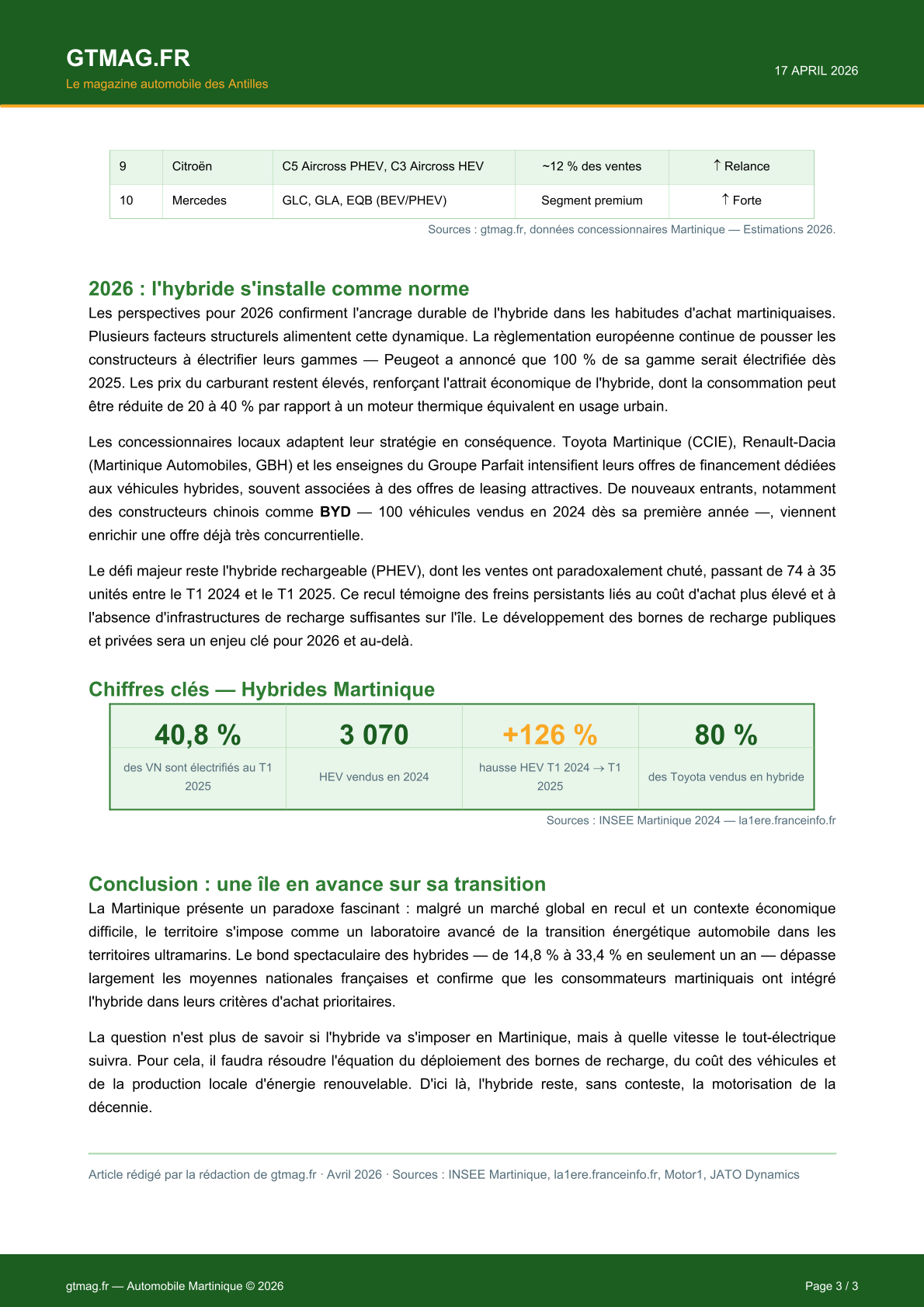 La Martinique figure parmi les territoires les plus acheteurs de voitures neuves au monde, avec plus de 41 véhicules pour 1 000 habitants. Malgré un marché global en recul de 10,7 % en 2024 — première chute depuis 2009 — le segment hybride connaît une progression spectaculaire. En 2024, les hybrides non rechargeables représentaient déjà 24 % des ventes, avant de bondir à 33,4 % au premier trimestre 2025. Au total, en incluant toutes les formes d'électrification, 40,8 % des véhicules neufs vendus au T1 2025 étaient électrifiés, contre seulement 21,3 % un an plus tôt. Toyota domine ce segment avec 80 % de ses ventes en hybride, tandis que Dacia crée la surprise en devenant la première marque électrifiée du T1 2025 grâce au Duster hybride. Cette adoption rapide s'explique par la hausse du prix du carburant, la géographie… L'article ci-dessous par la rédaction de gtmag.fr  :