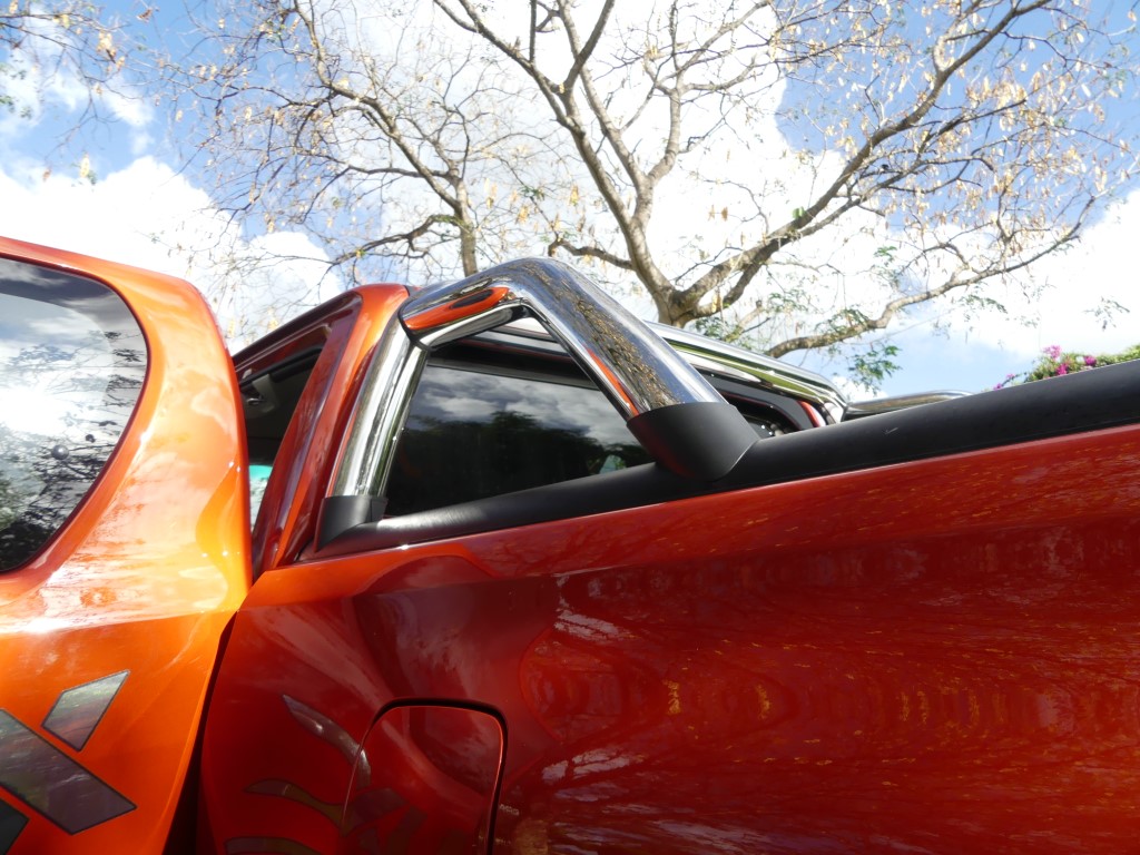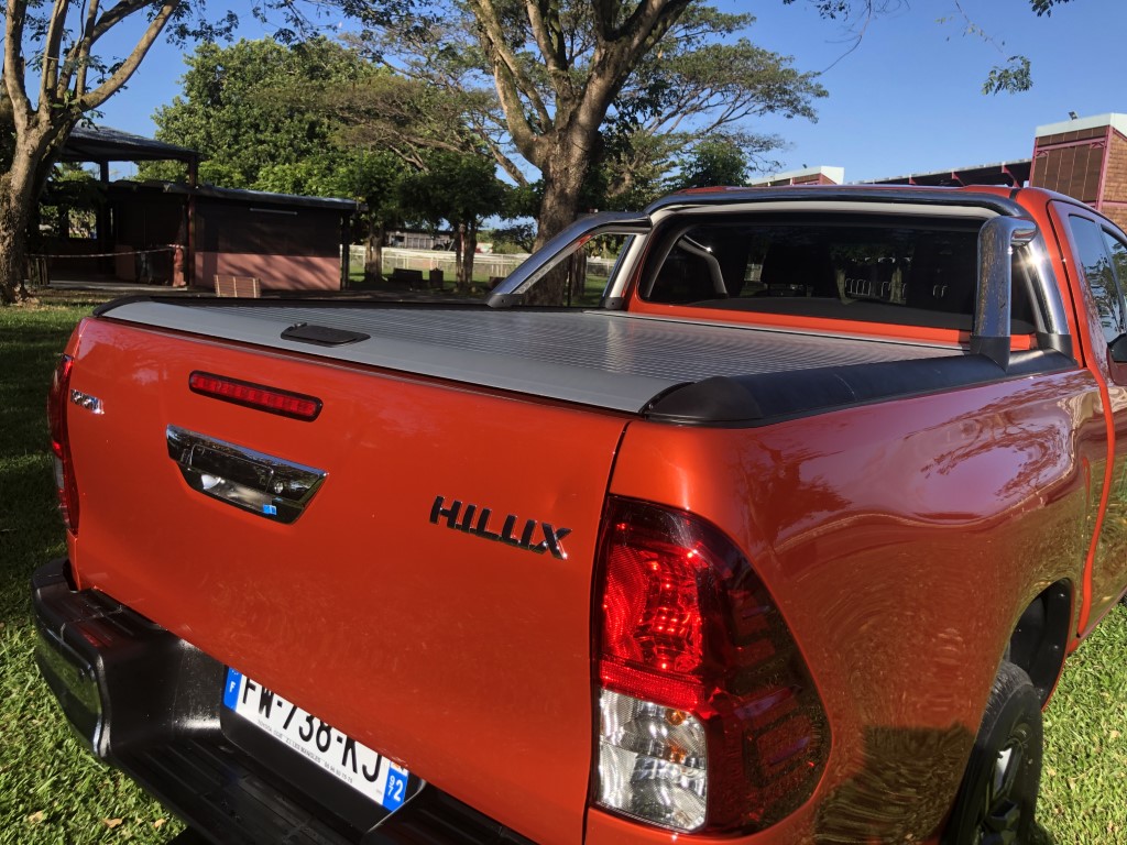 Pour la remorque de votre bateau le dispositif de contrôle de stabilité de l’attelage (TSC) garantit sa stabilité en cas de vent fort ou de surface de route irrégulière. Seul modèle à réunir l’ensemble des technologies de sécurité active et passive développées par Toyota, le Nouveau Hilux doit vous emmener (presque) partout, en toute sécurité. À l’occasion de son restylage, les angles de la carrosserie du Hilux sont plus saillants tandis que ses feux avant et arrière, maintenant à LED, sont plus cubiques. J’y remarque comme vous la grille de calandre et les rétroviseurs chromées, les jantes alu 17’’, le par-choc arrière également chromé tout comme les poignées de portes… Remarquez que les vitres arrières latérales sont sur-teintés ce qui sophistique l’aspect général du Toyota Hilux