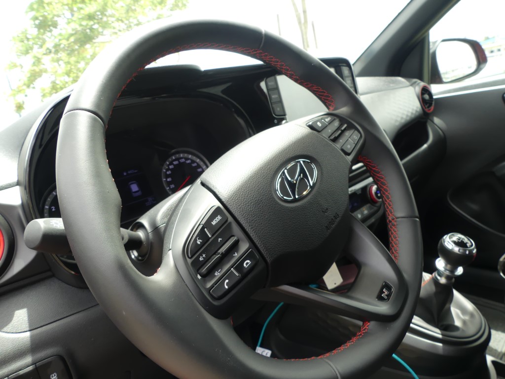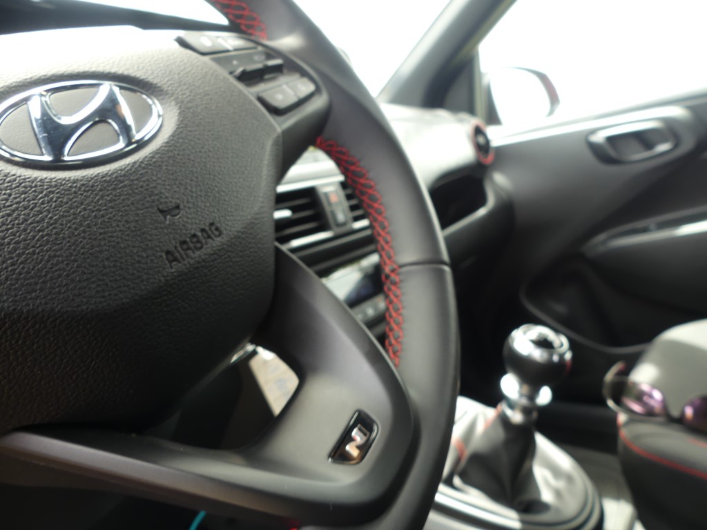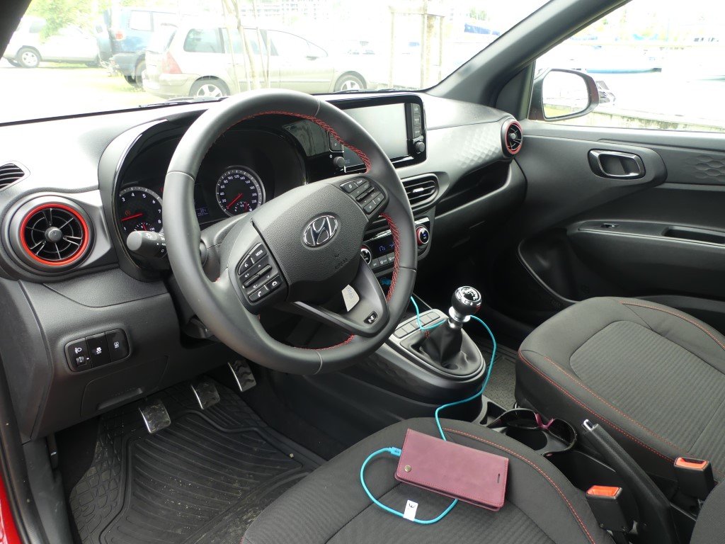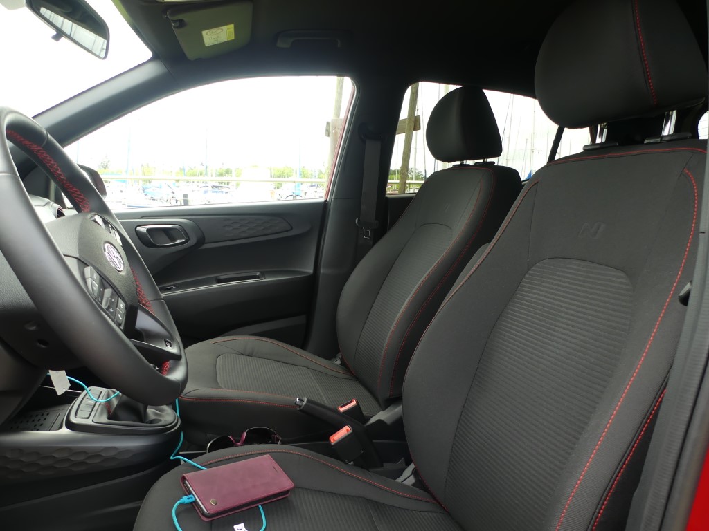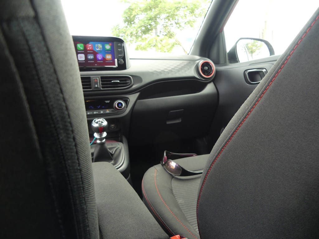 A l’intérieur, la nouvelle Hyundai i10 N Line garde presque le même habitacle que son sosie docile. Une fois à bord, on remarque tout de suite la dominance du rouge qui d’ailleurs encourage l’allure sportive de l’i10 N Line. A savoir des sièges en tissu N Line avec surpiqûres rouges, un volant et une boite à vitesse badgées N, et n’oublions pas les grilles de ventilation entourées de rouge. Finalement, la petite sportive neuve garde la plupart des options que le reste de la gamme i10. À savoir un écran tactile de 8 pouces, une climatisation manuelle, l’aide au stationnement ainsi qu’une camera de recul, le pack SmartSense qui comprend l’assistance active au maintien de voie ainsi qu’un détecteur de fatigue du conducteur.