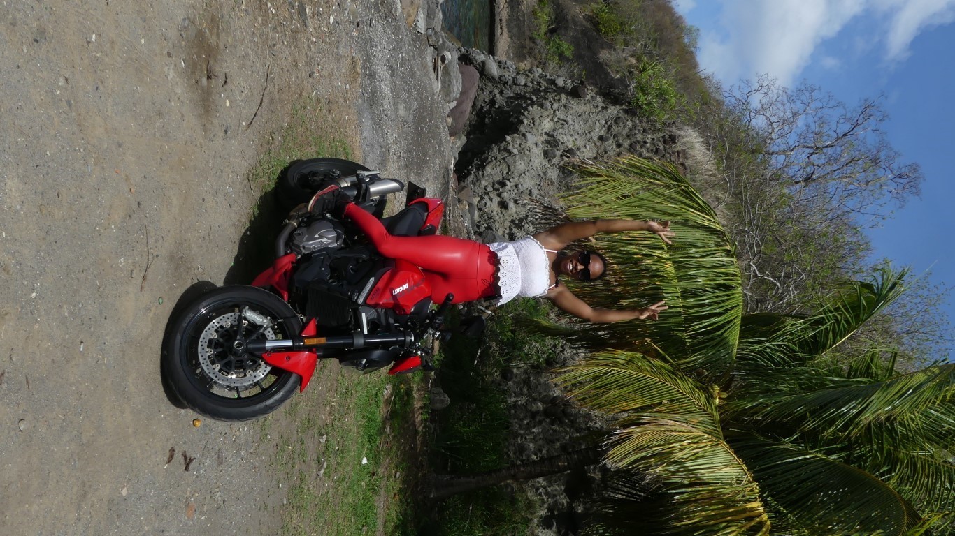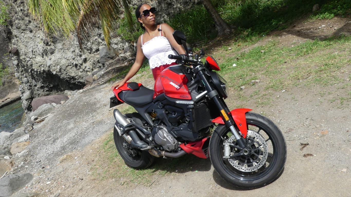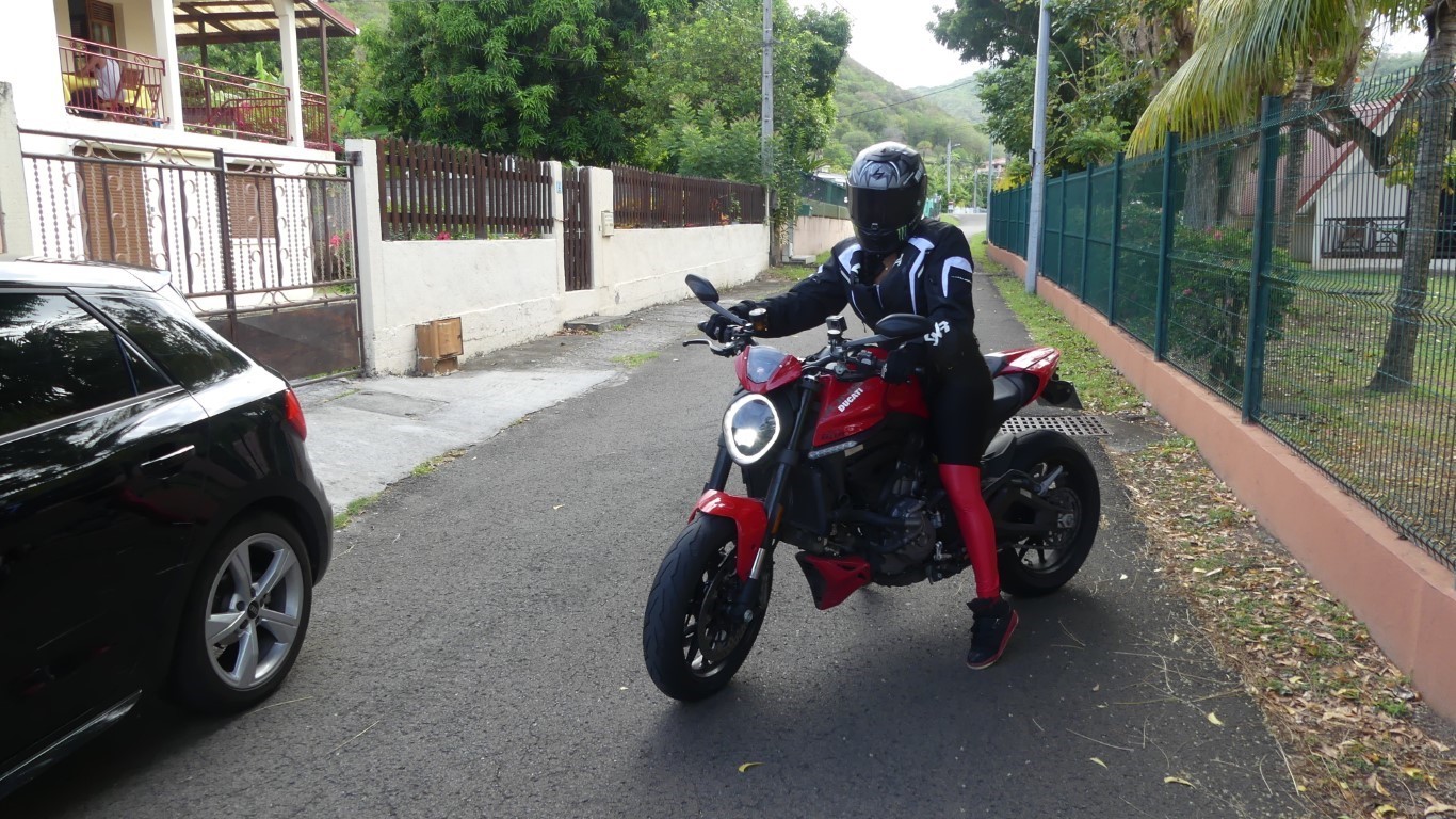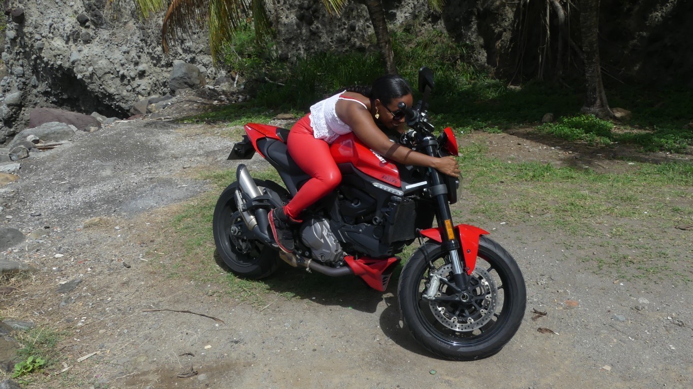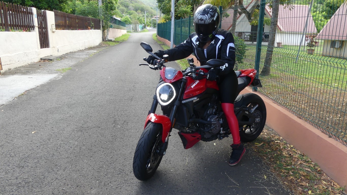 En gros un jouet des villes qui ne rechignera pas à grimper les hauts mornes de Martinique de façon sportive voir agressive selon vos souhaits en jouant avec ses 3 modes de conduite : Urban, Touring et Sport.  Ils jouent sur la cartographie, mais aussi sur le traction control et l’ABS. Sachant qu’il est possible de changer de mode en roulant ! Ducati n’a pas lésiné puisqu’il est possible de rentrer dans les cartographies pour les configurer plus finement. Les plus téméraires déconnecteront l’anti-wheeling ou réaliseront un démarrage canon en usant du Launch Control. Allé et si on demandait à Claire Boulogne ce qu'elle en pense elle de sa moto ??? Entendez-la dans notre essai vidéo ci-dessus...