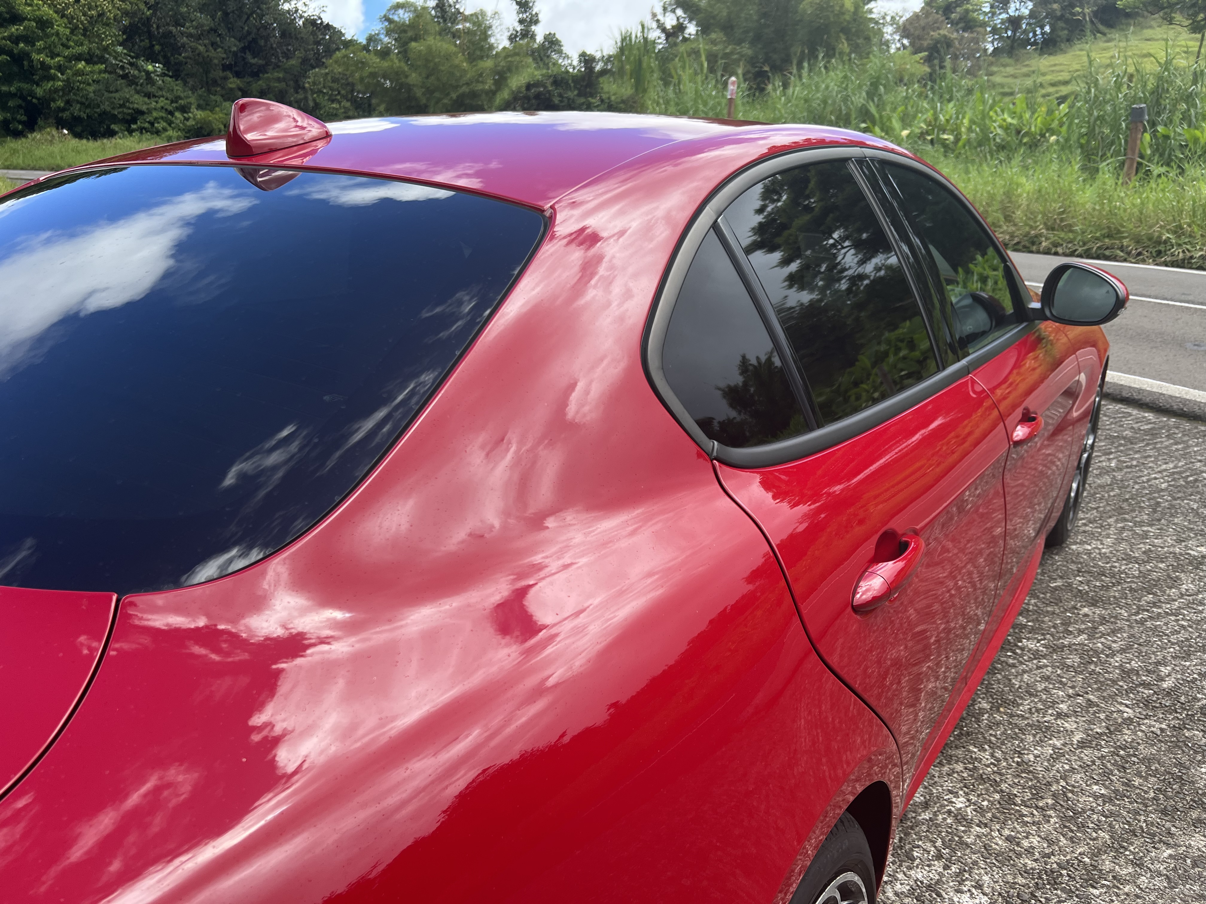 Motorisation de base je disais ? Pour une entrée de gamme fonctionnant au sans-plomb elle présente quelques arguments sur notre marché martiniquais ! Si chez les allemandes on débute à 150 ch, voire 130 ch, chez Alfa, sur l’échelle des puissances de base on place le curseur à 200 ch. Il s'agit donc du même 4 cylindres 2.0 vu sur la Véloce, mais dégonflé de 80 ch. Le couple s'établit à la très respectable valeur de 330 Nm à 1 750 tours/min. Et la seule transmission possible est la propulsion accouplée à la boîte automatique AT8 huit rapports. Les performances annoncées sont alléchantes. Le 0 à 100 km/h est abattu en 6,6 secondes et la vitesse de pointe est de 235 km/h, les Allemandes font moins bien (0 à 100 km/h en 7,3 s pour l'A4 et la Série 3, 7,2 s pour la Classe C, toutes en boîte auto).