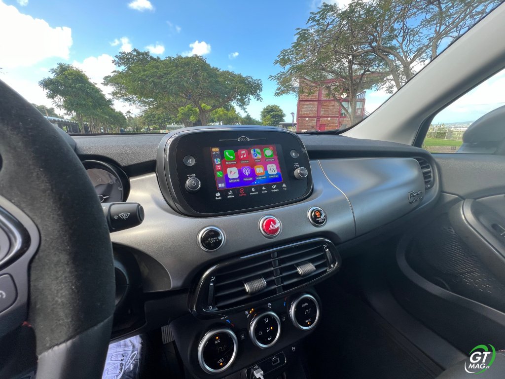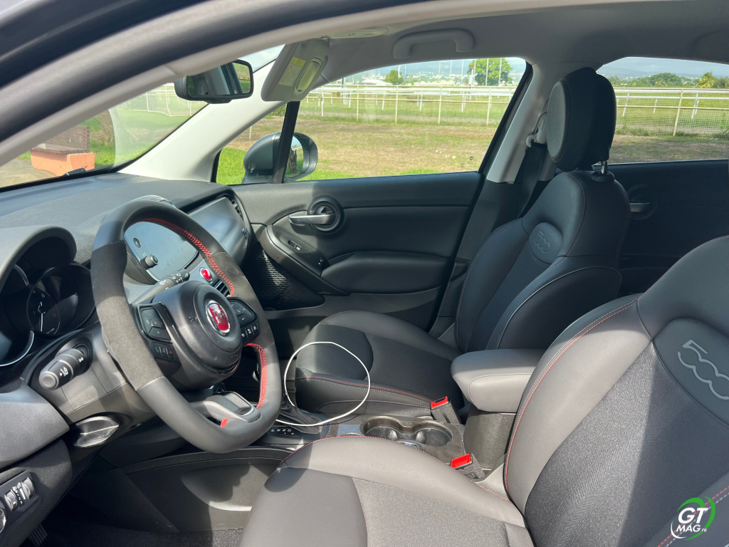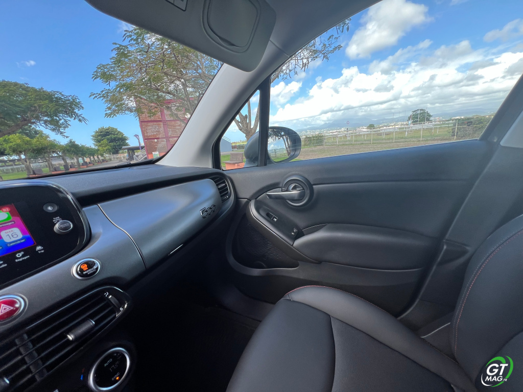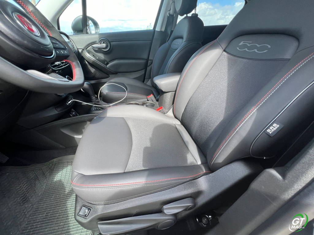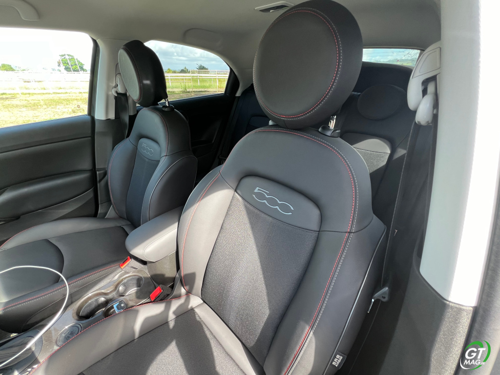 On retrouve les bases de la 500X mais Fiat propose à ses aficionados un volant sportif, des surpiqures rouges sur les sièges, un pommeau de vitesses en aluminium pour la version manuelle, quelques logos ici et là ainsi qu’un tableau de bord exclusif avec une finition « titane ». Pour le côté communication la Fiat 500X sport aligne un écran tactile de 7 pouces plus petit que sur la version tout électrique et deux prises USB qui permettent de connecter des appareils sous la console centrale.