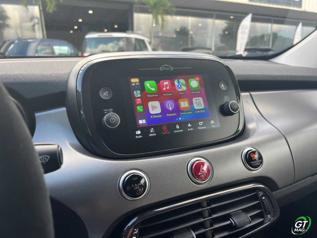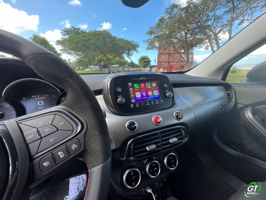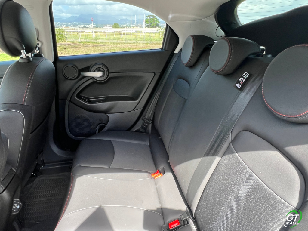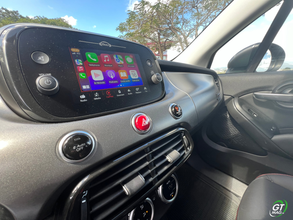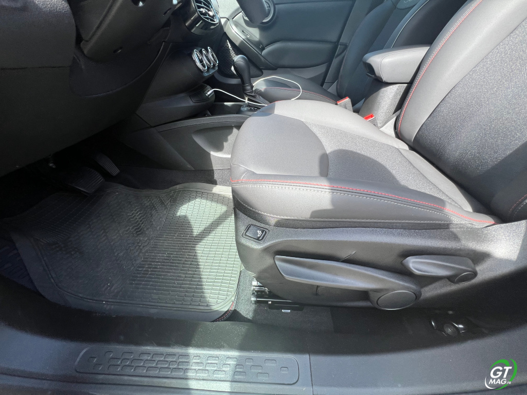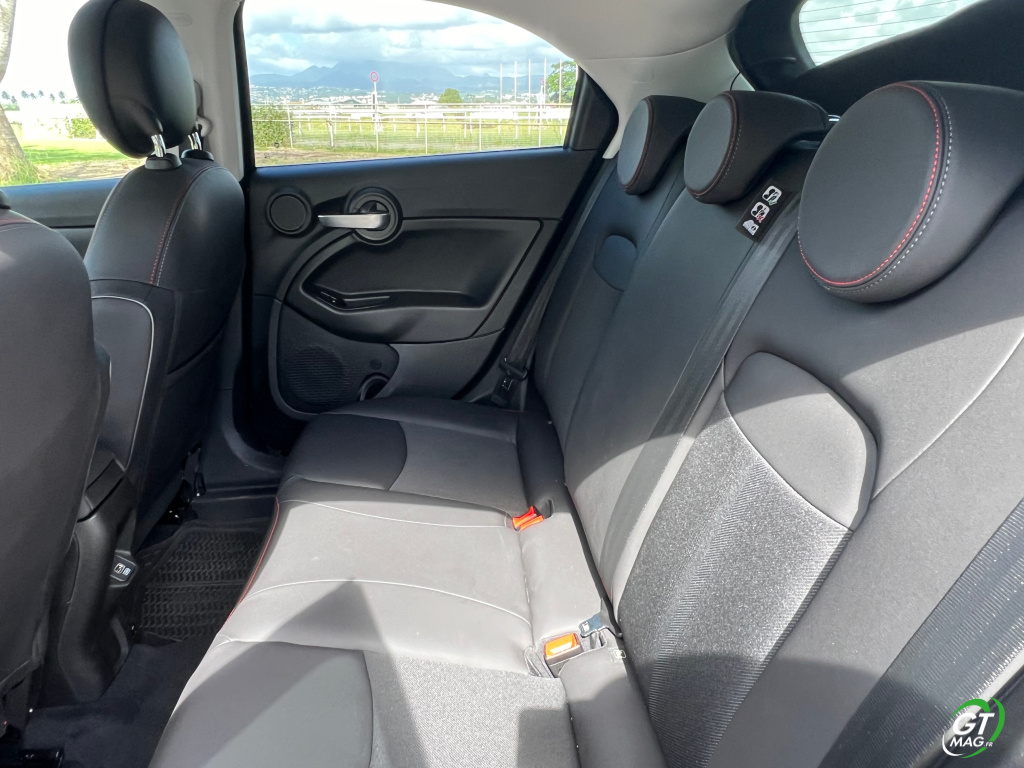 On retrouve les bases de la 500X mais Fiat propose à ses aficionados un volant sportif, des surpiqures rouges sur les sièges, un pommeau de vitesses en aluminium pour la version manuelle, quelques logos ici et là ainsi qu’un tableau de bord exclusif avec une finition « titane ». Pour le côté communication la Fiat 500X sport aligne un écran tactile de 7 pouces plus petit que sur la version tout électrique et deux prises USB qui permettent de connecter des appareils sous la console centrale.