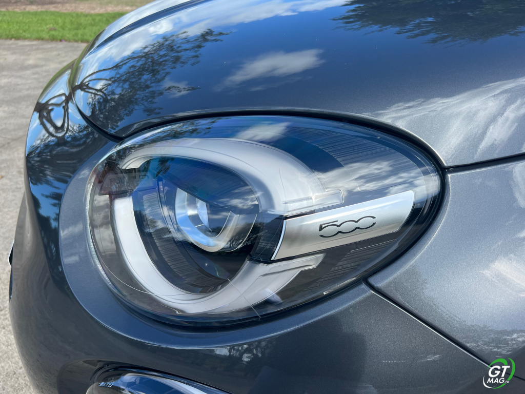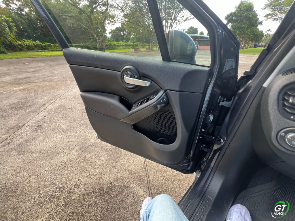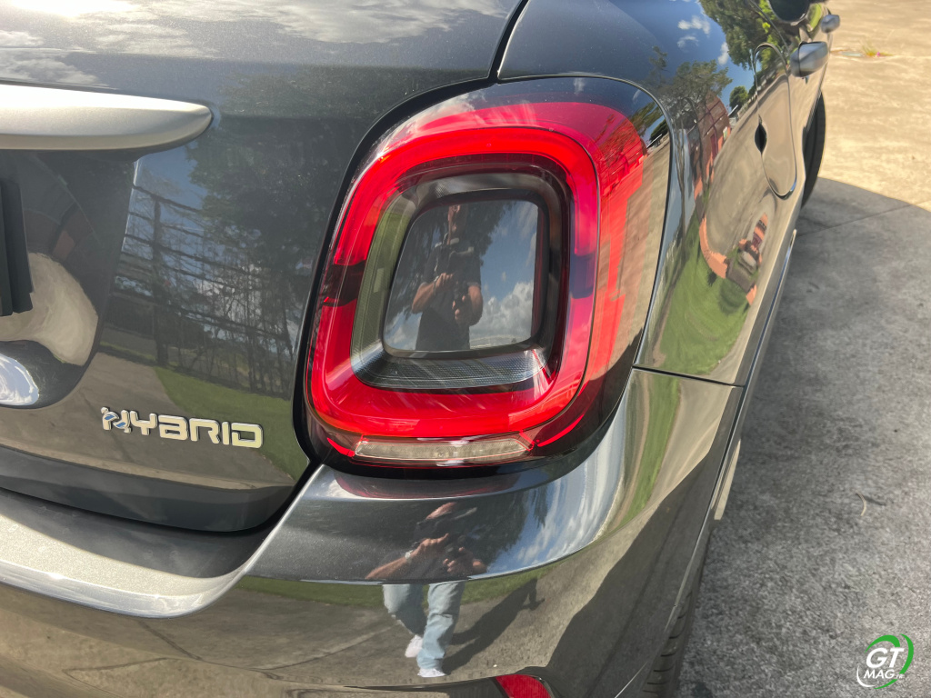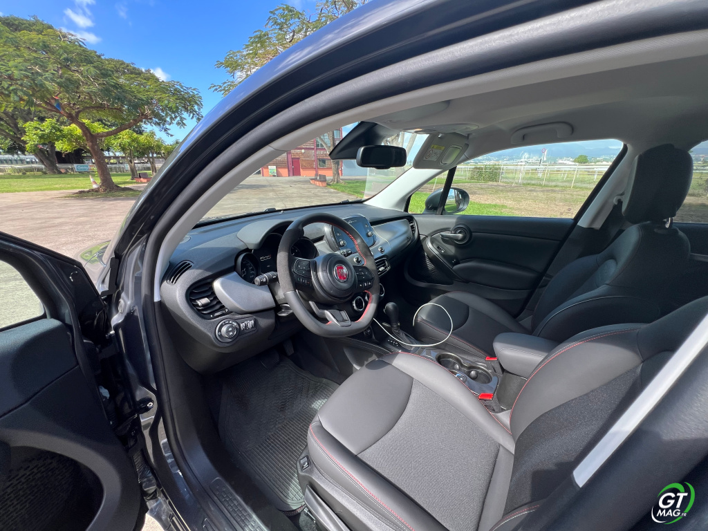 C’est par cet aspect que tout se joue, cette version sport de la Fiat 500X 1.5l Turbo se veut d’entrée bien plus agressive que la classique 500X avec notamment une hauteur de caisse rabaissée de 13 mm, une signature lumineuse à LED en forme de double goutte plutôt bien réussie celle-ci surplombe un parechoc bien dessiné qui rend le modèle séduisant… Le nouveau logo 500 fait son effet… J’aime le choix des jantes en alliage de 17, 18 ou 19 pouces, les joncs de portes en couleur ou encore la moulure chromée sur le capot. A l’arrière les formes sont maintenant aussi la signature du modèles principalement grâce à cette large lame chromée qui se diffuse sur le logo Fiat le tout agrémenté d’un nouvel échappement double… Cette petite citadine sait rester discrète mais dès que l’on s’en approche un peu impossible de ne pas penser à une légère affinité avec Abarth et donc on s’attend à plus de muscle et donc plus de punch… A noter les passages de roues aux couleurs de la carrosserie…