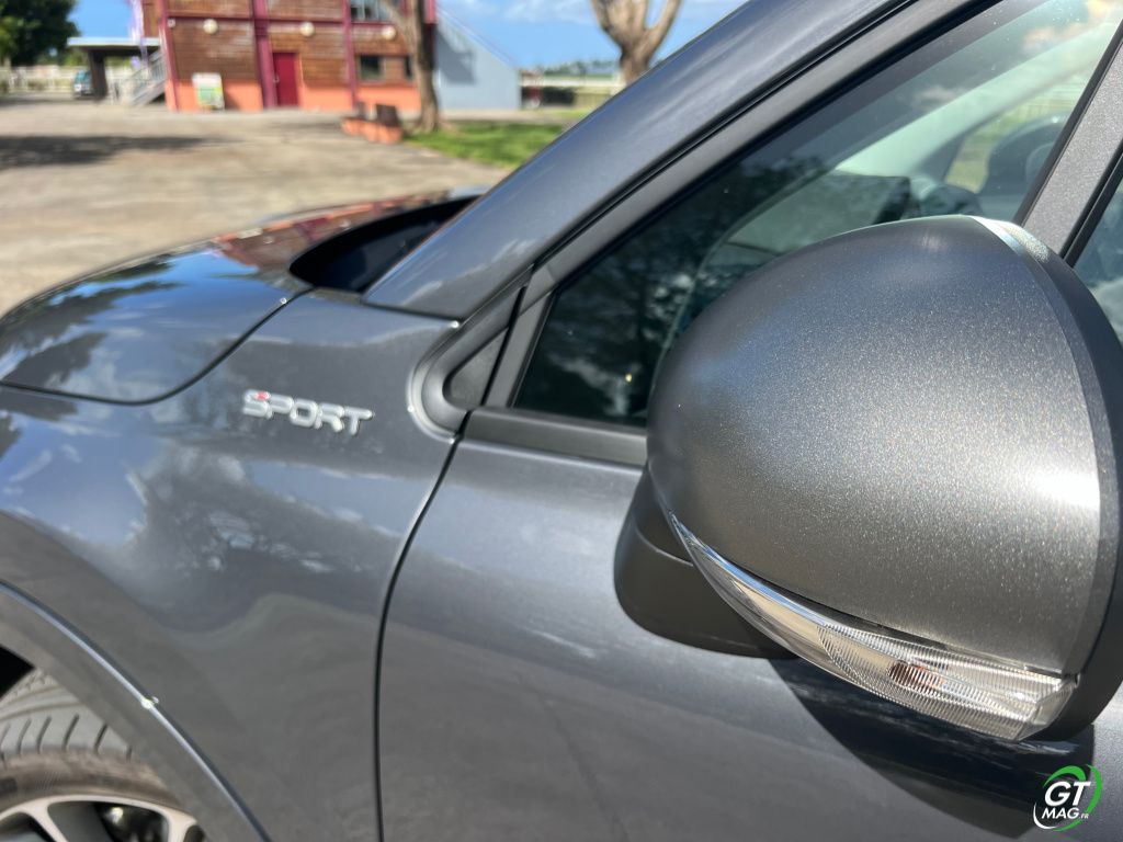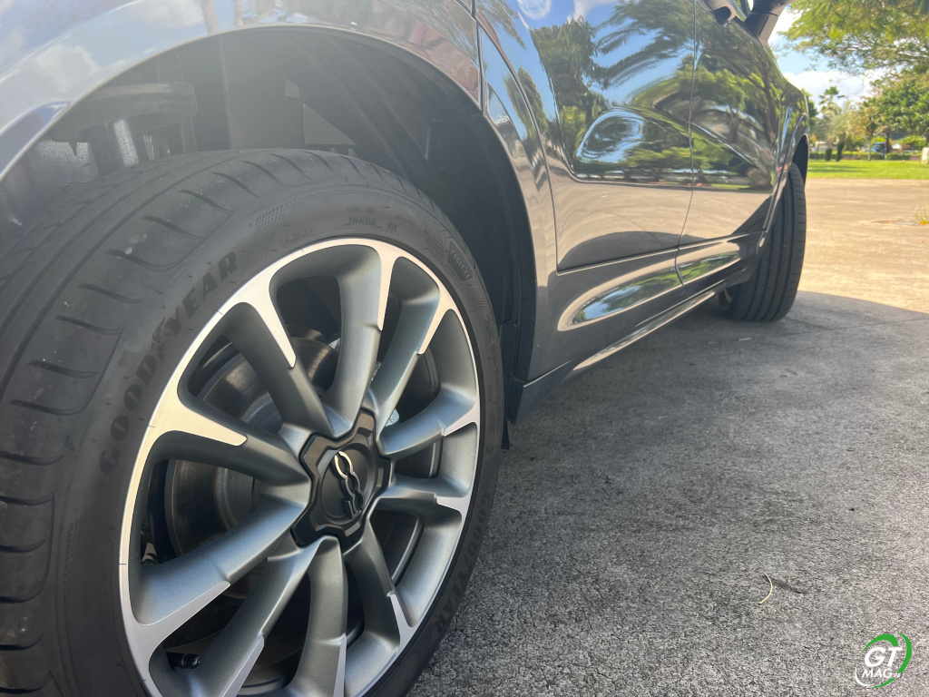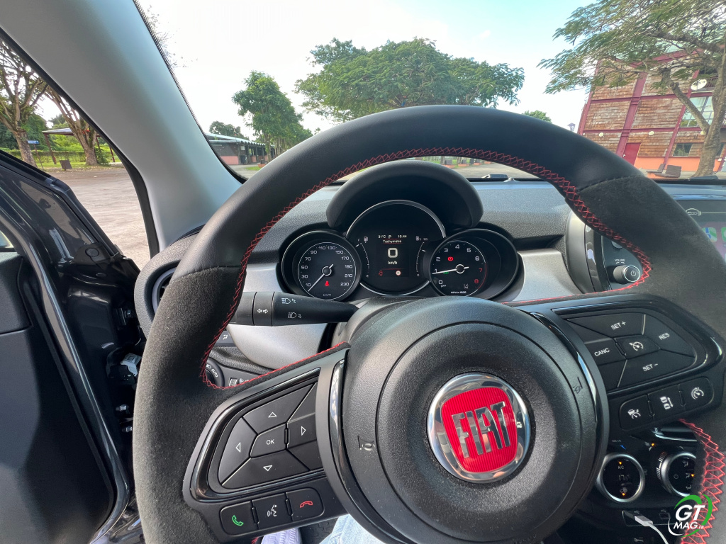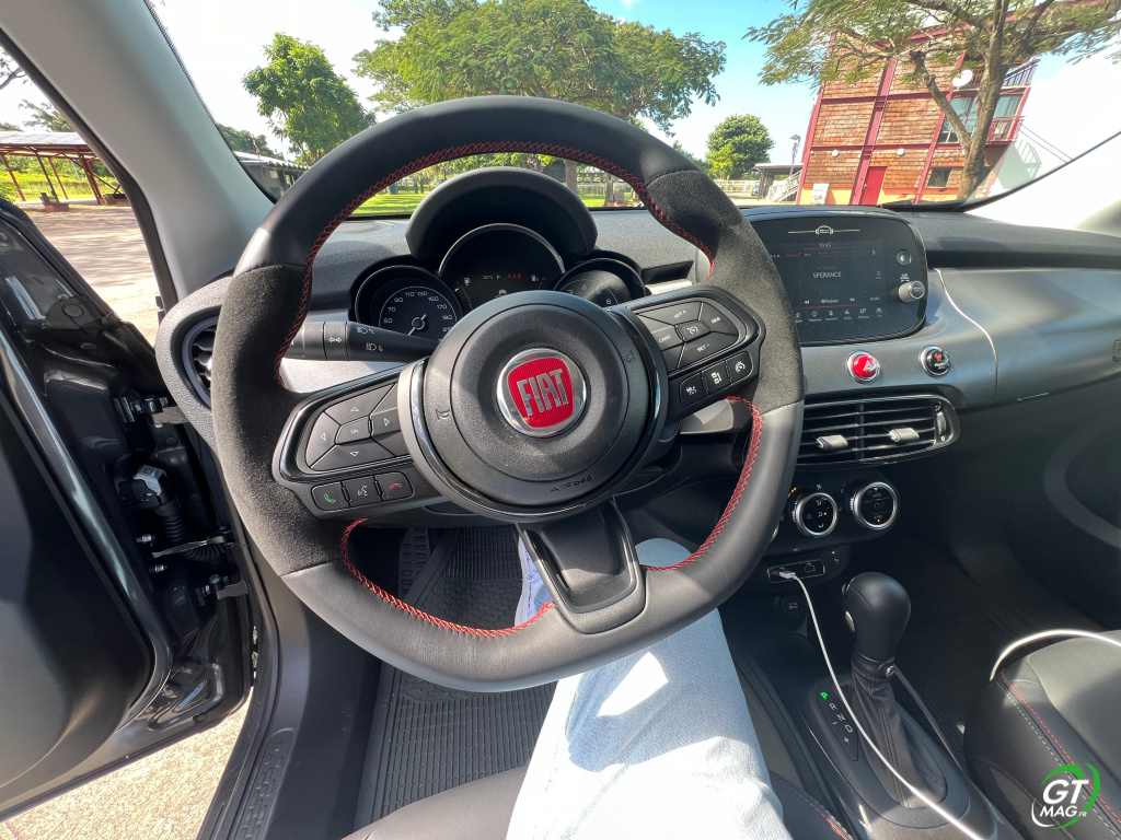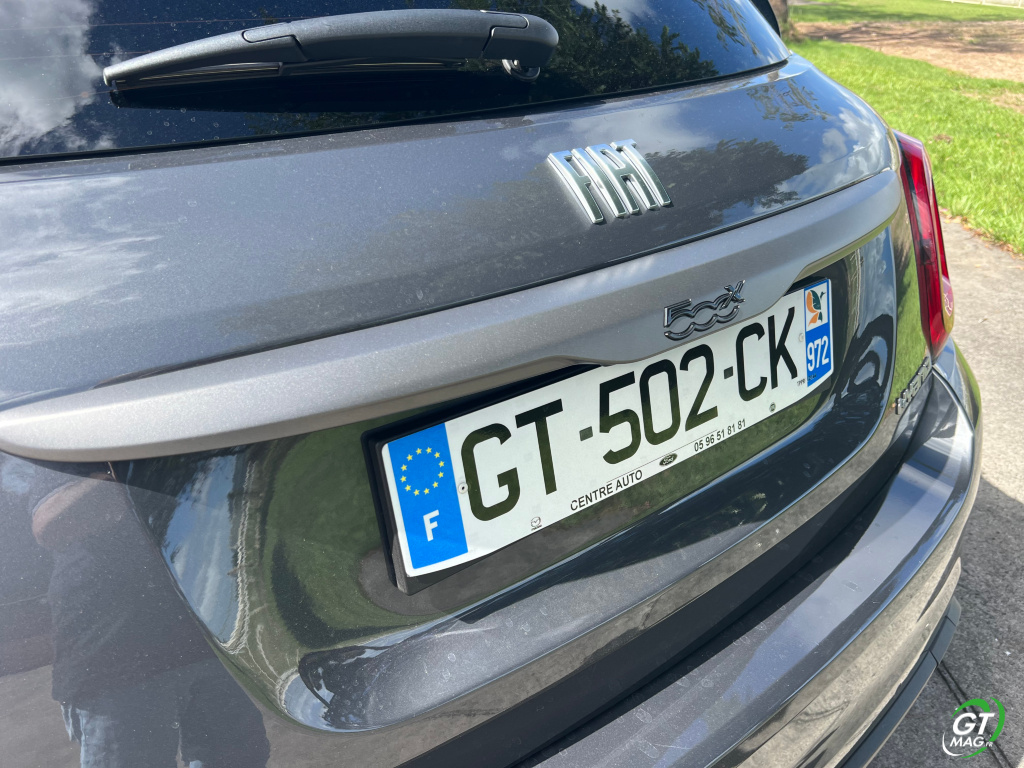 C’est par cet aspect que tout se joue, cette version sport de la Fiat 500X 1.5l Turbo se veut d’entrée bien plus agressive que la classique 500X avec notamment une hauteur de caisse rabaissée de 13 mm, une signature lumineuse à LED en forme de double goutte plutôt bien réussie celle-ci surplombe un parechoc bien dessiné qui rend le modèle séduisant… Le nouveau logo 500 fait son effet… J’aime le choix des jantes en alliage de 17, 18 ou 19 pouces, les joncs de portes en couleur ou encore la moulure chromée sur le capot. A l’arrière les formes sont maintenant aussi la signature du modèles principalement grâce à cette large lame chromée qui se diffuse sur le logo Fiat le tout agrémenté d’un nouvel échappement double… Cette petite citadine sait rester discrète mais dès que l’on s’en approche un peu impossible de ne pas penser à une légère affinité avec Abarth et donc on s’attend à plus de muscle et donc plus de punch… A noter les passages de roues aux couleurs de la carrosserie…