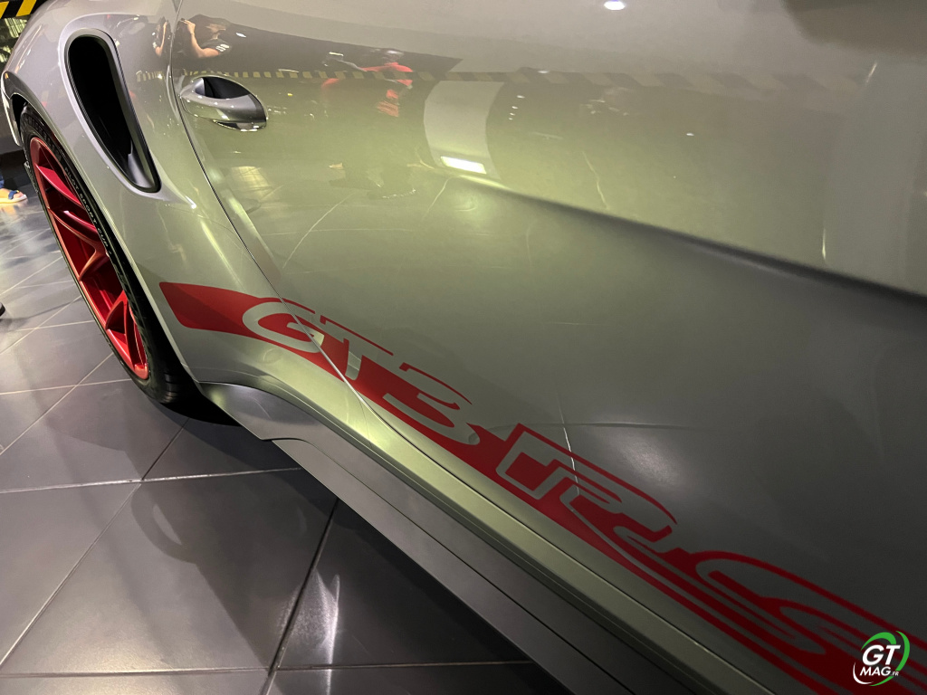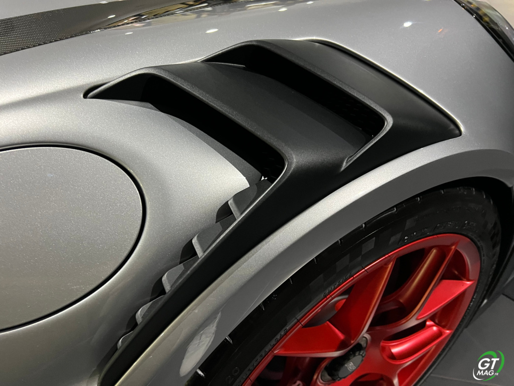 Sur le plan esthétique, cette GT3 RS présentée chez Porsche Martinique se distingue par son design agressif, ses jantes rouges vives et ses caractéristiques aérodynamiques avancées, telles que son imposant aileron arrière noir réglable et son kit carrosserie spécifique, qui améliorent non seulement l'apparence de la voiture mais aussi sa stabilité à haute vitesse.