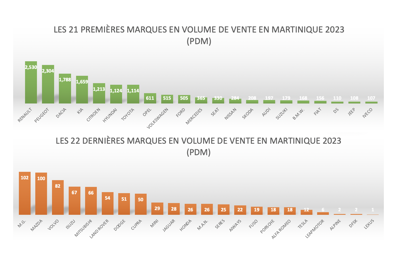 Voici 2 graphiques représentant la part de marché globale (PDM) de chaque marque en Martinique pour 2023, classées de la plus grande à la plus petite part de marché. Ce graphique met en évidence les marques dominantes ainsi que celles ayant une présence plus modeste sur le marché, vous permettant de visualiser facilement la répartition du marché automobile pour l'année concernée.