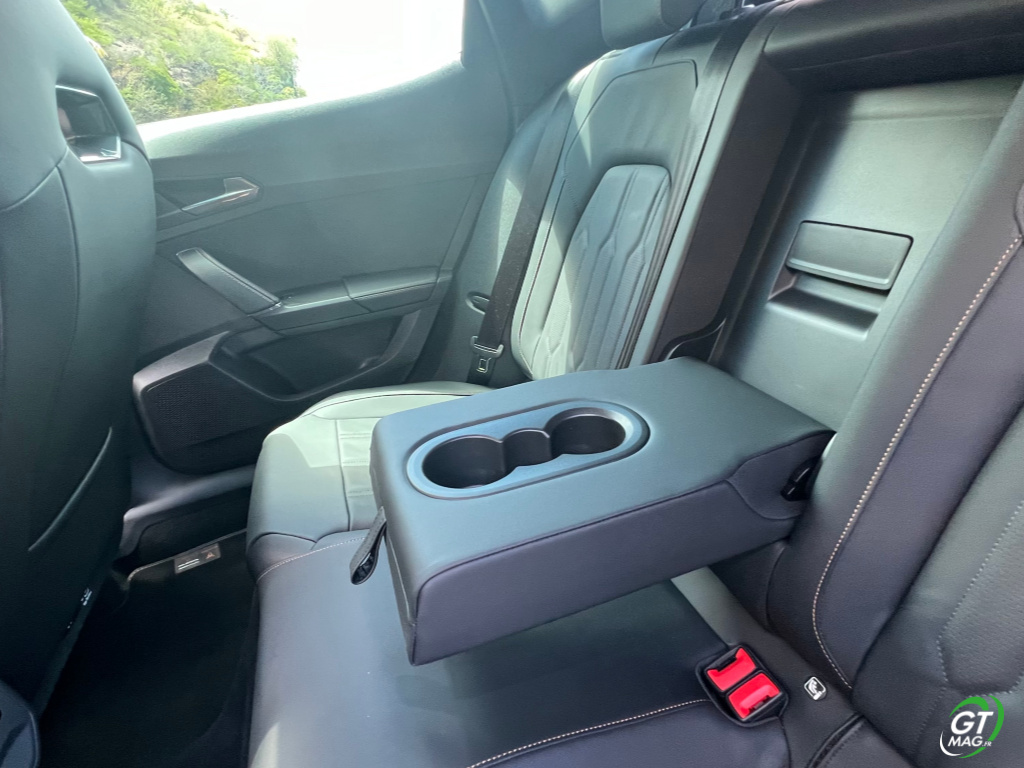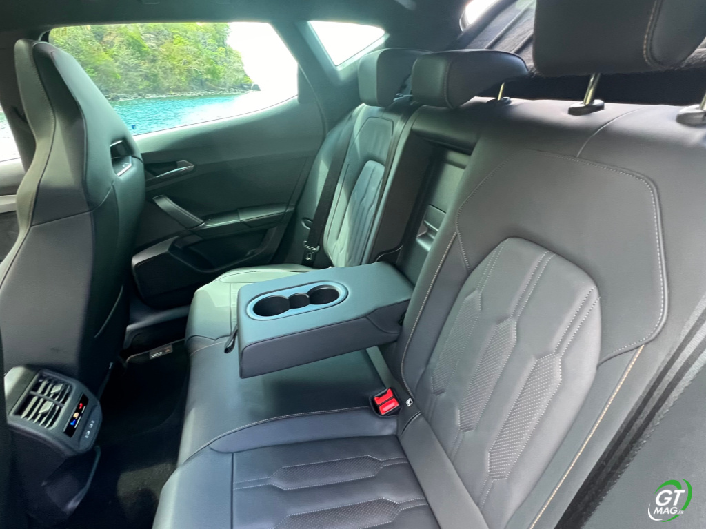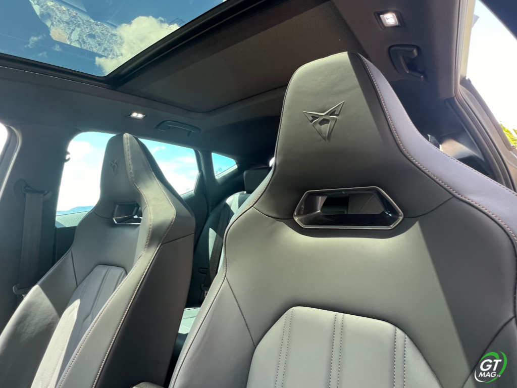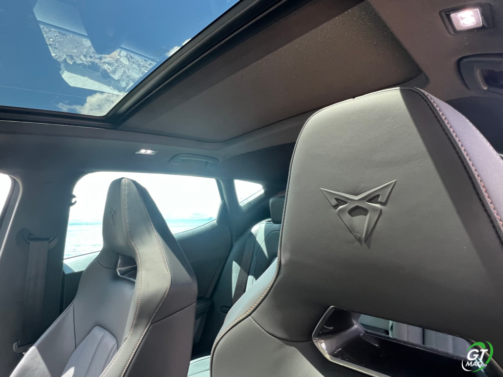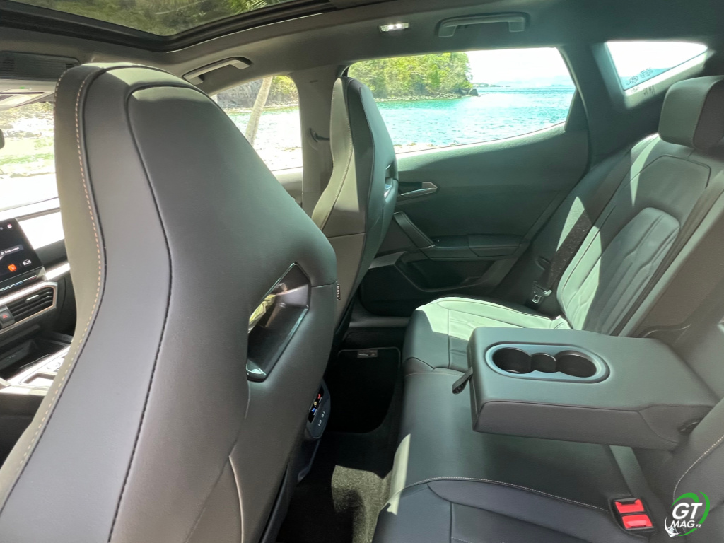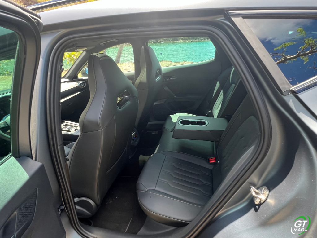 L'intérieur reflète également l'identité de Cupra avec des sièges sportifs en cuir bleu aux coutures cuivrées, un volant sport équipé de palettes de changement de vitesse, et un écran multimédia de 12 pouces. Un bouton pour désactiver les aides électroniques est également mis en avant, encourageant ainsi son utilisation ce qui est très pratique sur la route ! En ce qui concerne l'espace intérieur, malgré un toit incliné et un grand toit ouvrant, l'espace aux places arrière reste spacieux avec une bonne hauteur sous plafond. Le coffre offre un volume de 420 litres, ce qui est suffisant pour des vacances en famille et les sorties plages du dimanche !