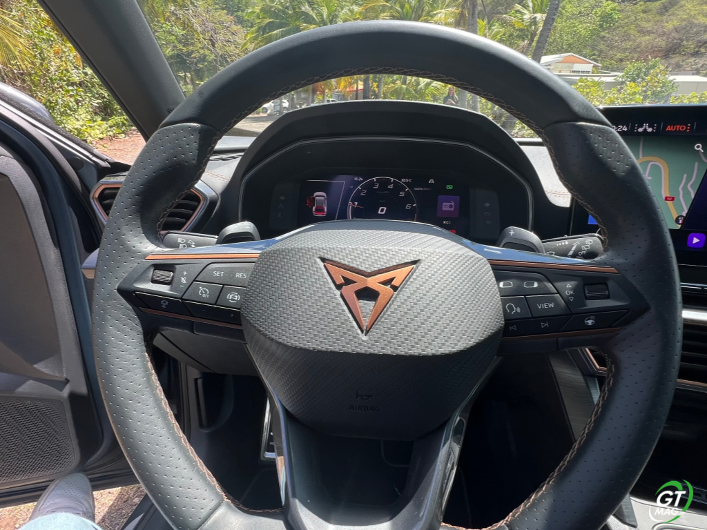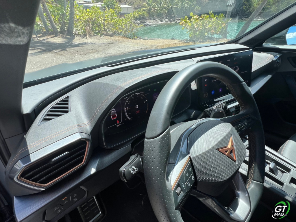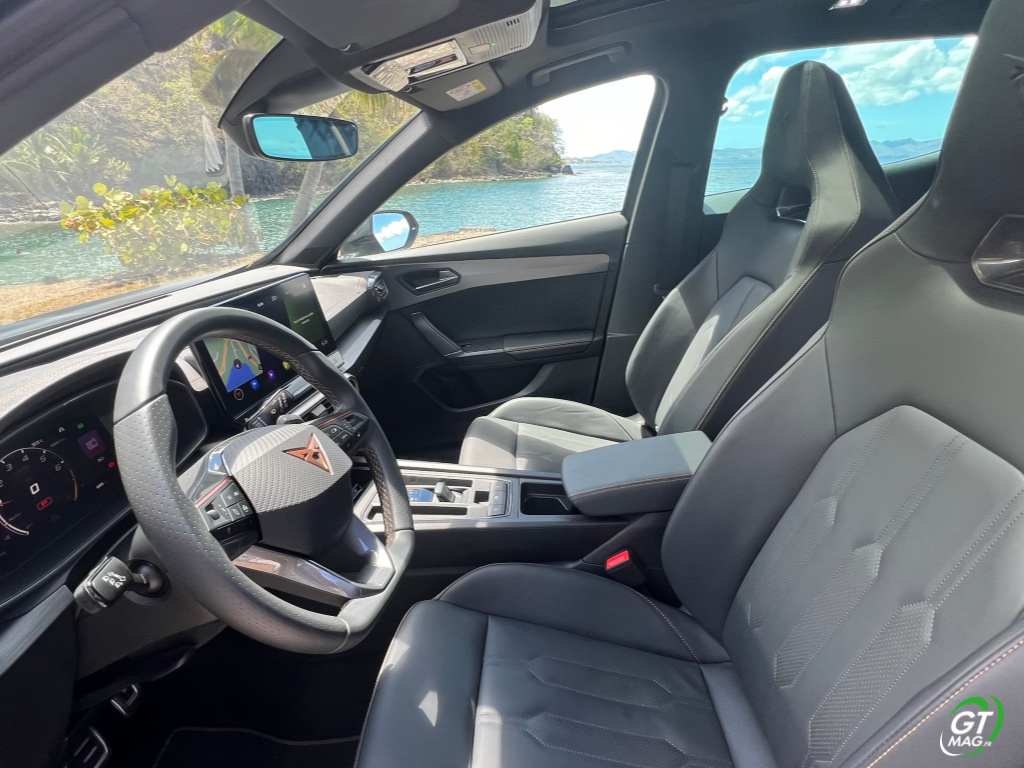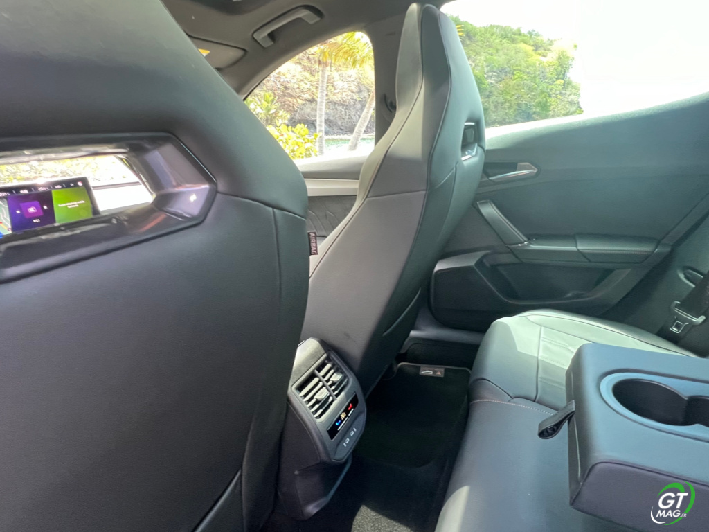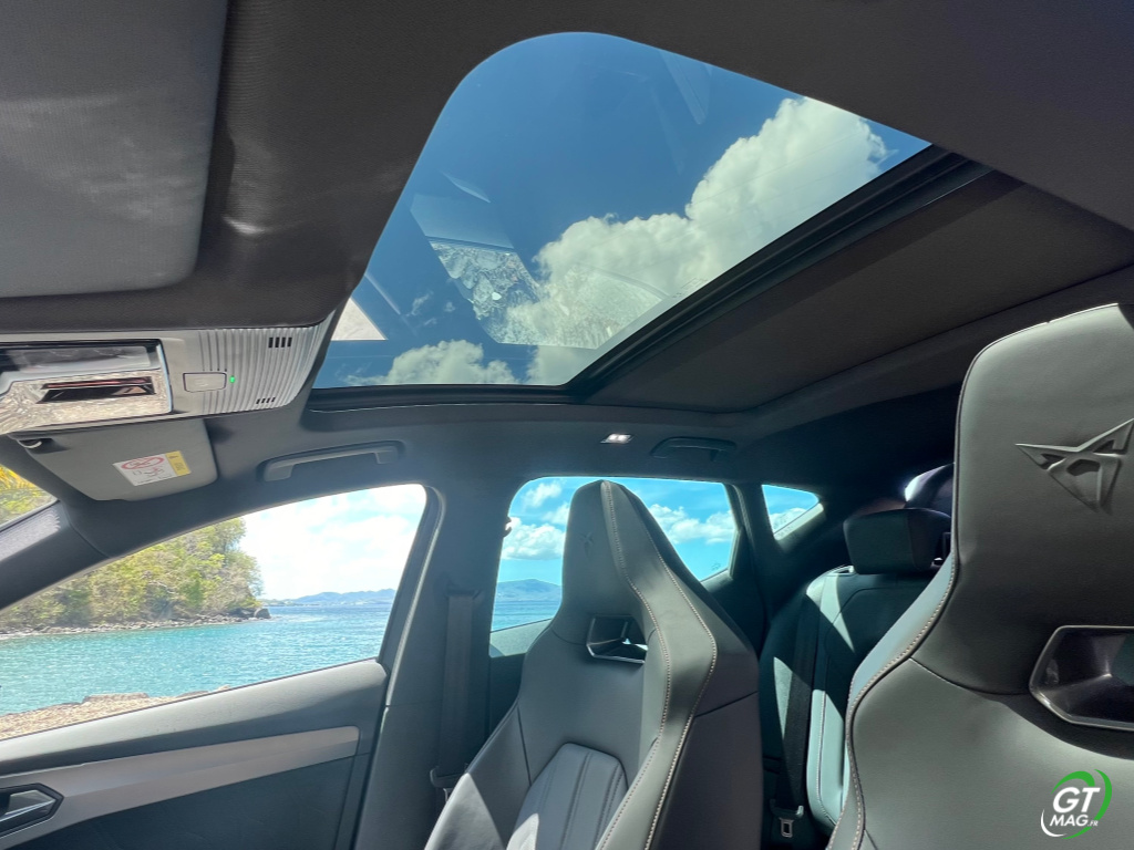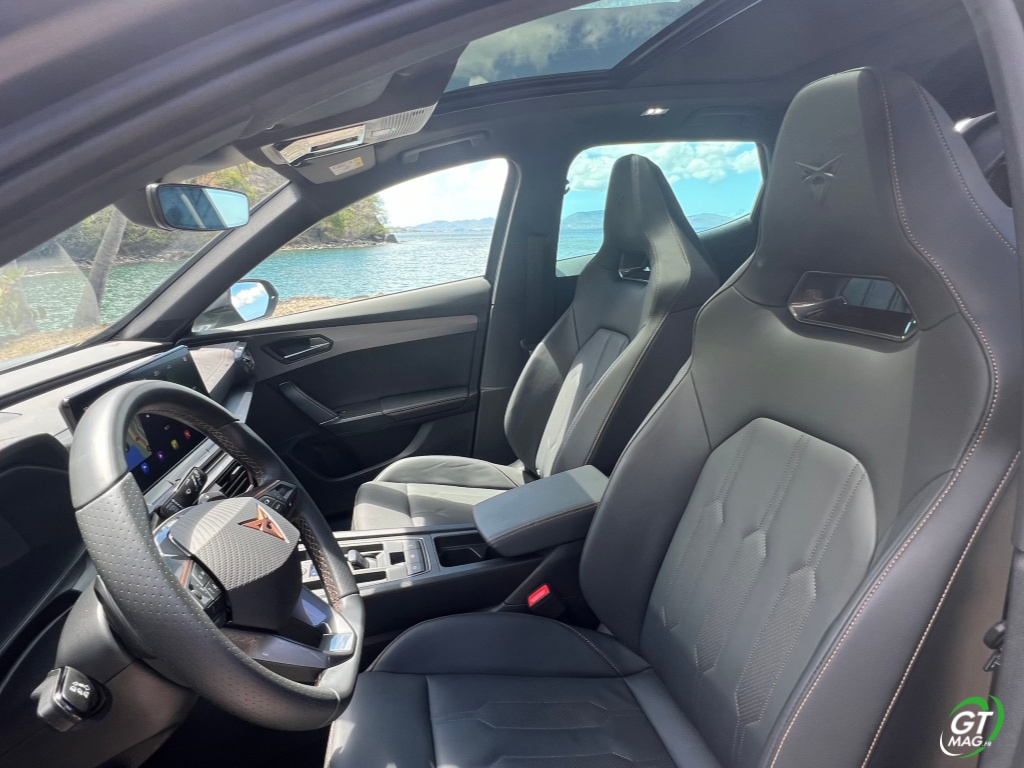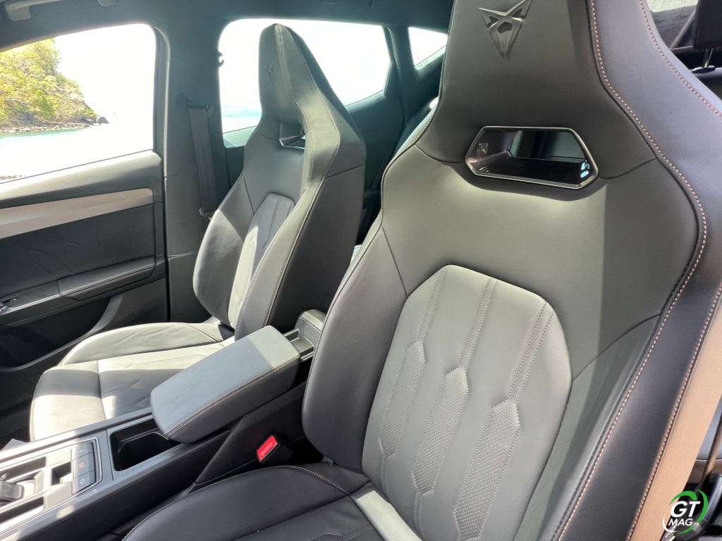 L'intérieur reflète également l'identité de Cupra avec des sièges sportifs en cuir bleu aux coutures cuivrées, un volant sport équipé de palettes de changement de vitesse, et un écran multimédia de 12 pouces. Un bouton pour désactiver les aides électroniques est également mis en avant, encourageant ainsi son utilisation ce qui est très pratique sur la route ! En ce qui concerne l'espace intérieur, malgré un toit incliné et un grand toit ouvrant, l'espace aux places arrière reste spacieux avec une bonne hauteur sous plafond. Le coffre offre un volume de 420 litres, ce qui est suffisant pour des vacances en famille et les sorties plages du dimanche !