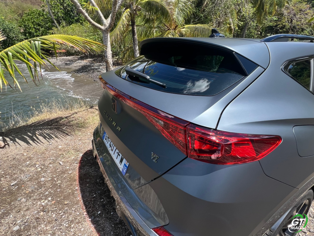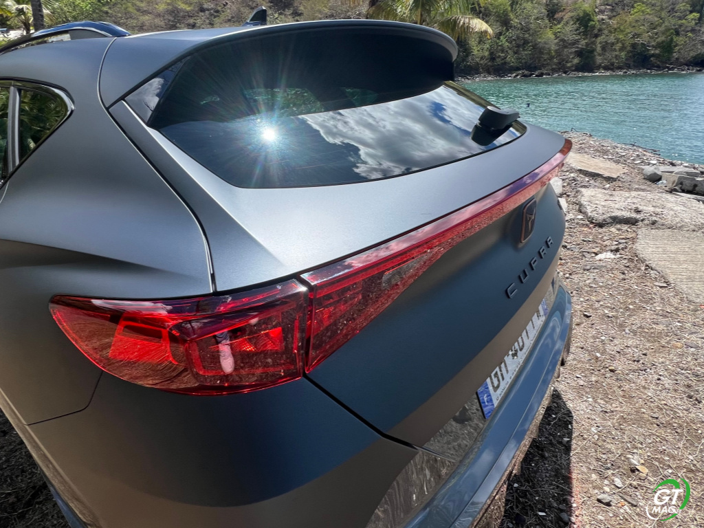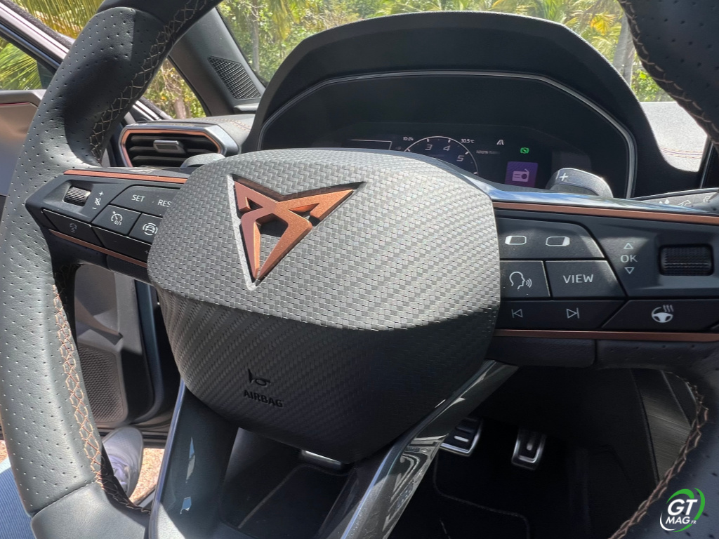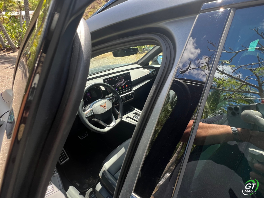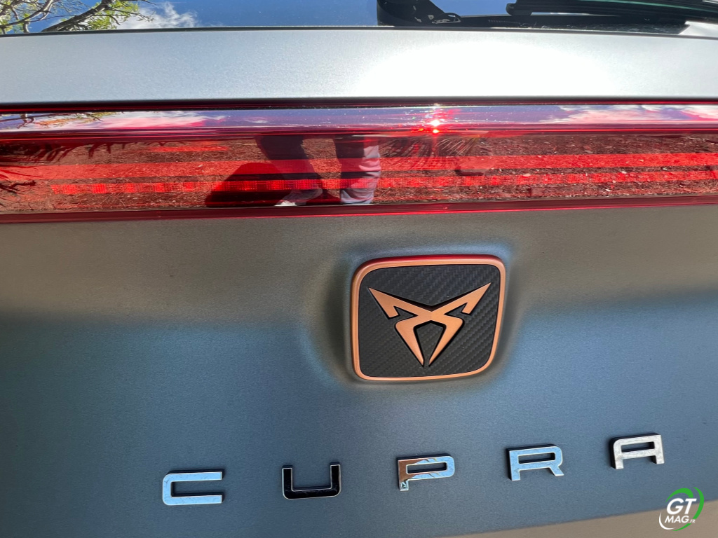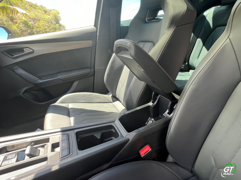 L'intérieur reflète également l'identité de Cupra avec des sièges sportifs en cuir bleu aux coutures cuivrées, un volant sport équipé de palettes de changement de vitesse, et un écran multimédia de 12 pouces. Un bouton pour désactiver les aides électroniques est également mis en avant, encourageant ainsi son utilisation ce qui est très pratique sur la route ! En ce qui concerne l'espace intérieur, malgré un toit incliné et un grand toit ouvrant, l'espace aux places arrière reste spacieux avec une bonne hauteur sous plafond. Le coffre offre un volume de 420 litres, ce qui est suffisant pour des vacances en famille et les sorties plages du dimanche !