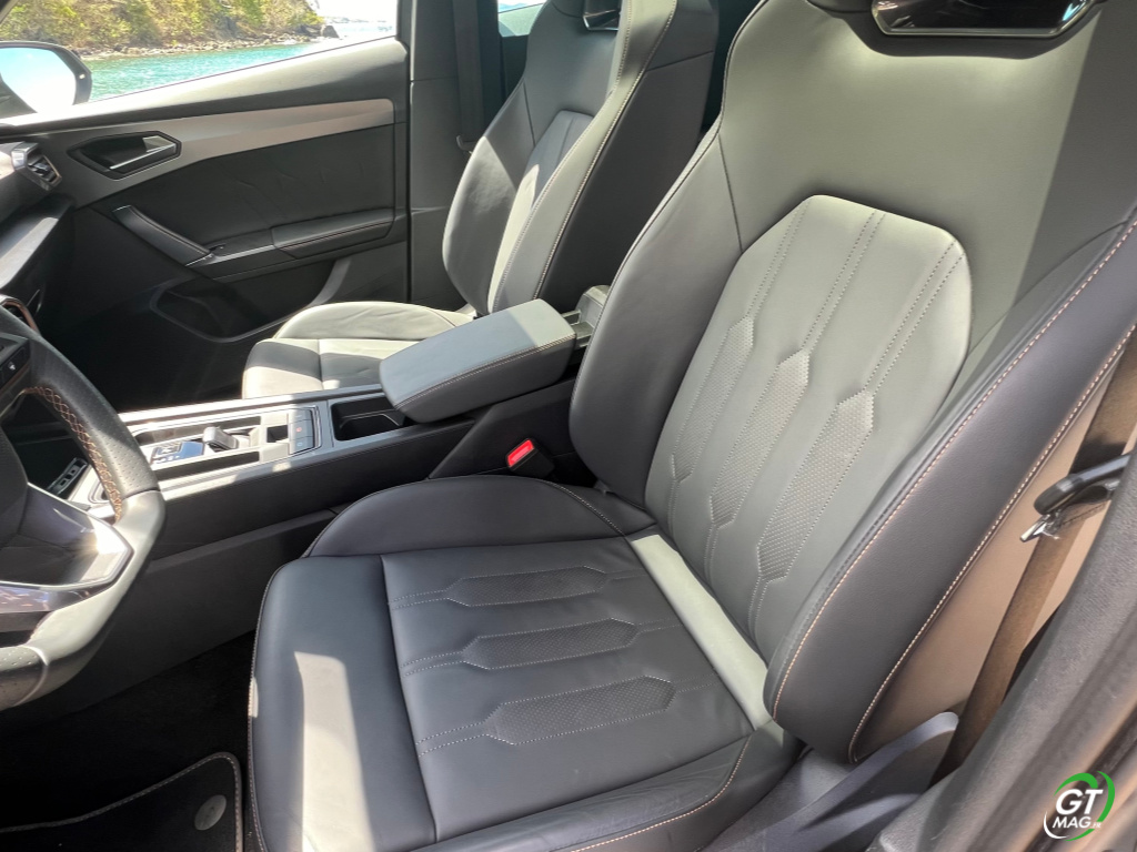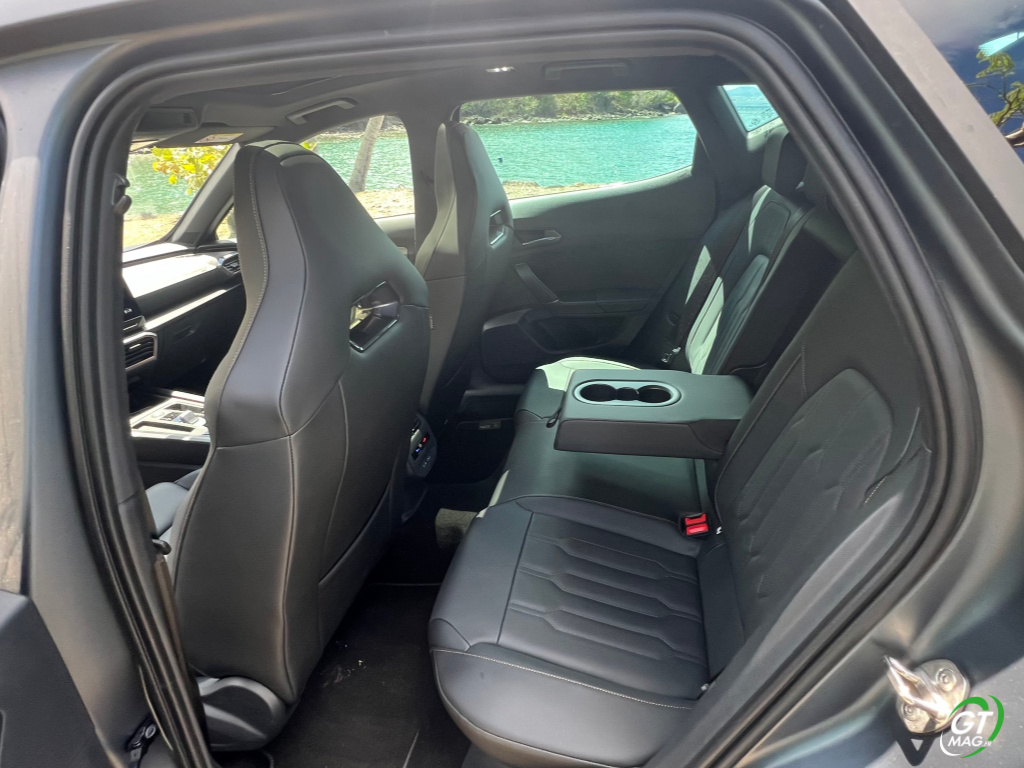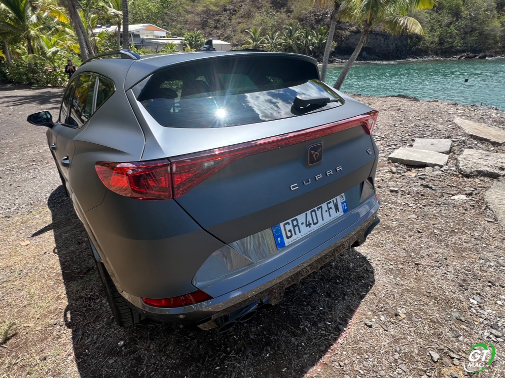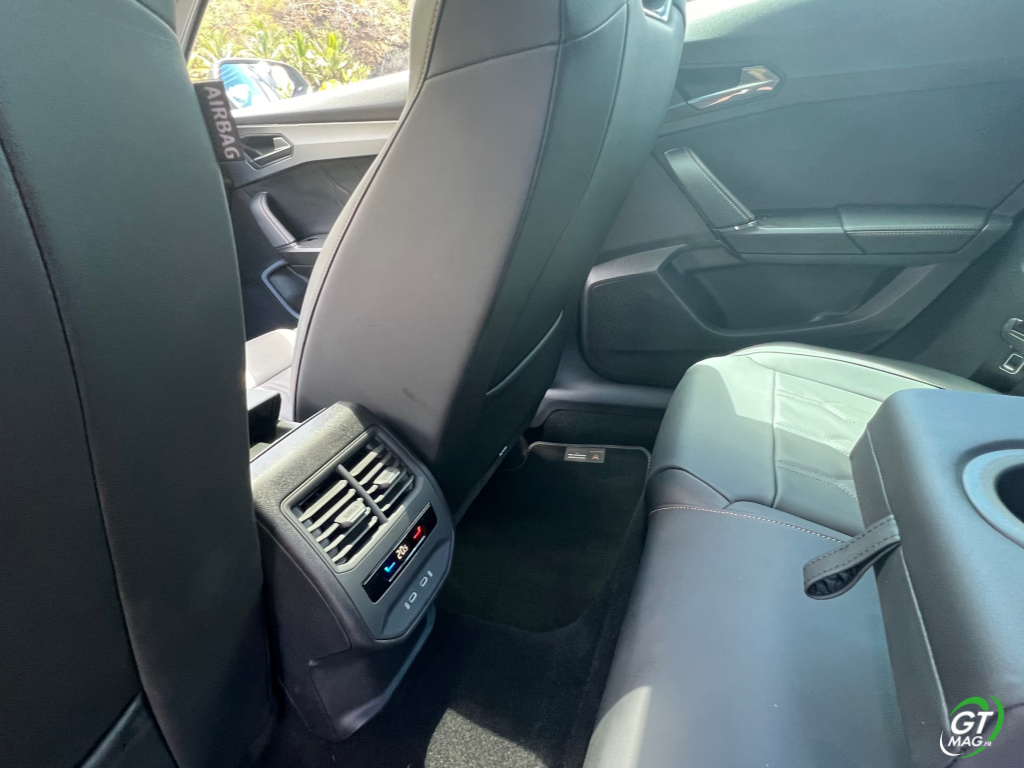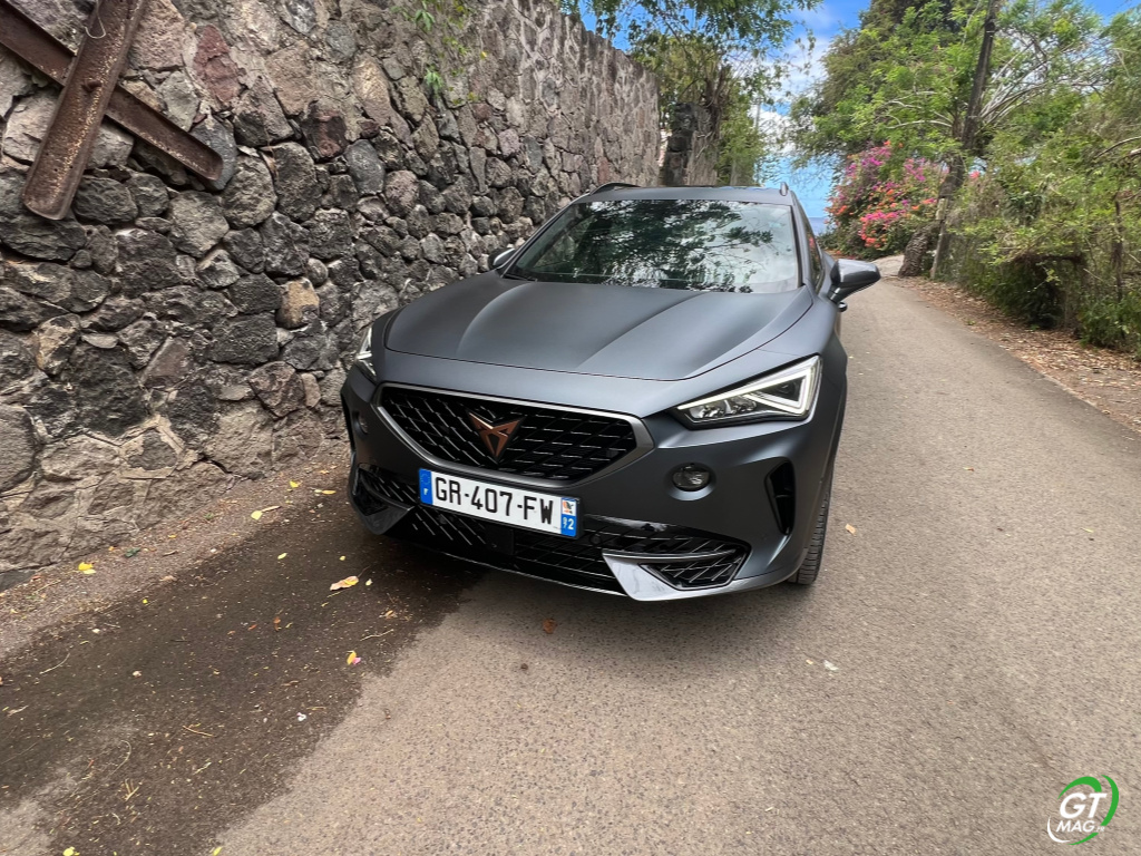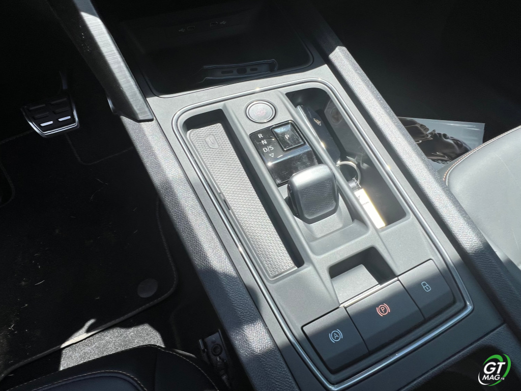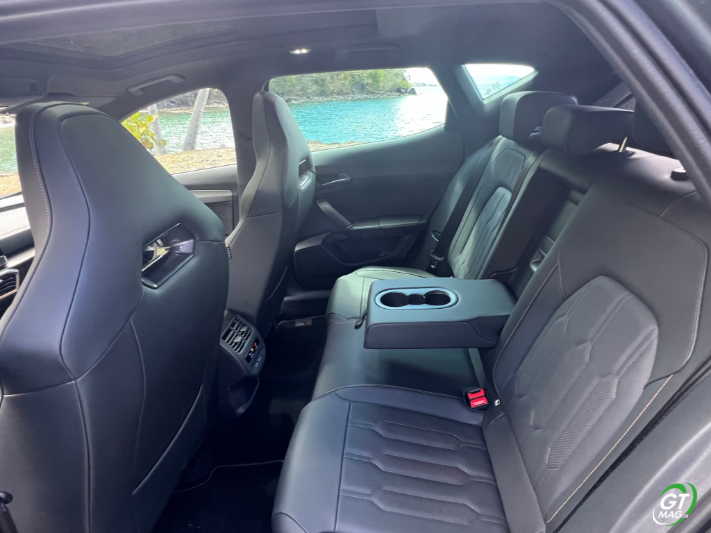 L'intérieur reflète également l'identité de Cupra avec des sièges sportifs en cuir bleu aux coutures cuivrées, un volant sport équipé de palettes de changement de vitesse, et un écran multimédia de 12 pouces. Un bouton pour désactiver les aides électroniques est également mis en avant, encourageant ainsi son utilisation ce qui est très pratique sur la route ! En ce qui concerne l'espace intérieur, malgré un toit incliné et un grand toit ouvrant, l'espace aux places arrière reste spacieux avec une bonne hauteur sous plafond. Le coffre offre un volume de 420 litres, ce qui est suffisant pour des vacances en famille et les sorties plages du dimanche !