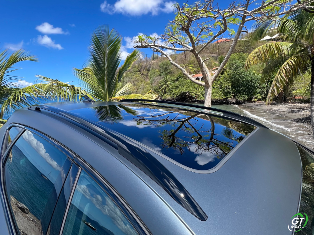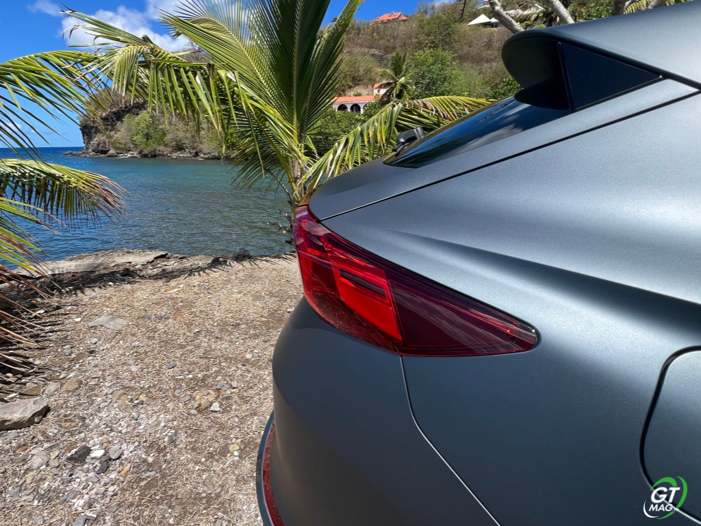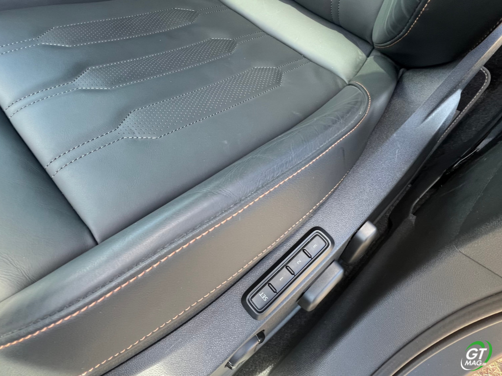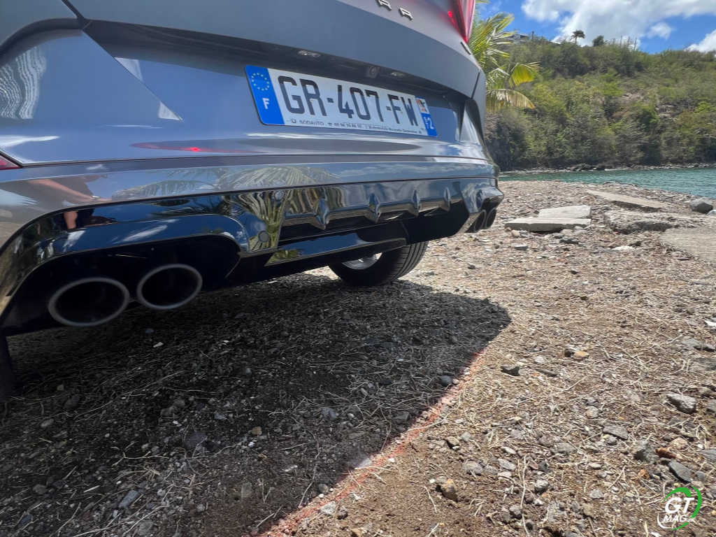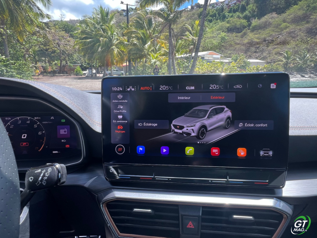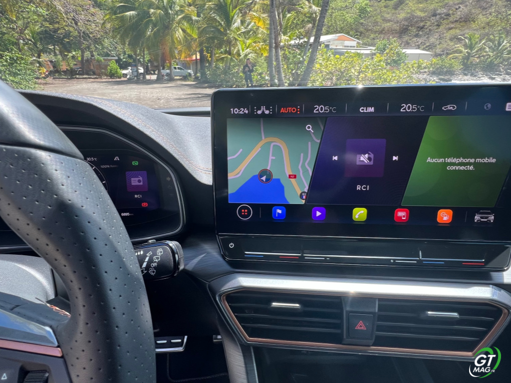 L'intérieur reflète également l'identité de Cupra avec des sièges sportifs en cuir bleu aux coutures cuivrées, un volant sport équipé de palettes de changement de vitesse, et un écran multimédia de 12 pouces. Un bouton pour désactiver les aides électroniques est également mis en avant, encourageant ainsi son utilisation ce qui est très pratique sur la route ! En ce qui concerne l'espace intérieur, malgré un toit incliné et un grand toit ouvrant, l'espace aux places arrière reste spacieux avec une bonne hauteur sous plafond. Le coffre offre un volume de 420 litres, ce qui est suffisant pour des vacances en famille et les sorties plages du dimanche !