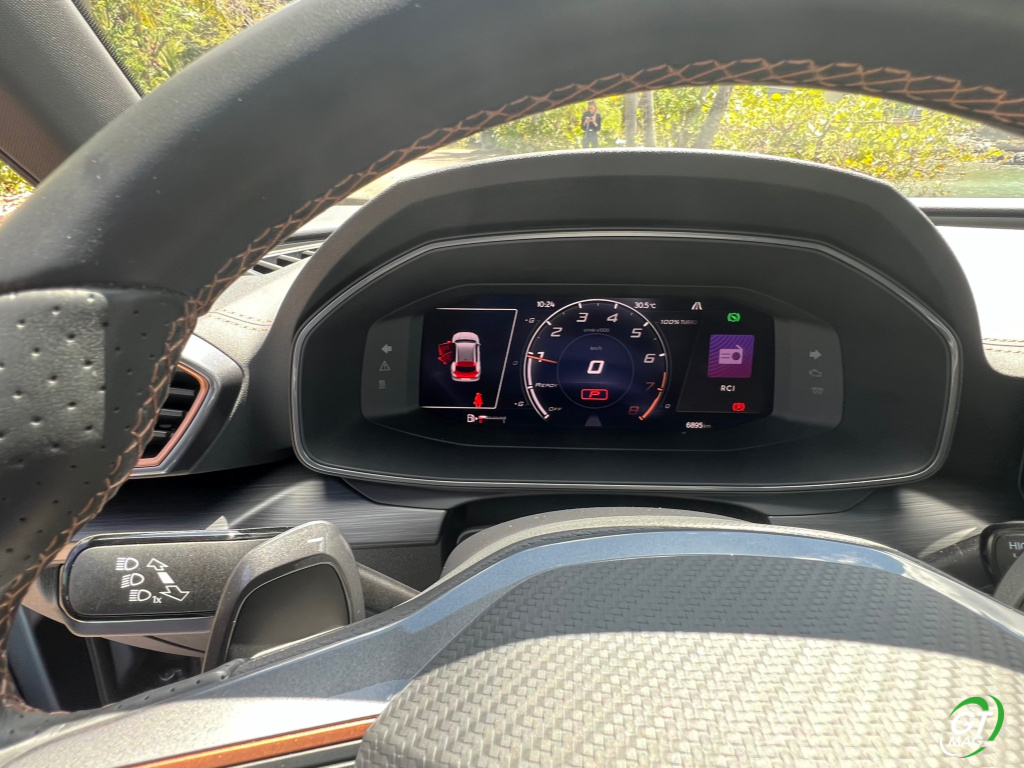 En activant le mode Cupra via une pression prolongée sur le sélecteur de modes au volant, la voiture adopte une allure modérée et le son discret du moteur quatre cylindres devient nettement plus rauque. Rien n'est cassé ; le mode Cupra ajuste non seulement la direction et la suspension, mais aussi la réactivité de l'accélérateur et la boîte DSG, en plus d'activer une sonorité moteur artificielle via les haut-parleurs pour imiter un V8. C'est divertissant, surtout pour les enfants, bien que le son ne soit pas très convaincant. Heureusement, il peut être désactivé mais j’ai envie de dire … à vous de voir !