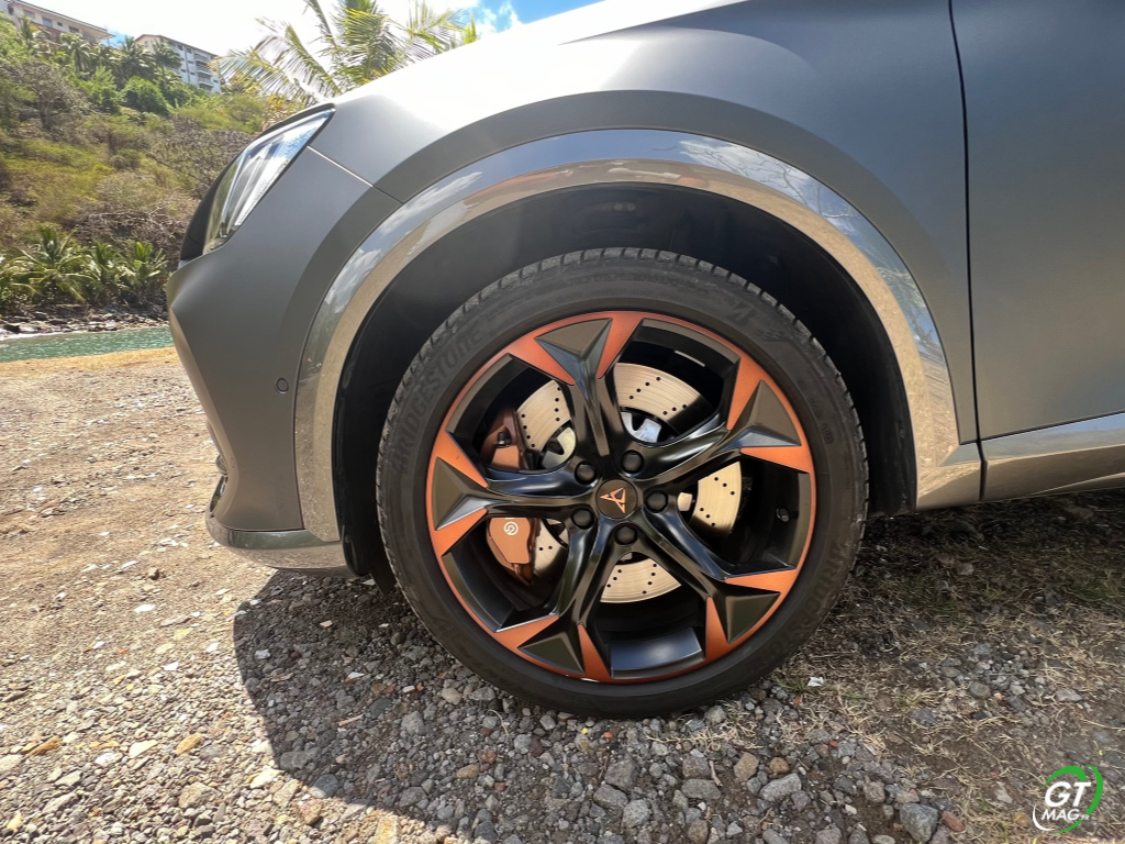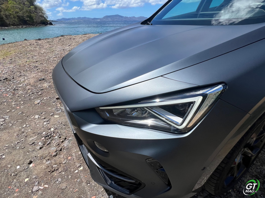 Le Formentor 310 TSI 310ch DSG7 de notre essai a été conçu pour une performance dynamique sans compromis. Son design agressif avec un long capot, un toit incliné et quatre sorties d’échappement exprime clairement cette orientation. Les finitions haut de gamme incluent des options de peinture mate et des jantes en couleur cuivre, typiques de la marque !