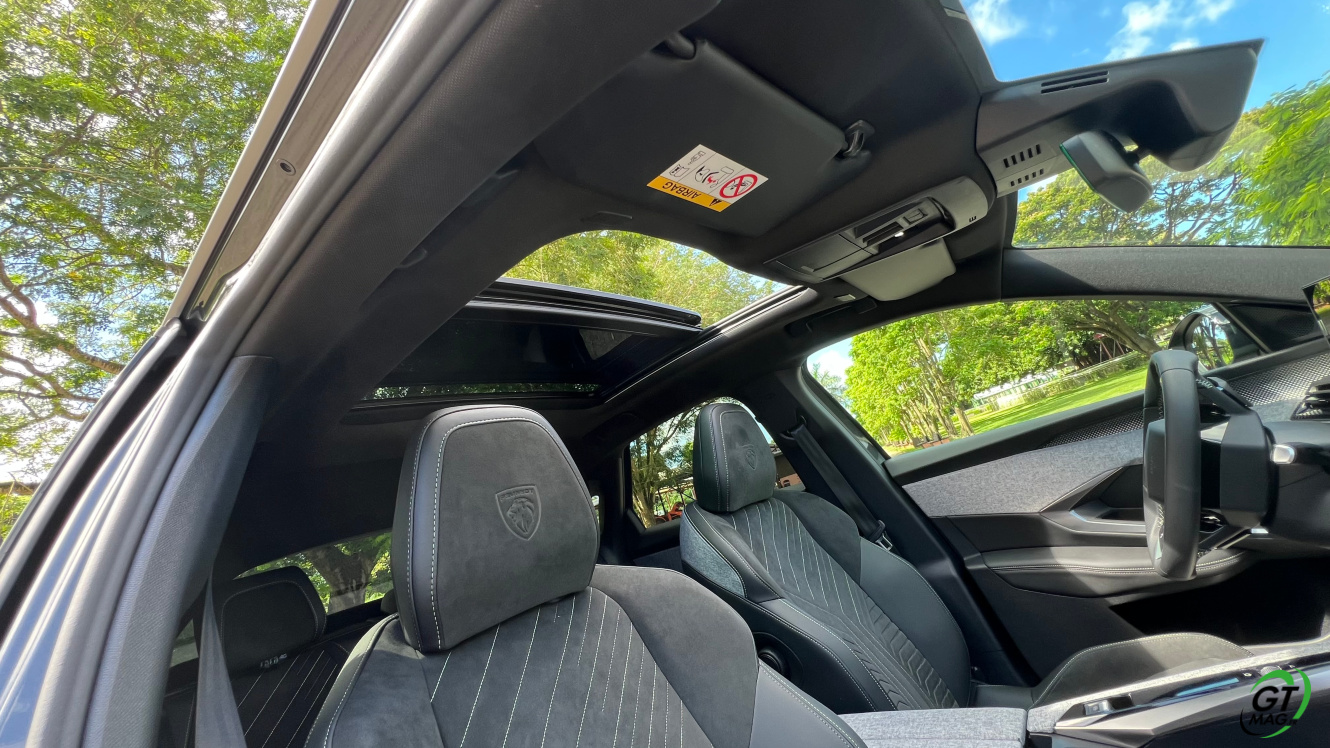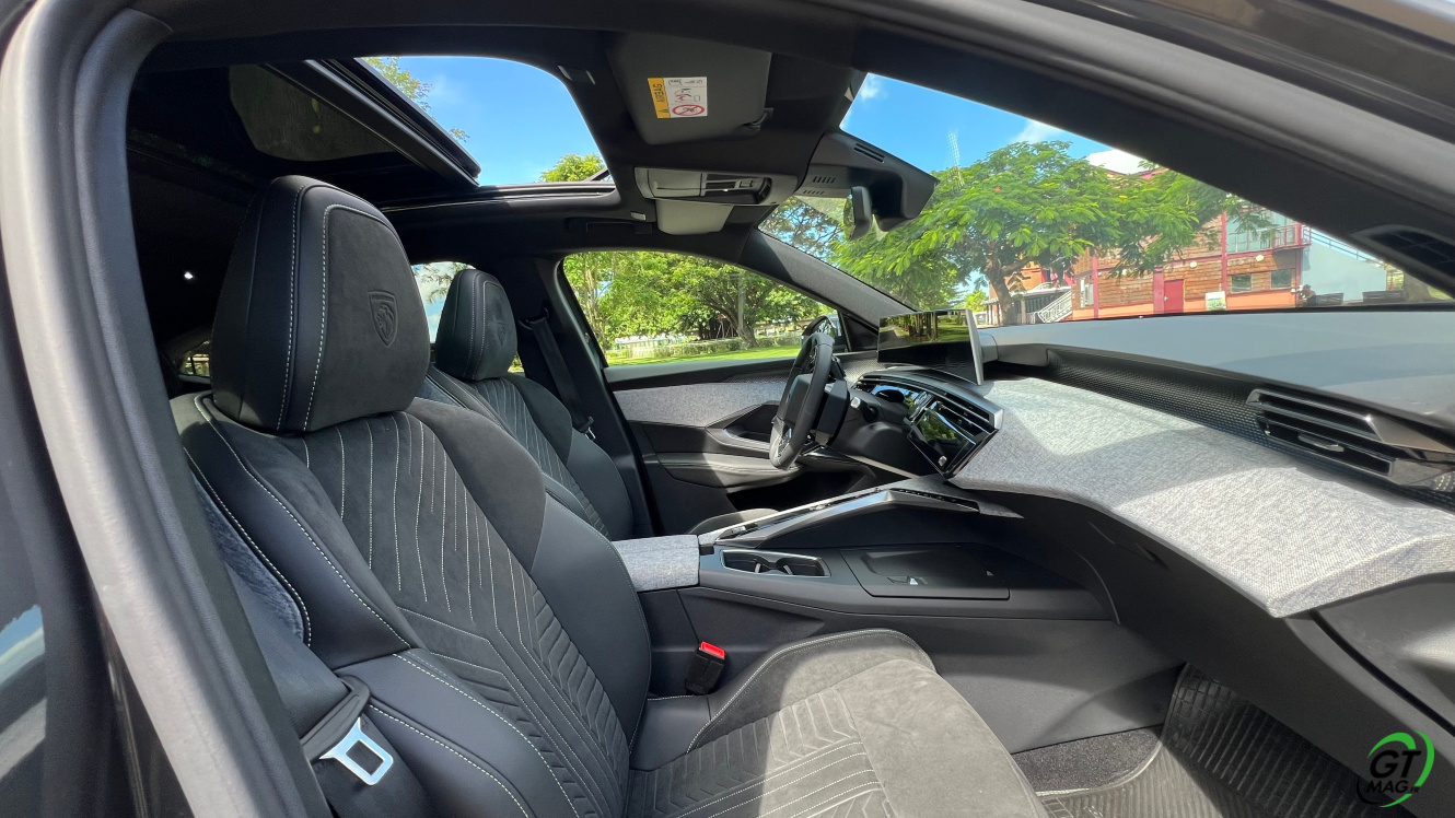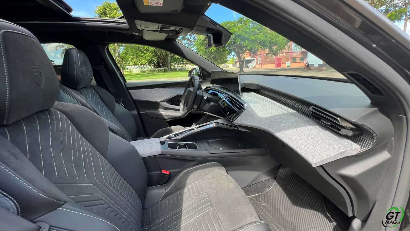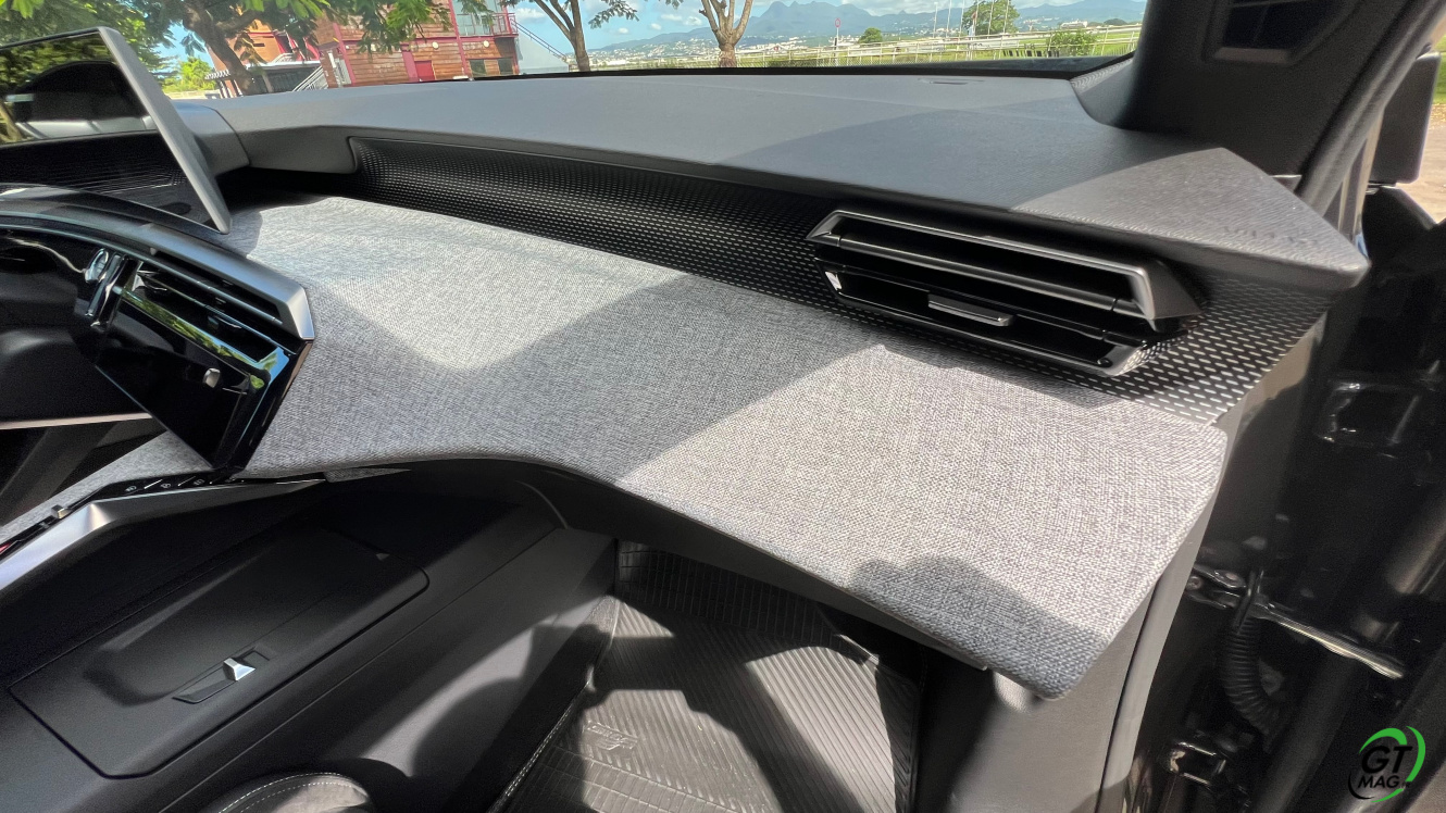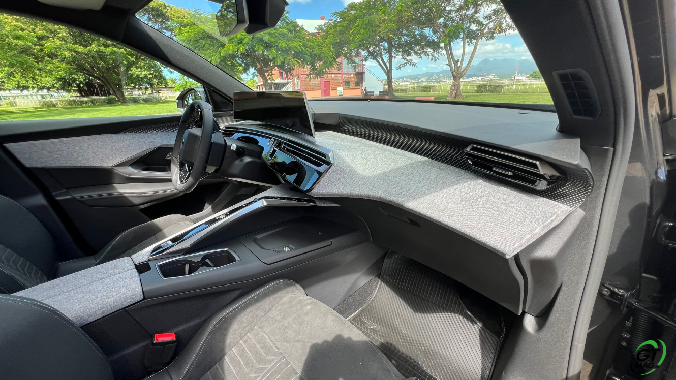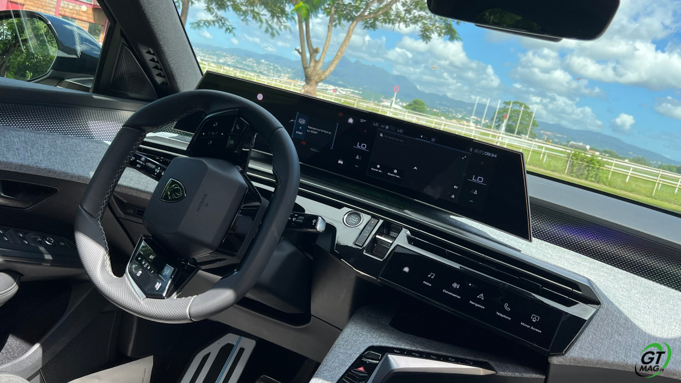Dans cette version l'i-Cockpit évolue et se nomme désormais « Panoramic i-Cockpit » ici en vidéo, chaque fonction ou presque a droit à un bouton dédié. L'écran d'info-divertissement sur la planche de bord s’étale façon écran incurvé, et la commande de la boîte de vitesses automatique est située au pied de la console centrale. Le nouveau petit volant à double méplat est agréable à prendre en mains l'habitacle est indiscutablement plus moderne. On relève donc la présence de la grande dalle numérique de 21 pouces sur la finition GT comme celle de notre essai de ce matin en Martinique, qui sera remplacée par deux de 10 pouces sur la finition d'entrée de gamme Allure.