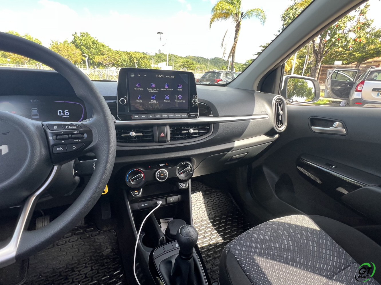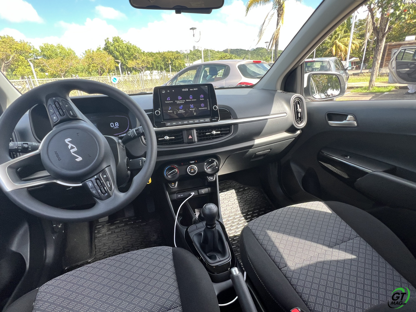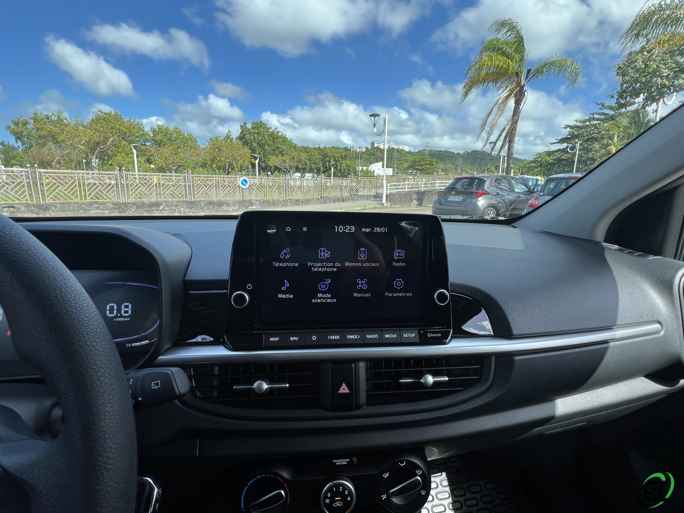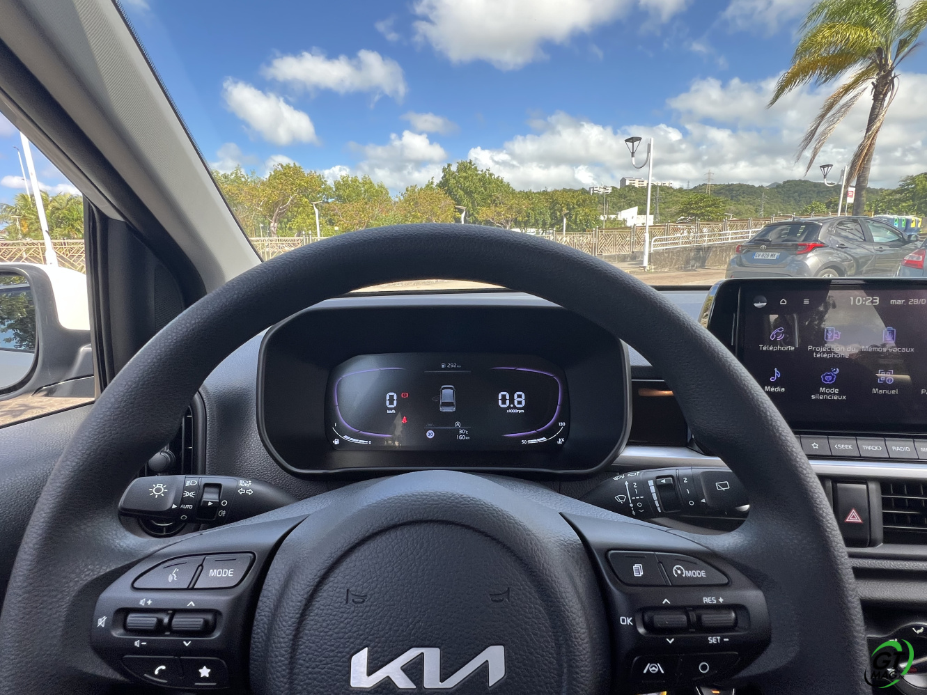 La nouvelle Picanto passe aussi à la norme Euro6e pour ses moteurs, ce qui se traduit par une légère perte de puissance. De fait 2 moteurs au menu un 3 cylindres de 1l et 63ch et le 4-cylindres de notre voiture d’essai de ce matin en Martinique qui nous propose 79 ch, sans turbo. D’entrée de jeu je vous l’annonce dans nos bourgs et nos villes pas de soucis majeurs mais ne comptez pas faire des entrées fulgurantes sur notre rocade ou faire des dépassements dans la montée de Case-Pilote… Cela étant, sa vocation finalement n’est-elle pas de danser agilement entre nos immeubles et nos zones commerciales ? Son très bon rayon de braquage va l’y aider aisément…
