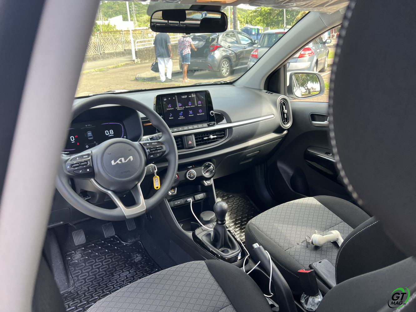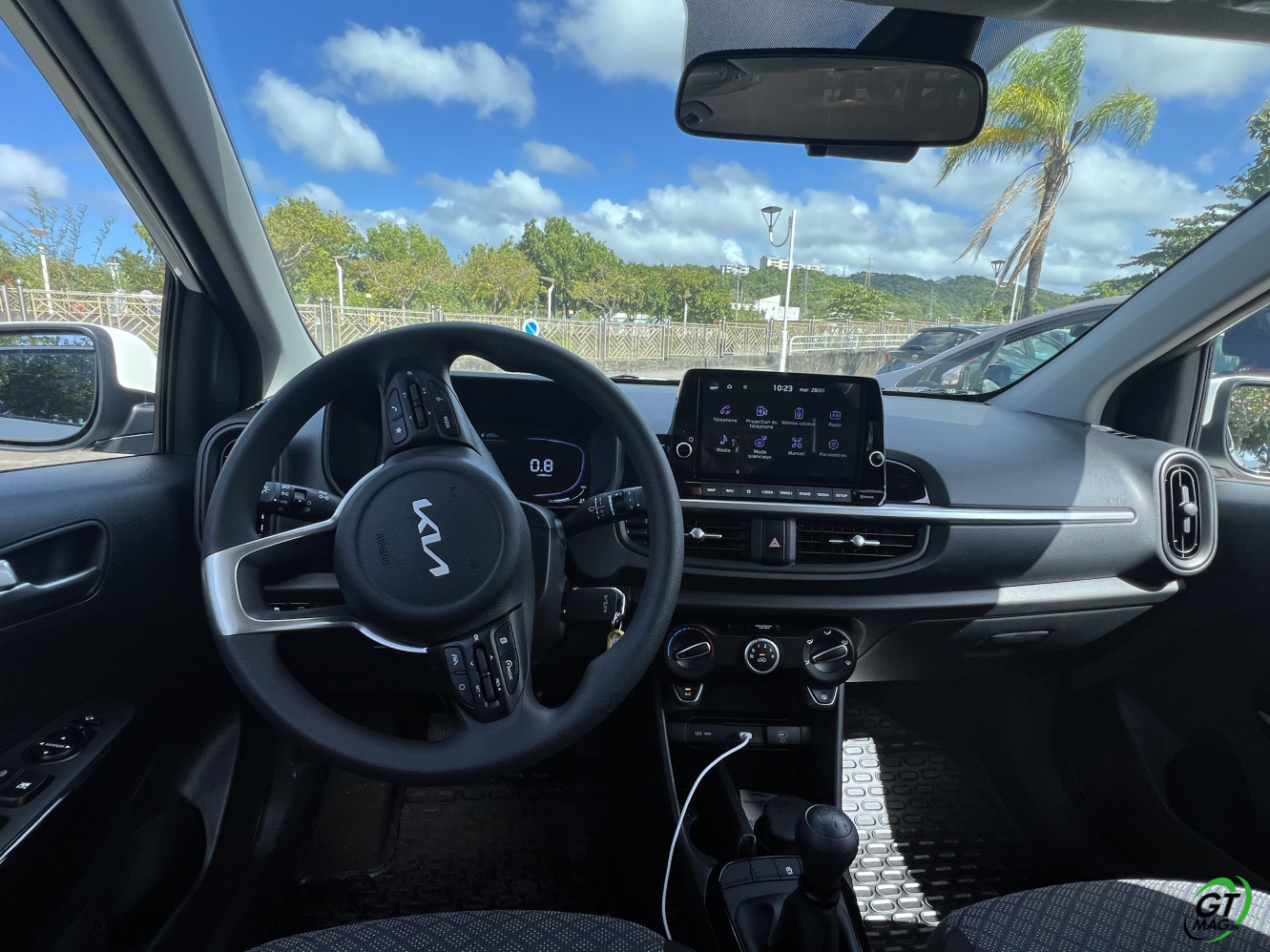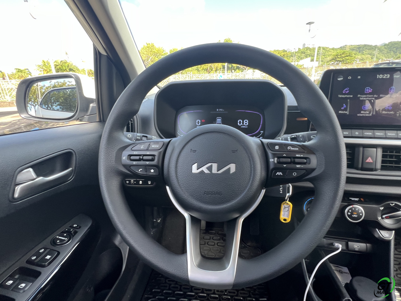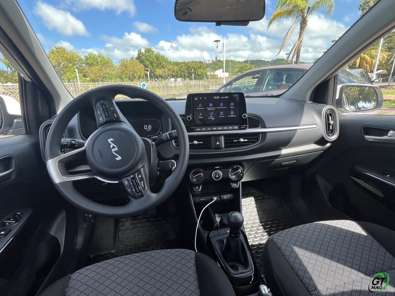 La nouvelle Picanto passe aussi à la norme Euro6e pour ses moteurs, ce qui se traduit par une légère perte de puissance. De fait 2 moteurs au menu un 3 cylindres de 1l et 63ch et le 4-cylindres de notre voiture d’essai de ce matin en Martinique qui nous propose 79 ch, sans turbo. D’entrée de jeu je vous l’annonce dans nos bourgs et nos villes pas de soucis majeurs mais ne comptez pas faire des entrées fulgurantes sur notre rocade ou faire des dépassements dans la montée de Case-Pilote… Cela étant, sa vocation finalement n’est-elle pas de danser agilement entre nos immeubles et nos zones commerciales ? Son très bon rayon de braquage va l’y aider aisément…