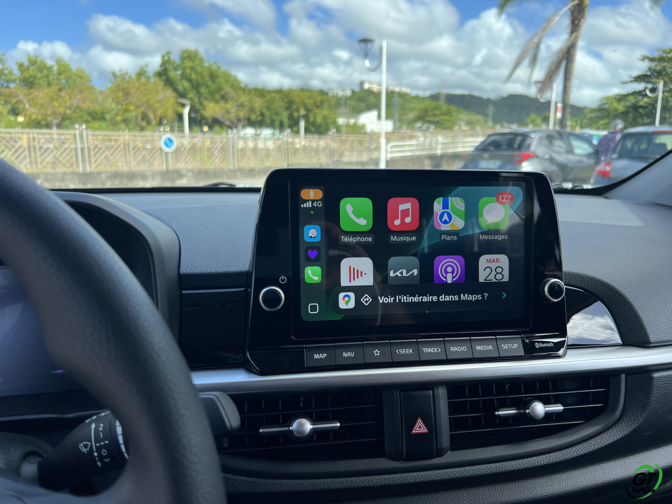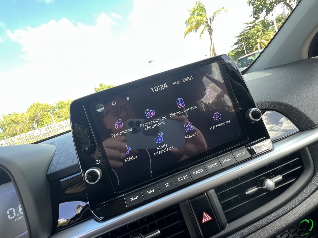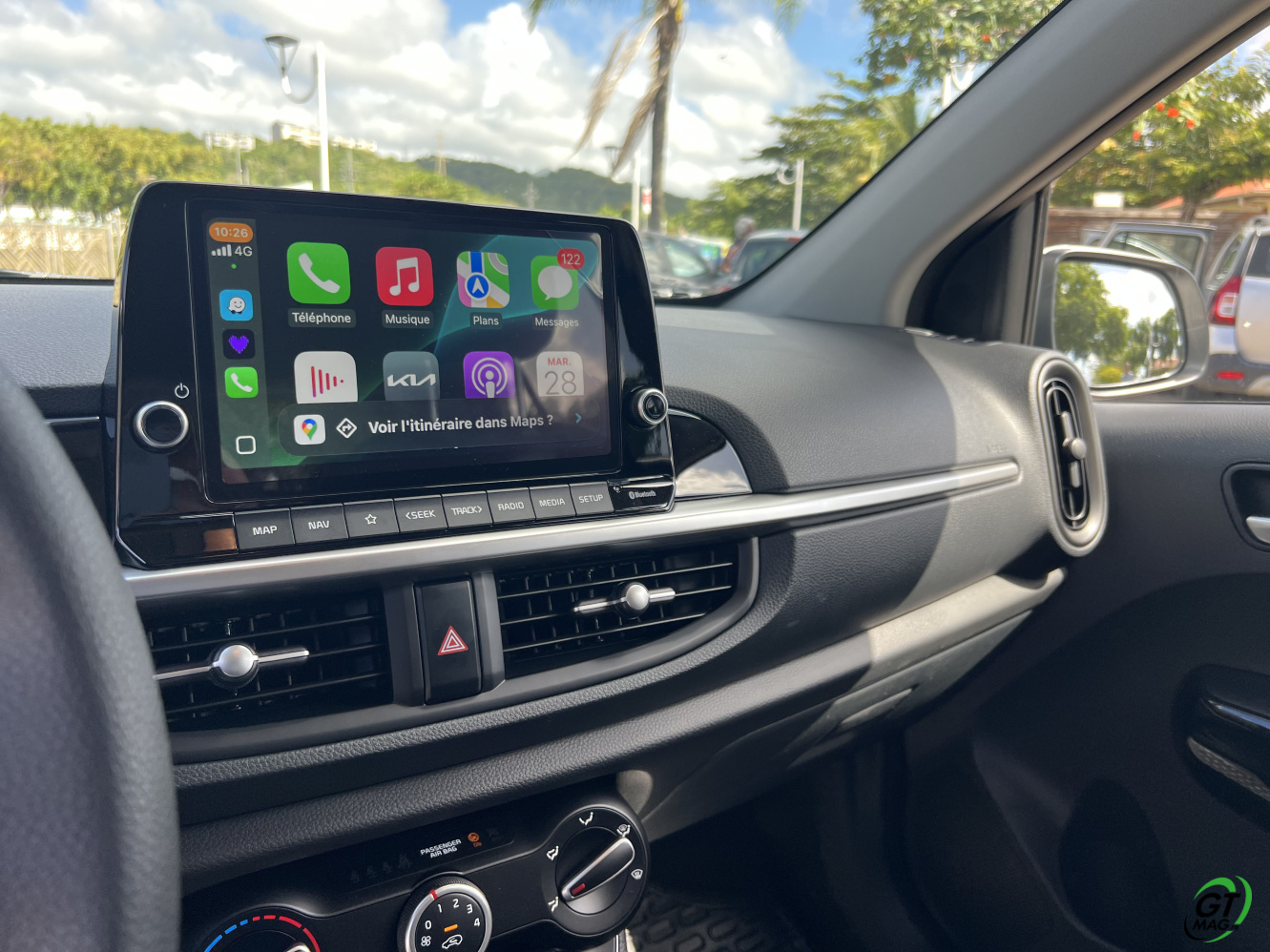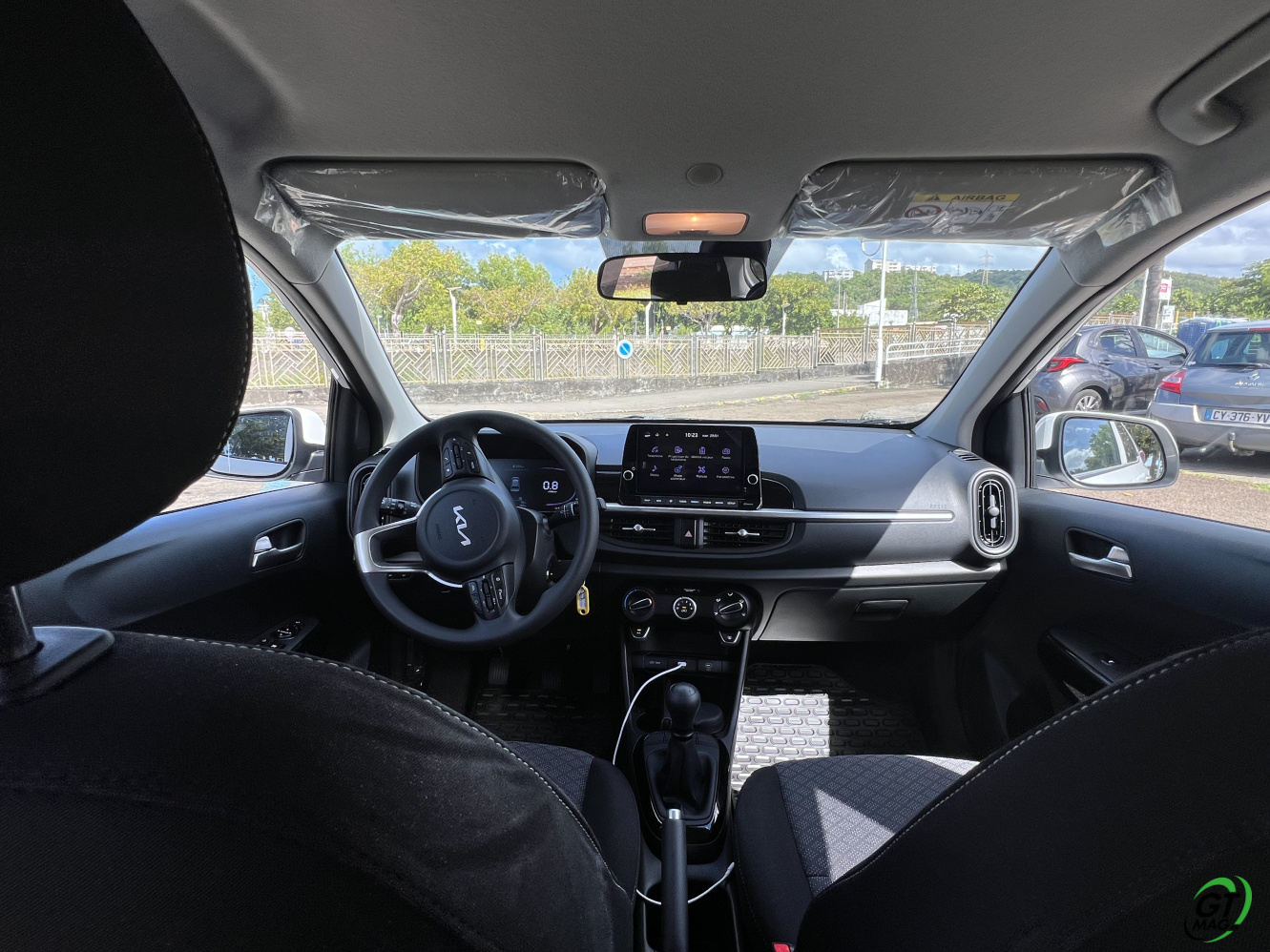 La nouvelle Picanto passe aussi à la norme Euro6e pour ses moteurs, ce qui se traduit par une légère perte de puissance. De fait 2 moteurs au menu un 3 cylindres de 1l et 63ch et le 4-cylindres de notre voiture d’essai de ce matin en Martinique qui nous propose 79 ch, sans turbo. D’entrée de jeu je vous l’annonce dans nos bourgs et nos villes pas de soucis majeurs mais ne comptez pas faire des entrées fulgurantes sur notre rocade ou faire des dépassements dans la montée de Case-Pilote… Cela étant, sa vocation finalement n’est-elle pas de danser agilement entre nos immeubles et nos zones commerciales ? Son très bon rayon de braquage va l’y aider aisément…