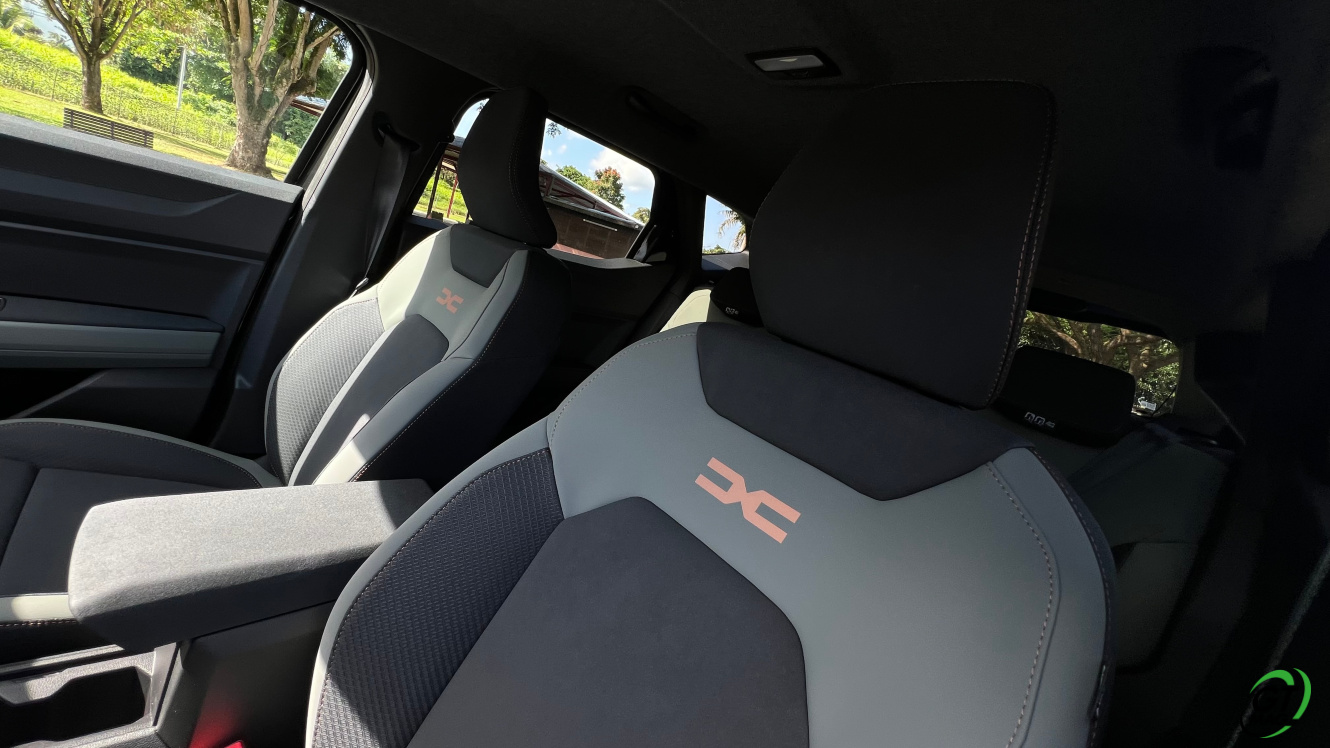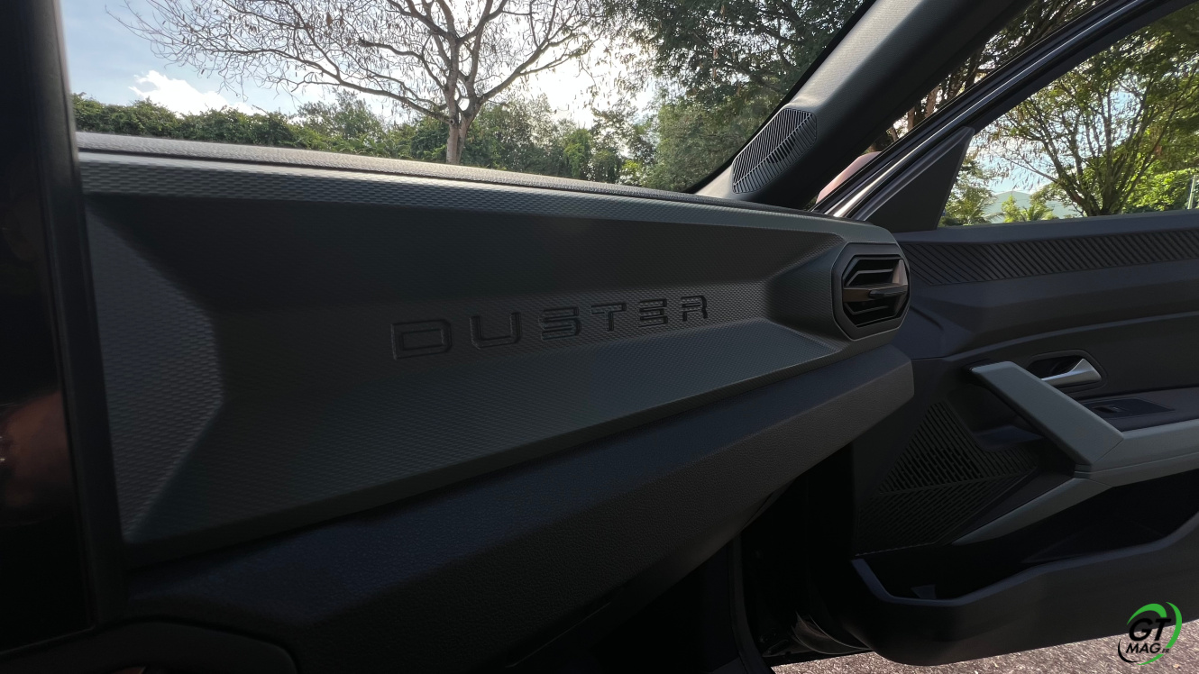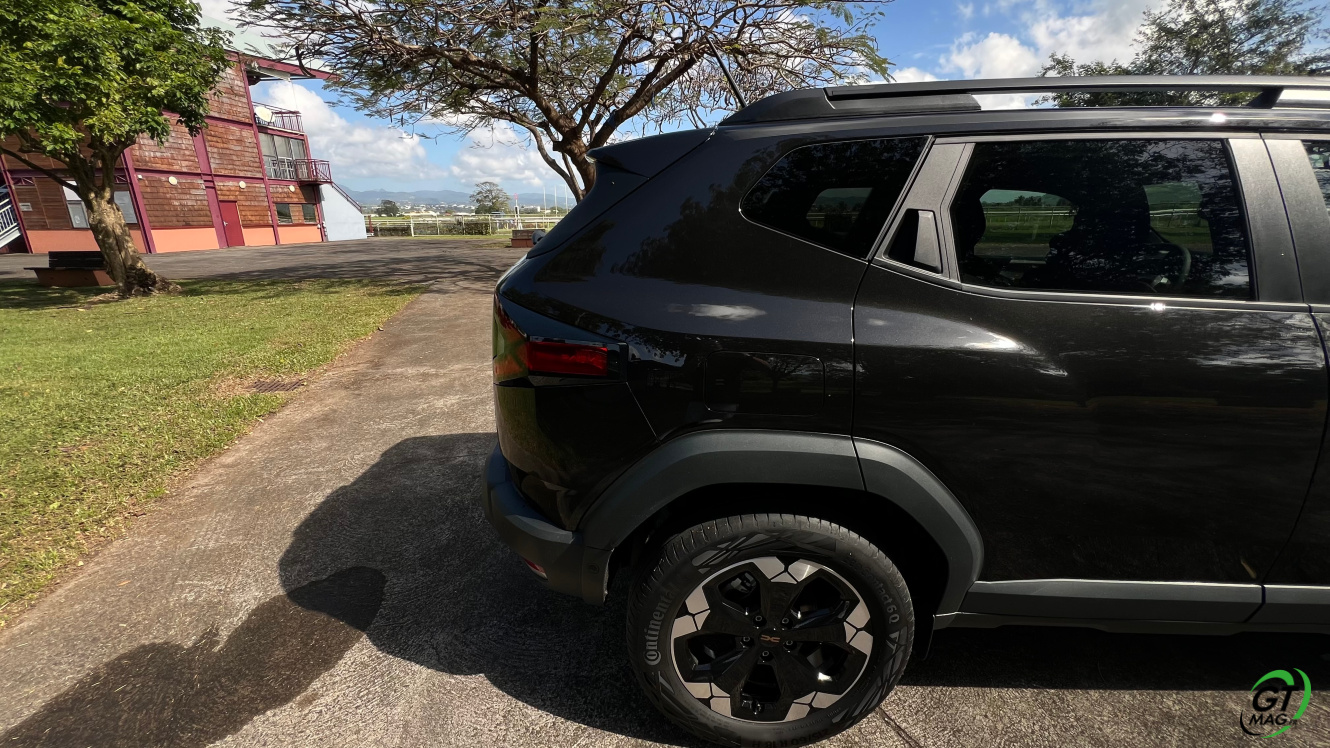 Les plastics viennent entourés les passages de roues entre-autre là encore une codification d’un digne candidat à l’exploration de nos chemins laborieux de bord de mer…  Attention le Dacia Duster affiche son côté écolo, en effet, les éléments en plastique apparent comprennent jusqu’à 20% de matière issue du recyclage. « Un taux bien plus élevé que la concurrence », affirme la marque. Ce matériau innovant se nomme « Starkle ». Et inhabituel, le logo « recyclé » vient le rappeler sur ses portières … Autres éléments de distinctions sur notre version EXTREME les éléments à l’aspect cuivrés sur les coques des rétroviseurs extérieurs et le logo à l’arrière du véhicule… Le nouveau Duster s’étire que de 2 mm en longueur (4,343 m), 9 mm en largeur (1,813 m) et perd 3,7 cm en hauteur (1,656 m). Enfin le nouveau Duster repose désormais sur la plate-forme CMF-B de l’Alliance, principalement destinée à accueillir des mécaniques hybrides et électriques. Cette plate-forme permet par ailleurs au Duster d’offrir un surcroit d’habitabilité par rapport à la génération précédente ainsi qu’un coffre un plus grand (444 L).