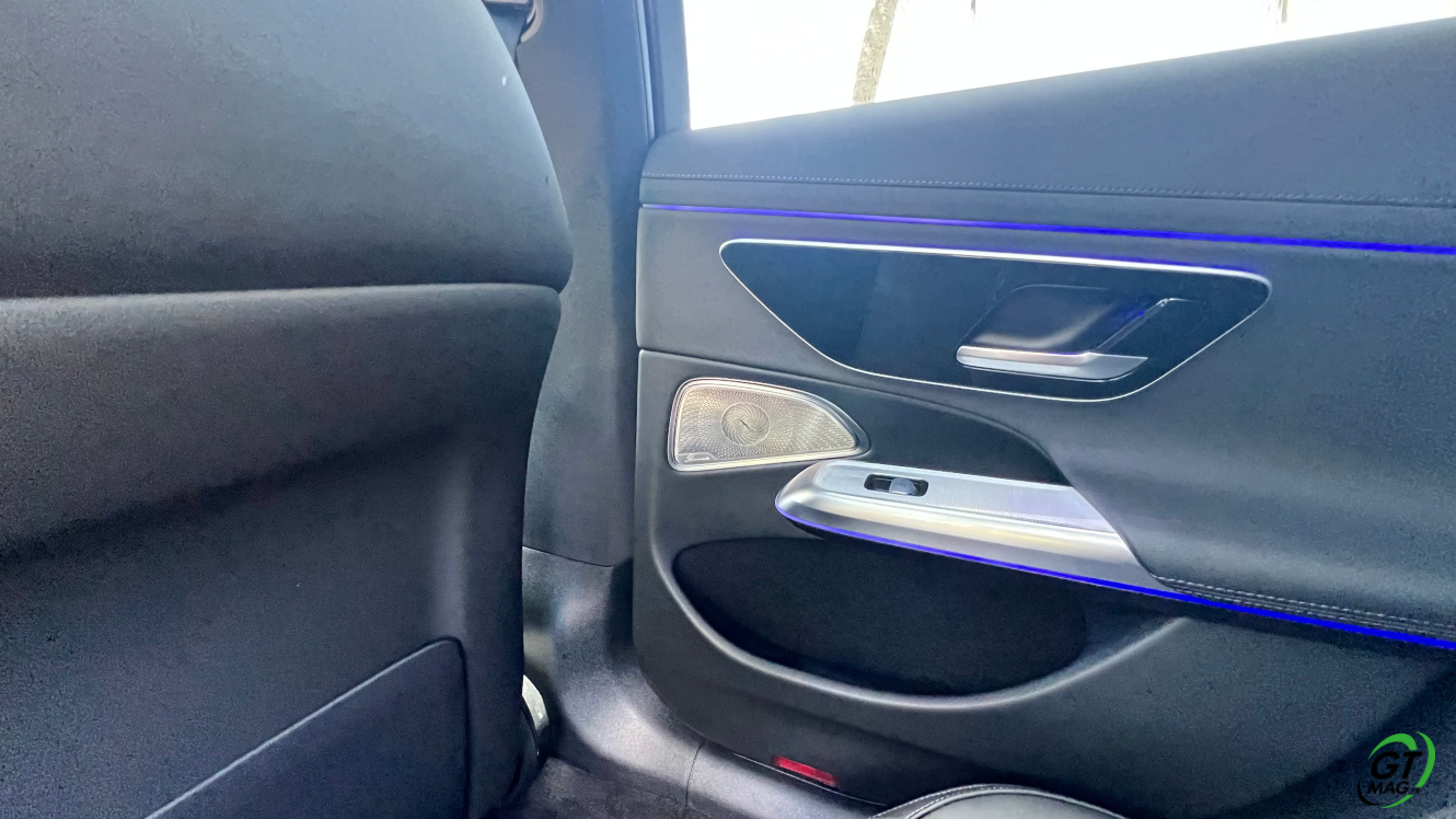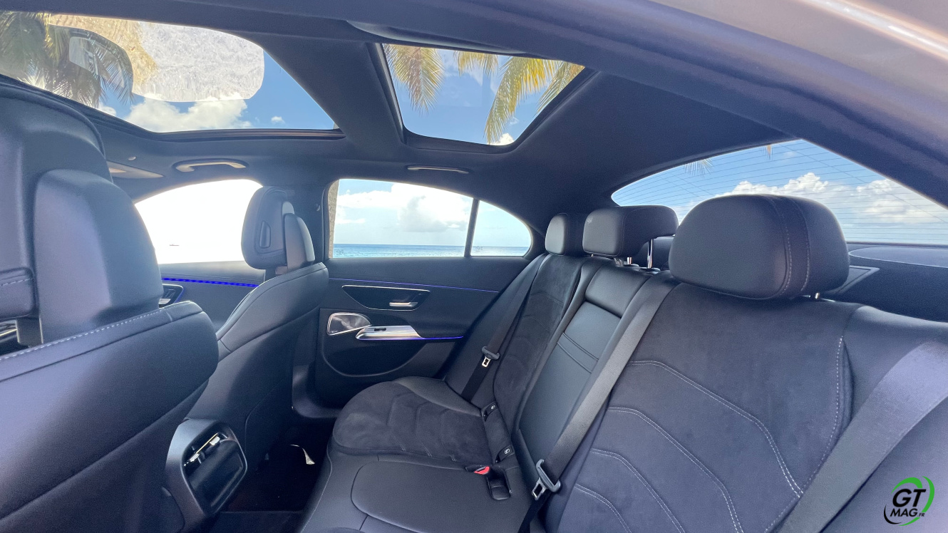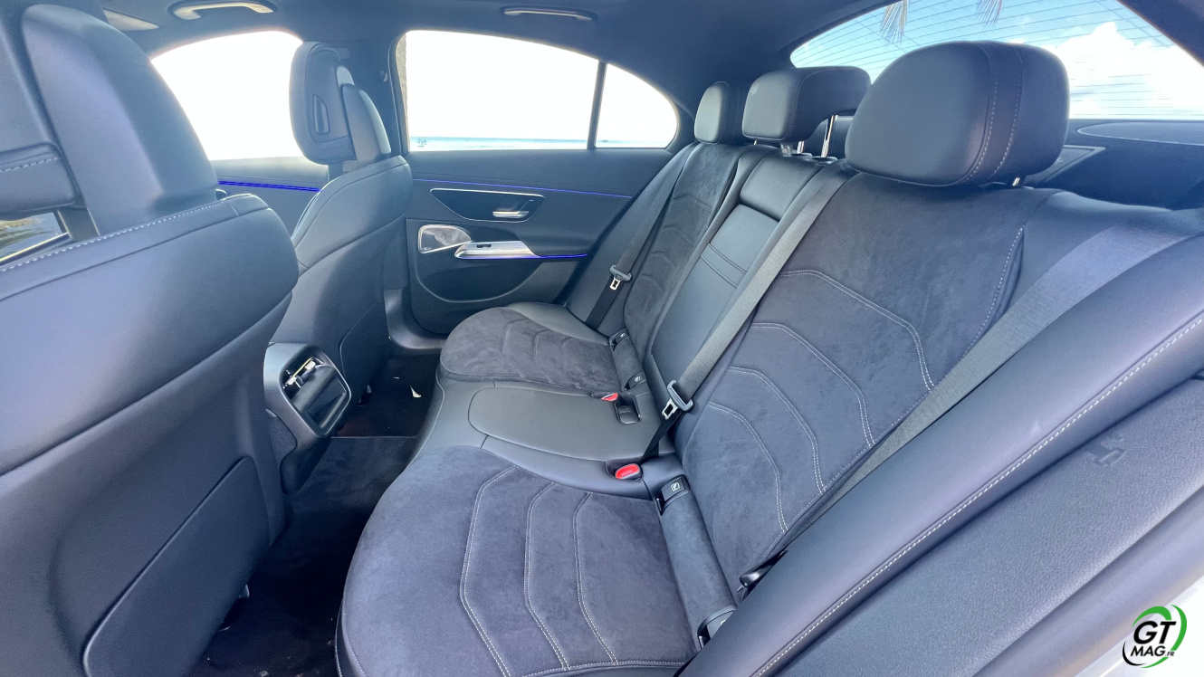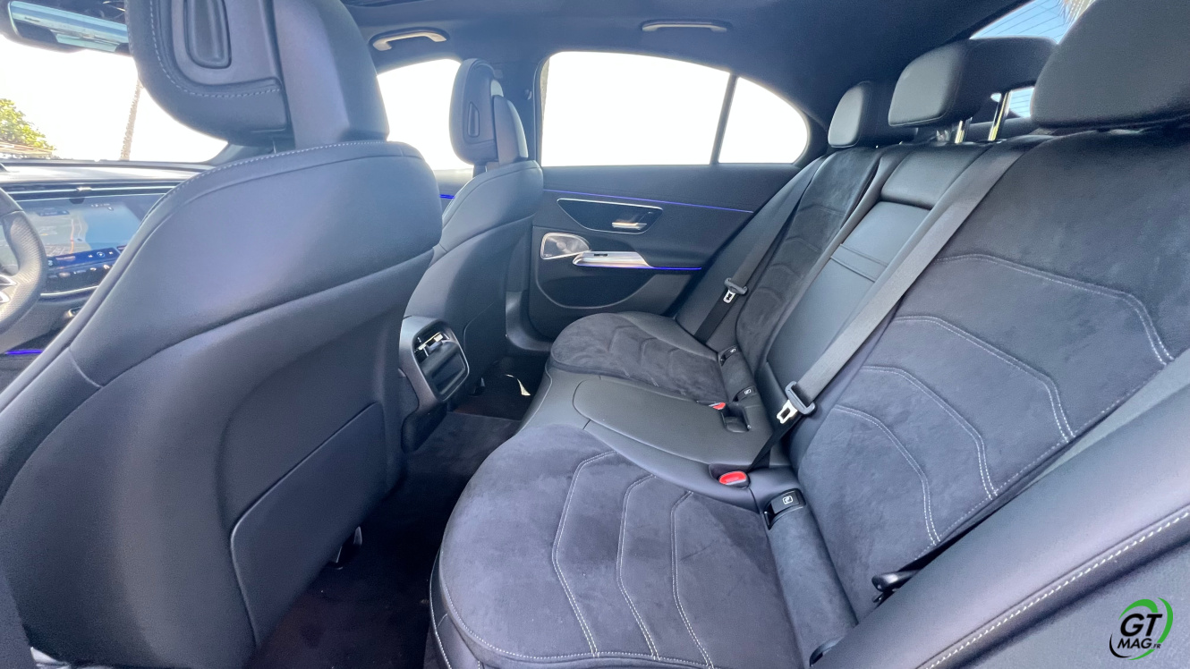 Avec son empattement de 2.94 m, la Mercedes Classe E 2024 offre une bonne place pour les passagers arrière. Les sièges sont très confortables sur les place gauche et droite, alors que la place du milieu sera à réserver aux petits trajets. Pour une fois, les passagers ne sont pas relégués en seconde division : c’est aussi bien fini qu’à l’avant ! On retrouve les même petites attentions et surtout, les même matériaux utilisés. Pour occuper les passagers, on retrouve des lampes de lecture et deux ports USB. Avec espace et luminosité, voyager à l’arrière n’est plus un soucis. En véhicule assez apprécié des commerciaux, ces derniers n’ont pas été oubliés. On retrouve par exemple 4 crochets pour les cintres des costumes ! Enfin, le coffre de la berline est très profond et bien large et offre 540 L de chargement !