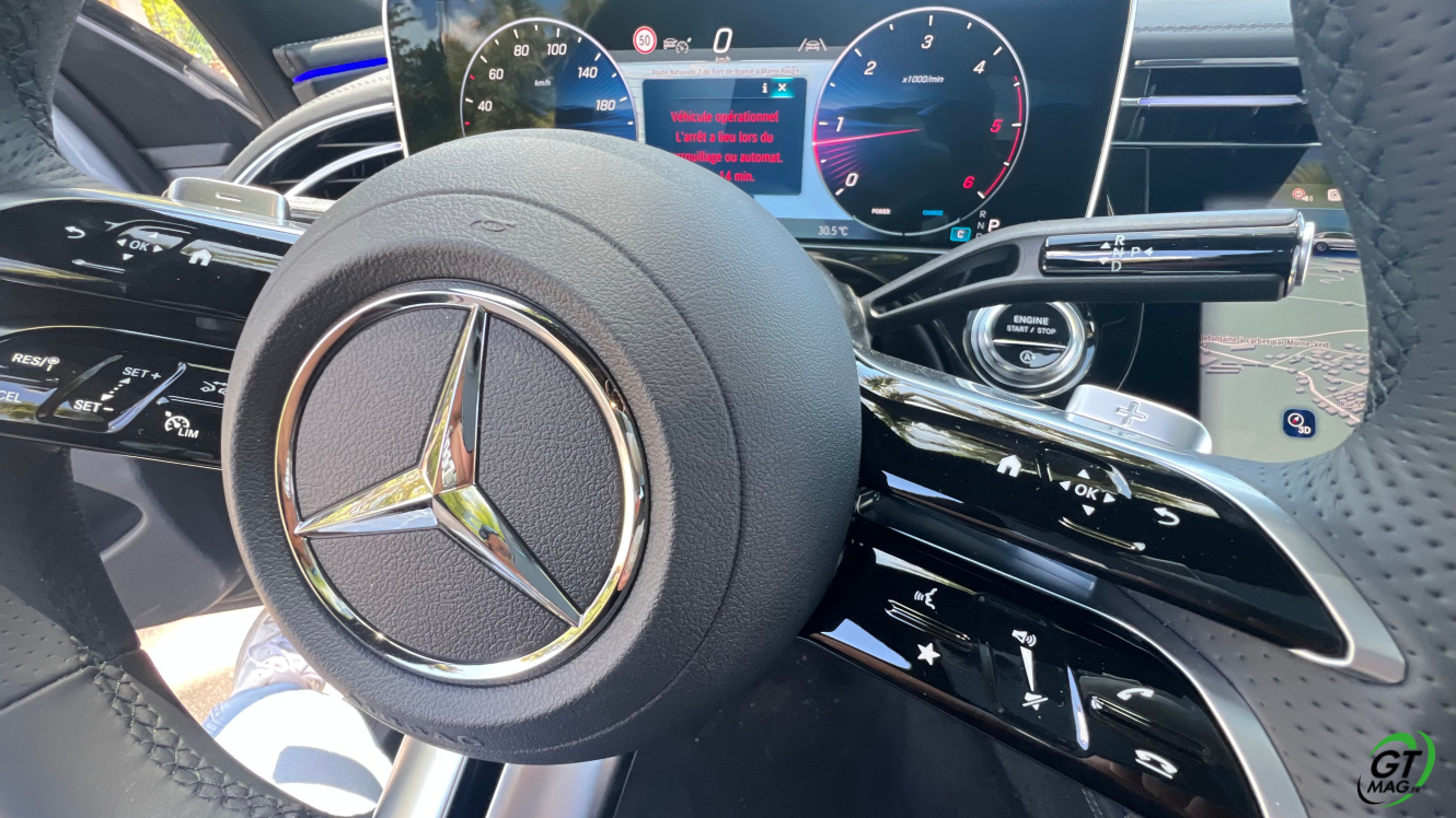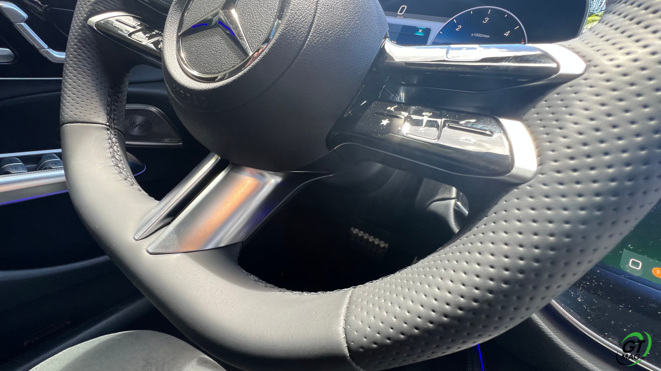Le confort reste donc la priorité évidente de ce modèle Mercedes Classe E un peu plus encore dans sa version S-line de notre essai de ce matin… Cette 6ème génération approuve et met à disposition de ses acquéreurs ses capacités de grande et belle routière et dès l’entrée dans le véhicule que ce soit avec l’affichage tête haute ou la suspension pneumatique quasi incomparable complète l’excellent confort délivrés par les sièges ventilés. L’insonorisation est juste maîtrisée à merveille ce qui autorise son moteur 2 l diesel de 197 ch de se faire totalement discret l’ensemble absorbe et dilue les bruits d’air ou de roulage sur notre rocade. En outre, grâce aux 66 l de réservoir, ce mazout promet plus de 800 km d’autonomie à cette allure, une valeur à faire pâlir toutes les hybrides rechargeables et autres 100% électriques.