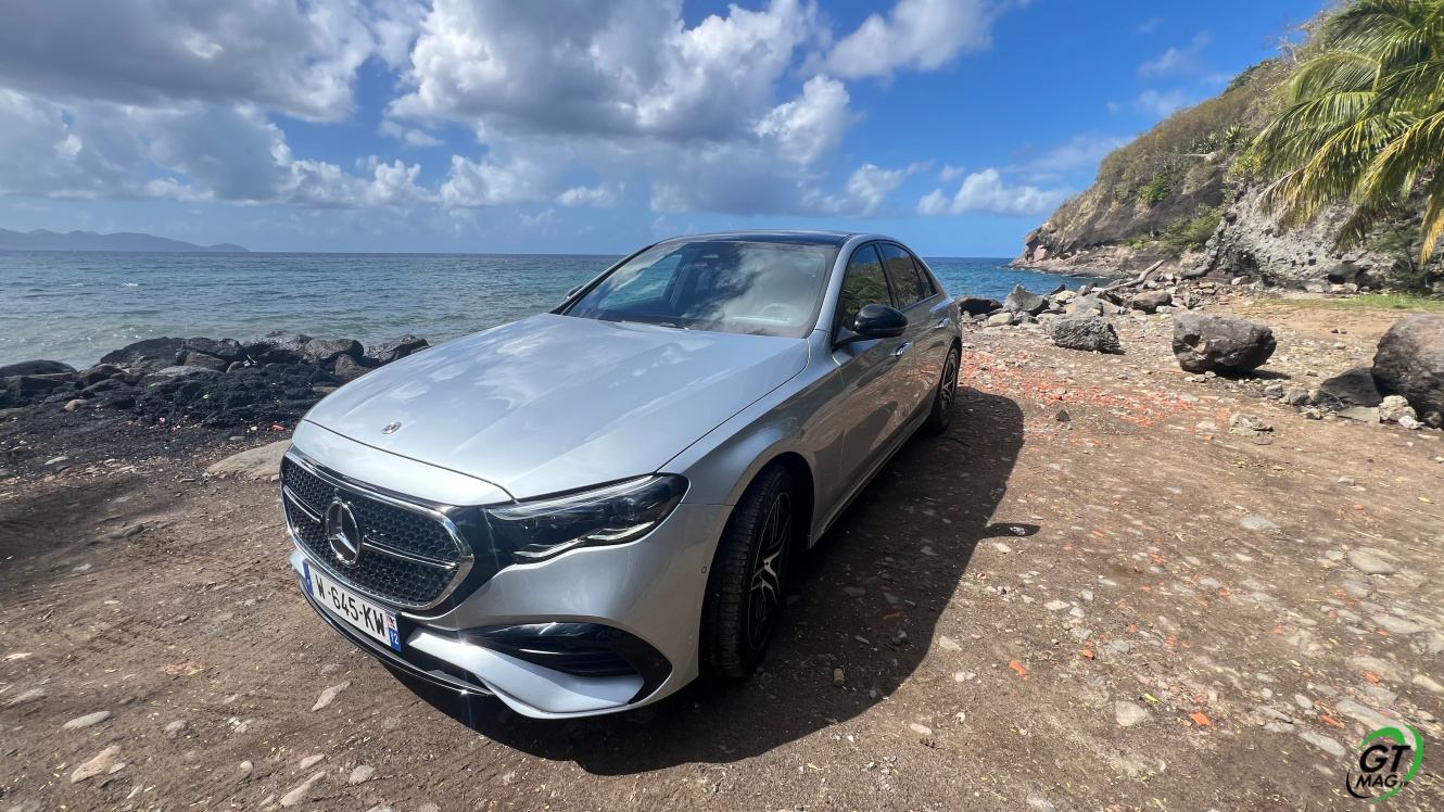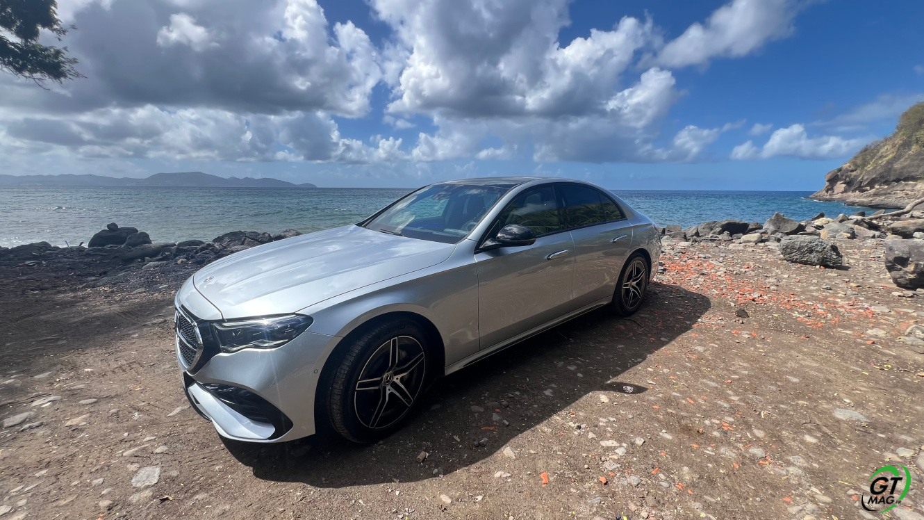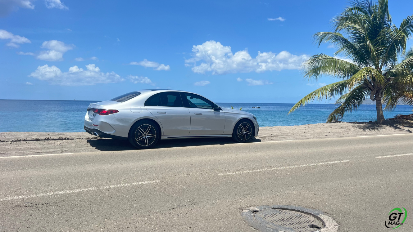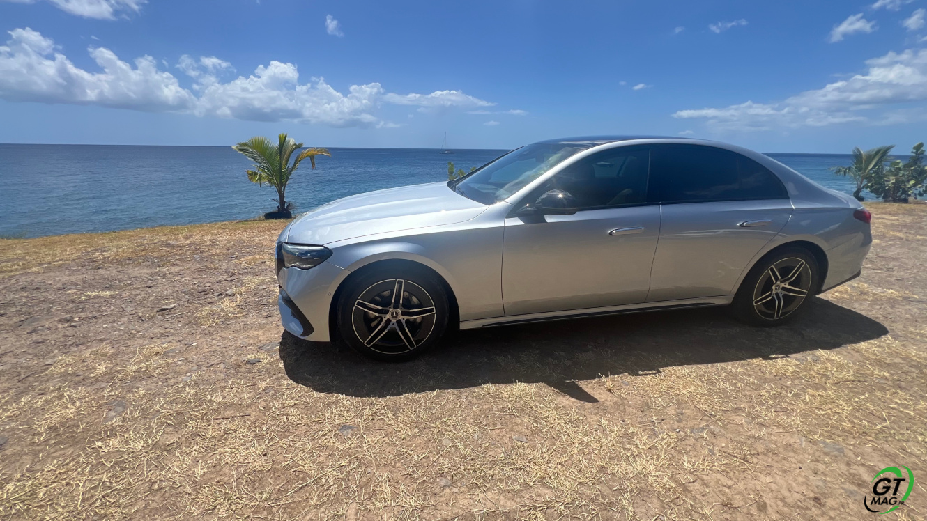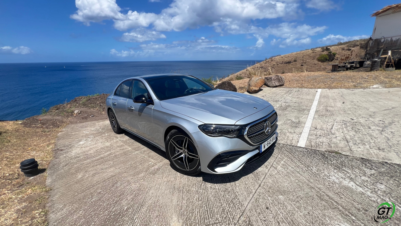 Mercedes a conservé une offre essence comme Diesel, si ce n’est que cette fois, 100% des blocs sont électrifiés. Il faut quand même se faire une raison en acceptant la généralisation des 4 cylindres désormais. A une exception près quand même puisque la 450d 4MATIC, qui arrivera un peu plus tard sur le marché, sera animée d’un 6 cylindres en ligne micro hybridé. Autrement, on démarre avec la 200, 4 cylindres essence de 204 ch, puis la Mercedes classe E 220d Diesel donc de 197 ch 440 Nm notre essai en Martinique ou la 220d 4MATIC qui motrice les 4 roues. Ces moteurs sont tous micros hybridés avec 23 ch d’apport électrique sous certaines circonstances… Le bloc spécialement silencieux de 4 cylindres fait merveille sur nos routes avec une consommation aux alentours des 5,7 l5.8l/100 km… .