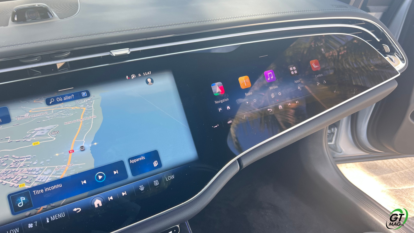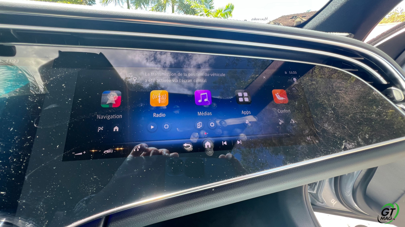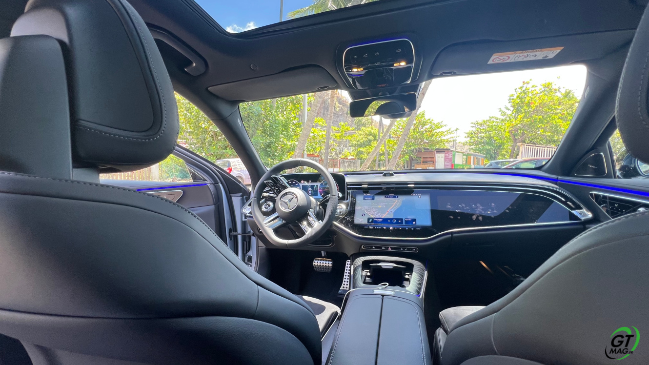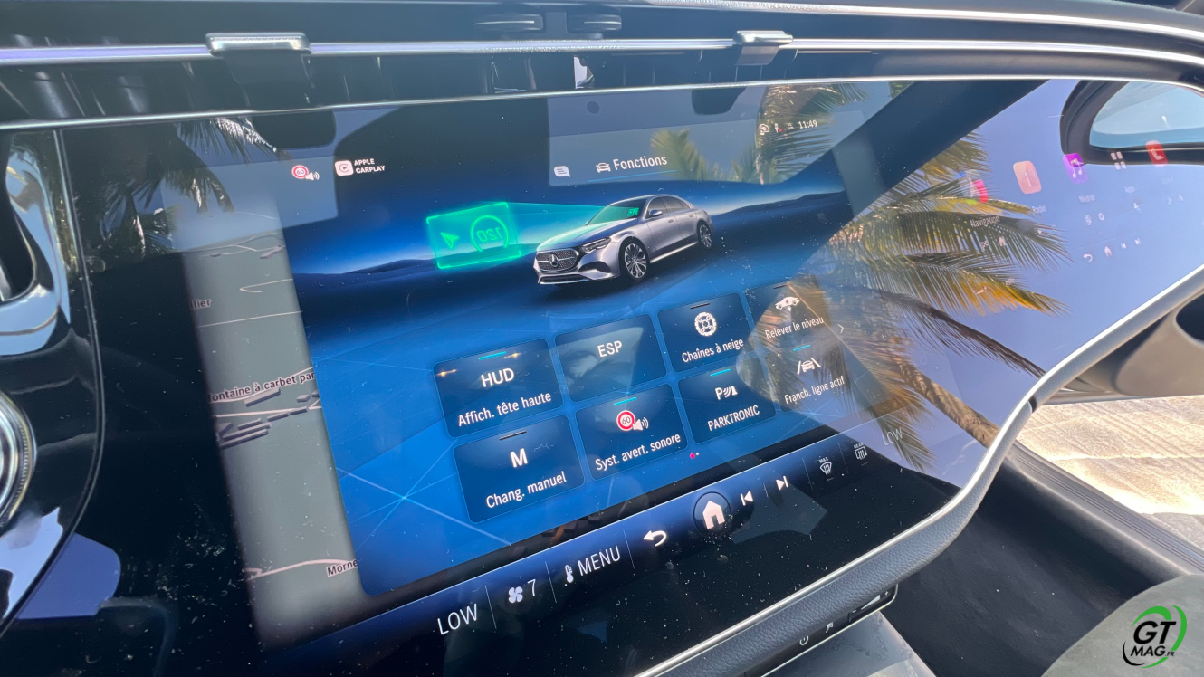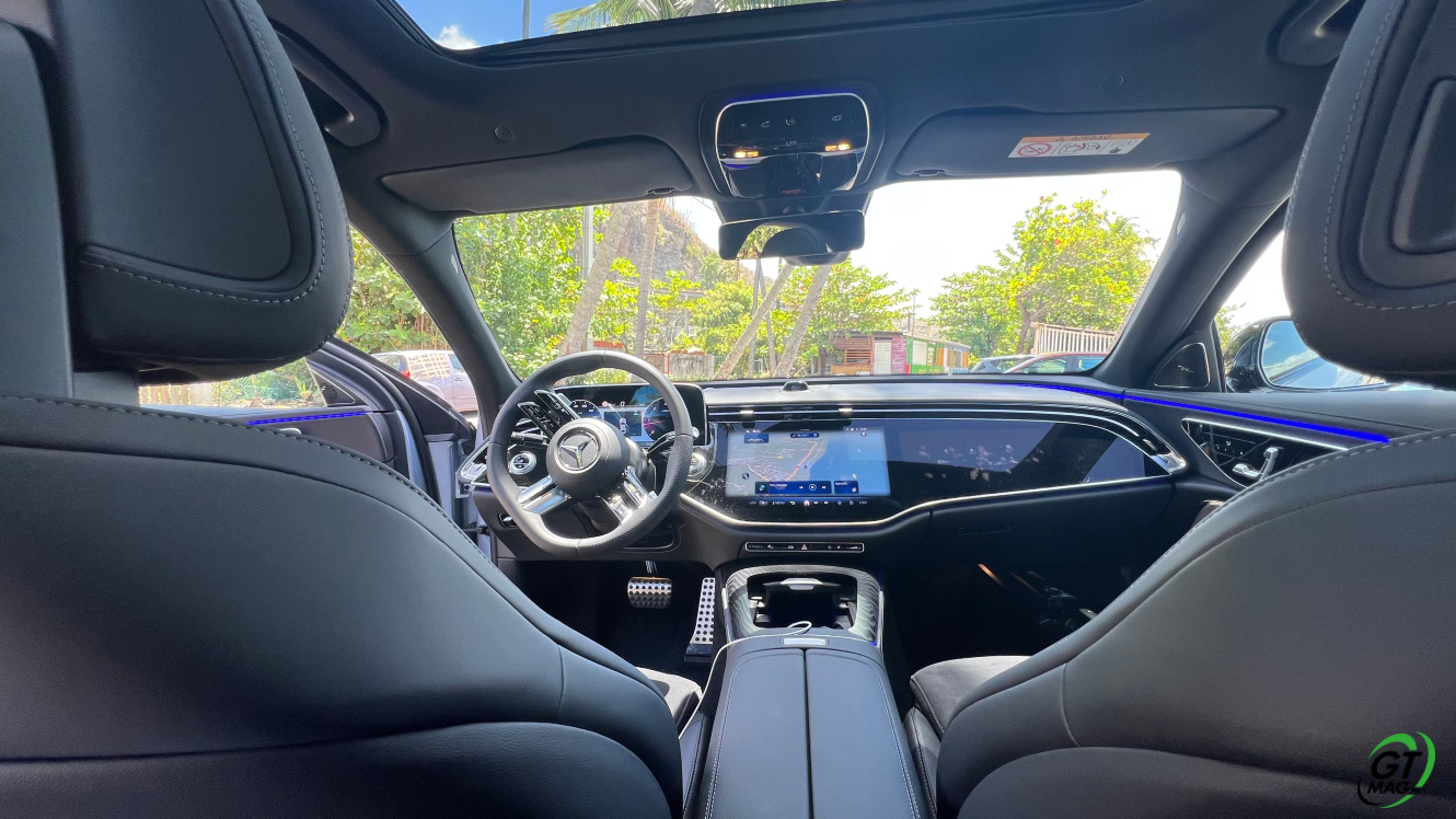 A l’intérieur je découvre avec plaisir la fin des turbines d’aérations et la possibilité de trouver de nombreux réglages possibles en matière d'éclairages et donc d’ambiances. Sur la planche de bord belle configuration avec 3 écrans désormais qui peuvent animer l’habitacle et qui propose les solutions de conduites aidées et de loisirs. La Classe E s’équipe d’une nouvelle version de son système d’exploitation MBUX inspiré de l’EQS … L’écran tactile central grandit significativement et profite d’une nouvelle interface plus lisible et plus fonctionnelle. Et puis on retrouve ce 3ème écran côté passager qui permet d'accéder à toutes les fonctions multimédias qui devraient donner des sueurs froides à Tesla mais aussi d’avoir sa propre vision de la navigation. Pratique pour rechercher une zone ou une destination sans annuler le trajet principal. Le passager avant peut de fait visionner un film sur YouTube avec un casque bluetooth.