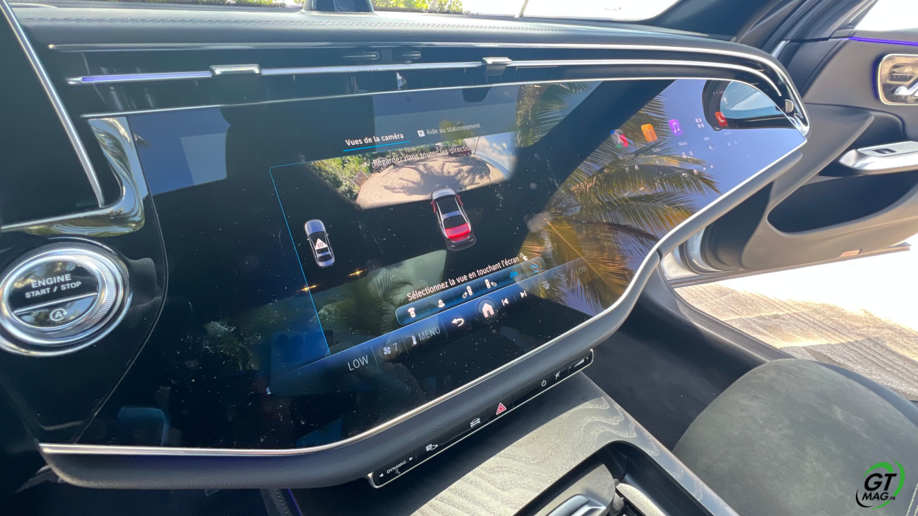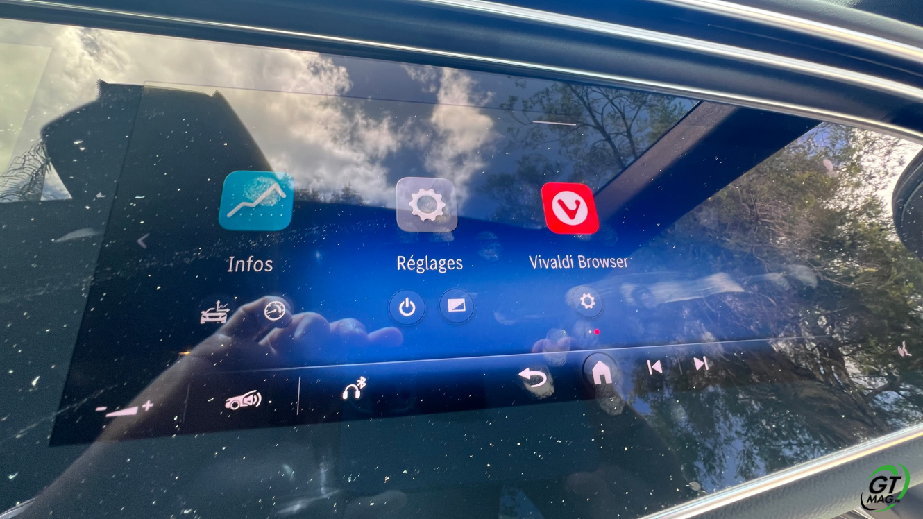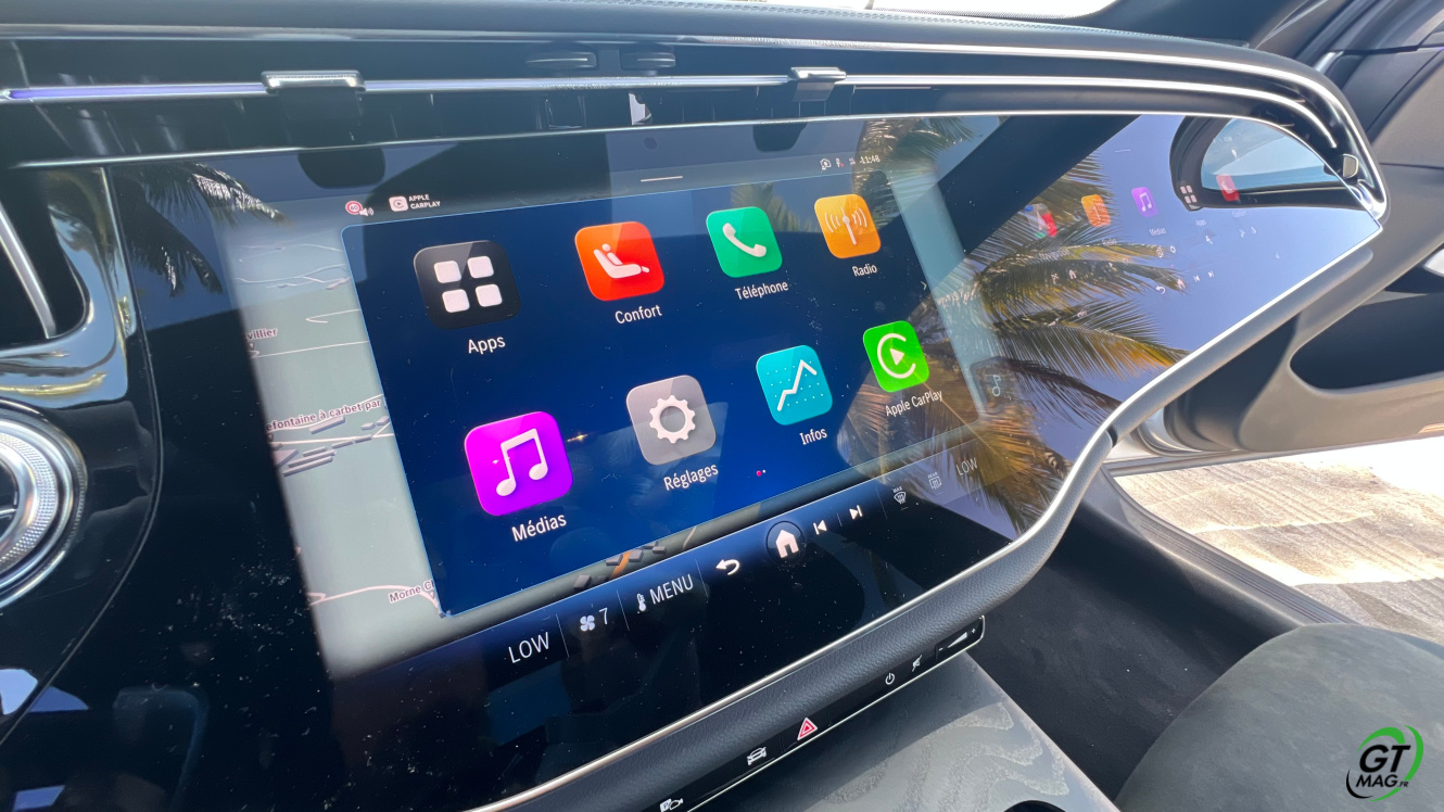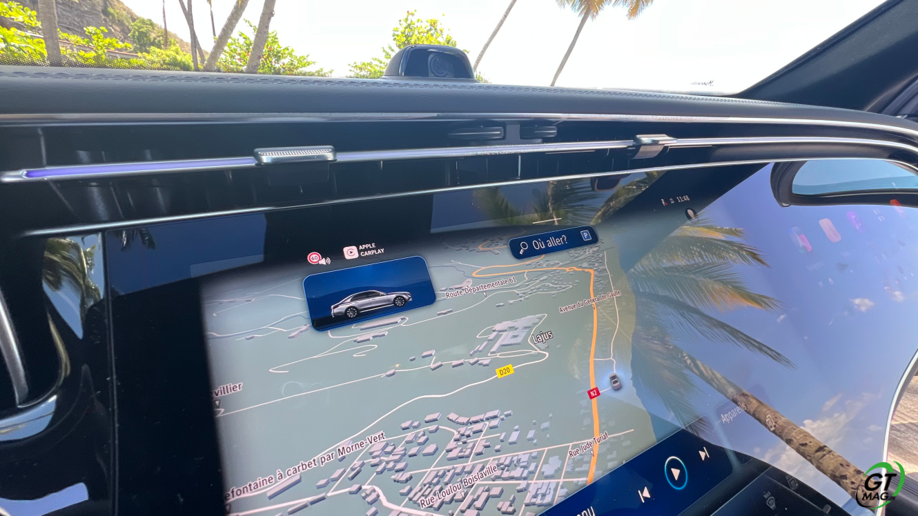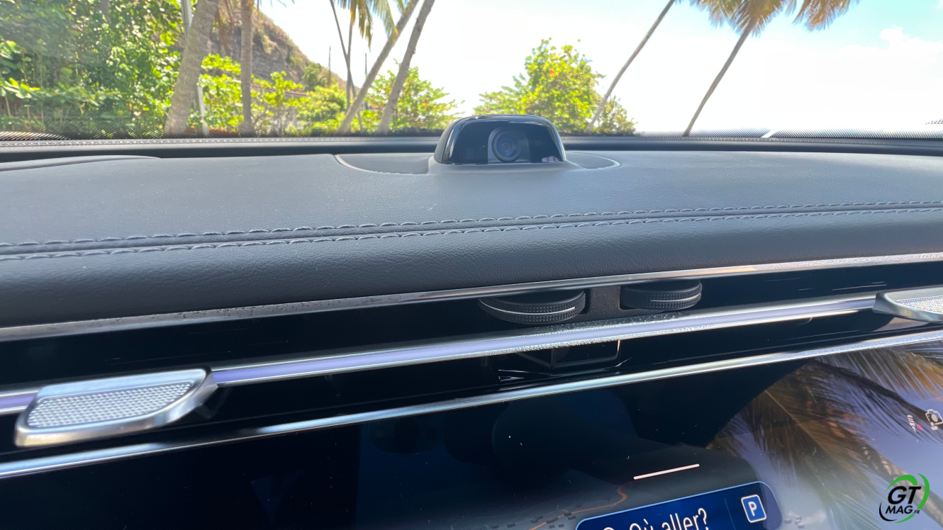 A l’intérieur je découvre avec plaisir la fin des turbines d’aérations et la possibilité de trouver de nombreux réglages possibles en matière d'éclairages et donc d’ambiances. Sur la planche de bord belle configuration avec 3 écrans désormais qui peuvent animer l’habitacle et qui propose les solutions de conduites aidées et de loisirs. La Classe E s’équipe d’une nouvelle version de son système d’exploitation MBUX inspiré de l’EQS … L’écran tactile central grandit significativement et profite d’une nouvelle interface plus lisible et plus fonctionnelle. Et puis on retrouve ce 3ème écran côté passager qui permet d'accéder à toutes les fonctions multimédias qui devraient donner des sueurs froides à Tesla mais aussi d’avoir sa propre vision de la navigation. Pratique pour rechercher une zone ou une destination sans annuler le trajet principal. Le passager avant peut de fait visionner un film sur YouTube avec un casque bluetooth.