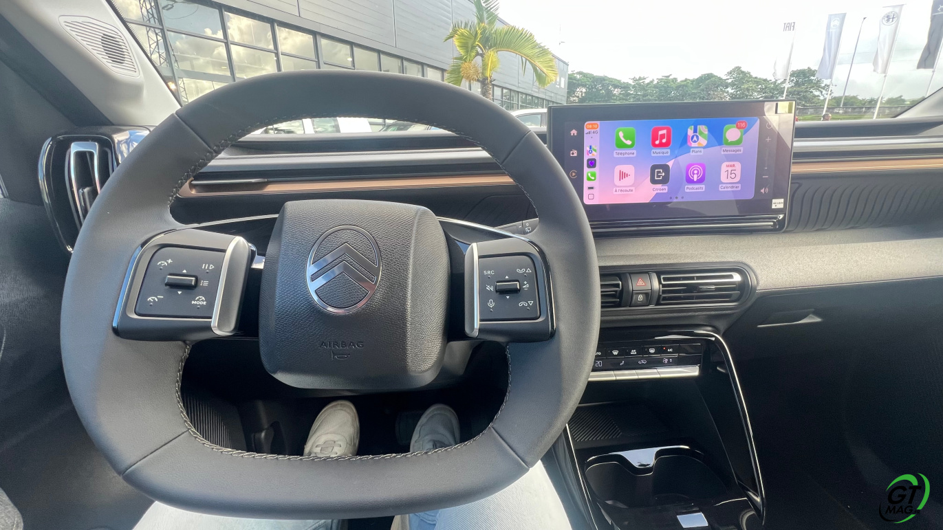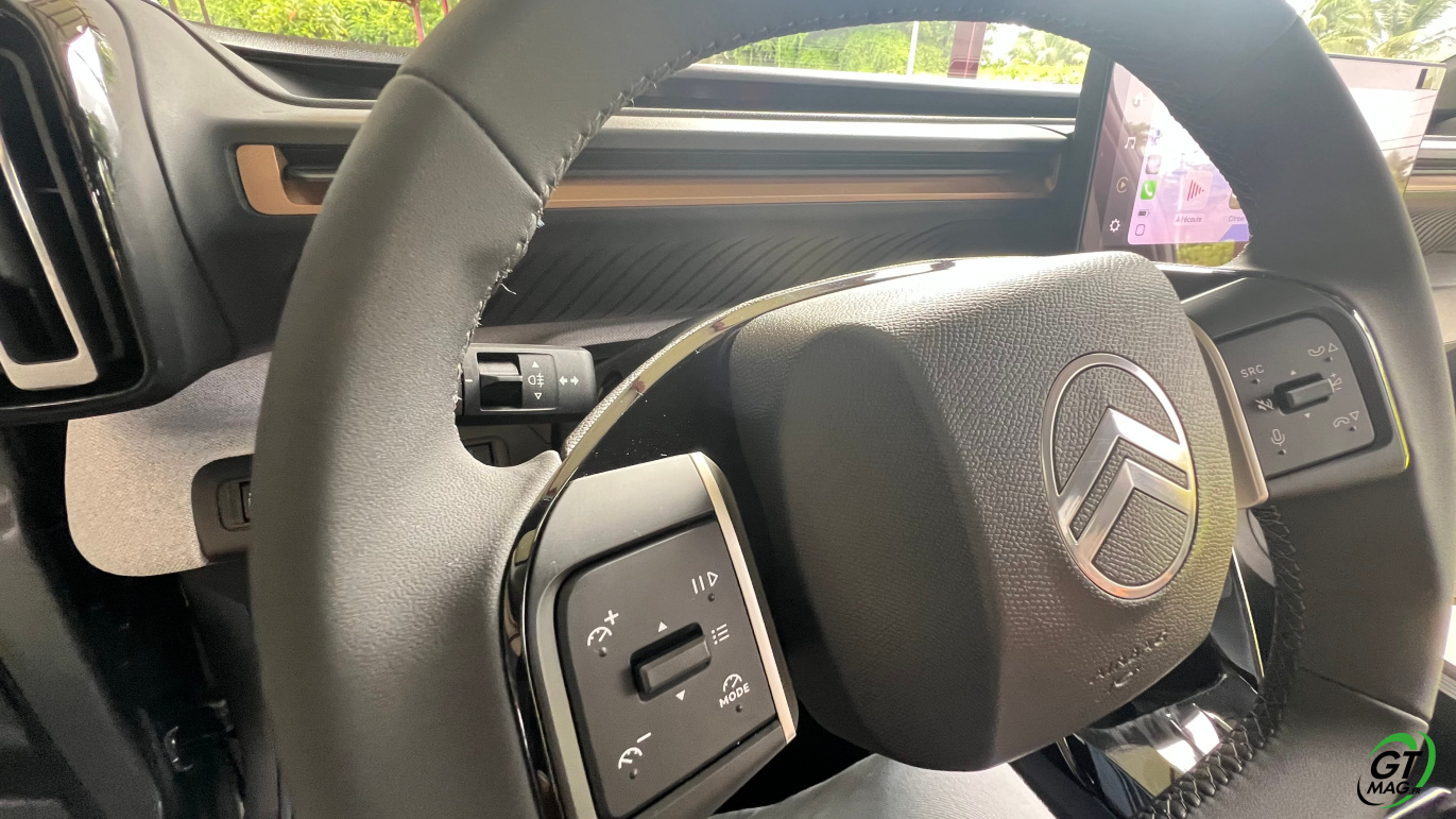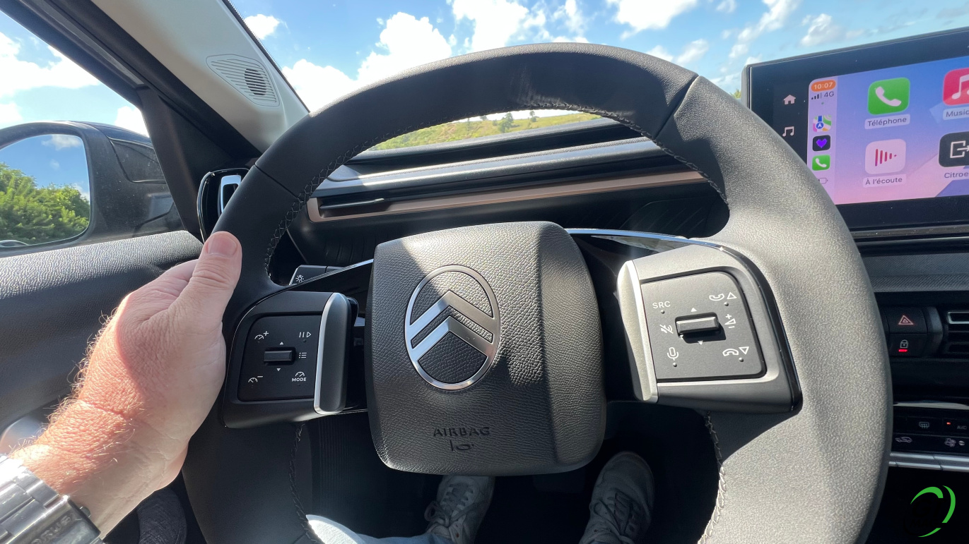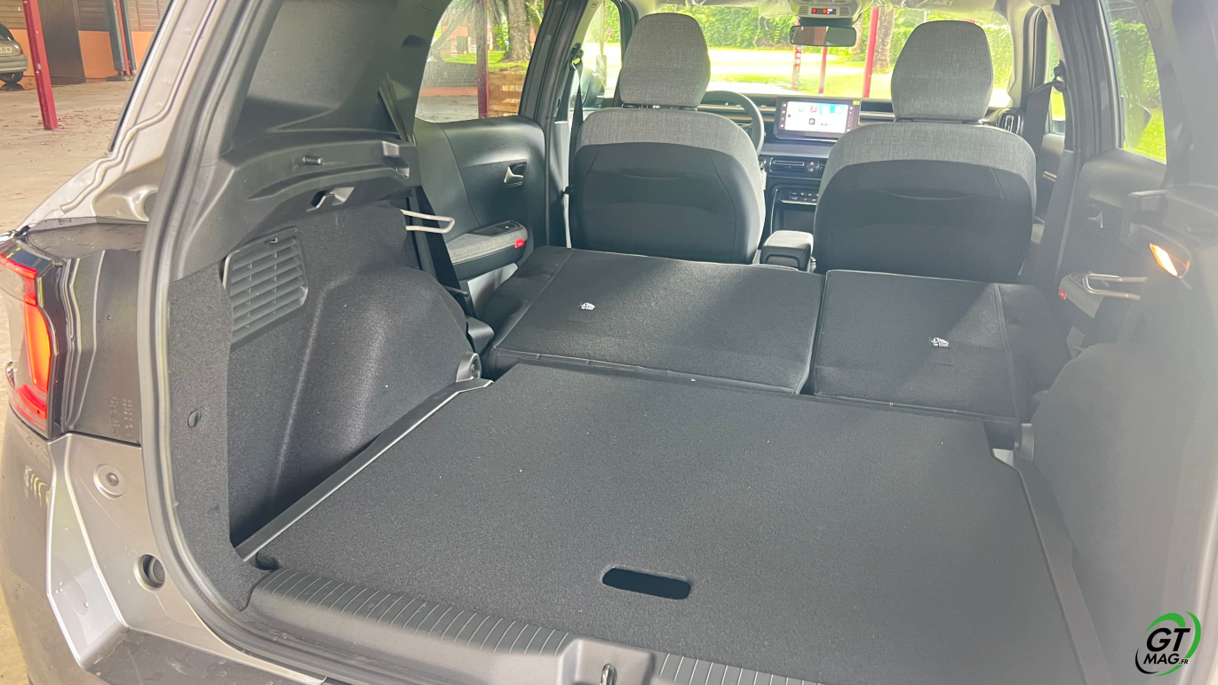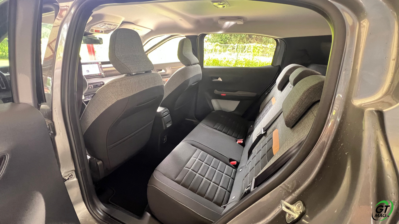 À l’intérieur justement, le design semble épuré voir un peu simpliste mais en y regardant de plus près les rangements sont nombreux et efficaces, les assises accueillantes, et surtout : le confort rationnel saute aux yeux. La planche de bord intègre un grand écran central de 10,25 pouces, fluide, avec la connectivité sans fil CarPlay/Android Auto. La tendance du marché est respectée avec les commandes de clim physiques et c’est vraiment une demande des clients. Dans un monde où tout est digital cela permet de se souvenir que les meilleures idées sont parfois à puiser dans le passé. À l’arrière, l’espace aux jambes est étonnant, même pour les grands gabarits l’habitabilité est probablement l’une des meilleures de la catégorie trois adultes peuvent s’installer sans se sentir comme des sardines en boîte. Le coffre, quant à lui, offre 460 litres en version 5 places, avec un seuil de chargement plat. Citroën propose une option 7 places dans la version hybride uniquement mais les deux sièges du fond ne conviendront qu’à des enfants — et uniquement pour de courts trajets.