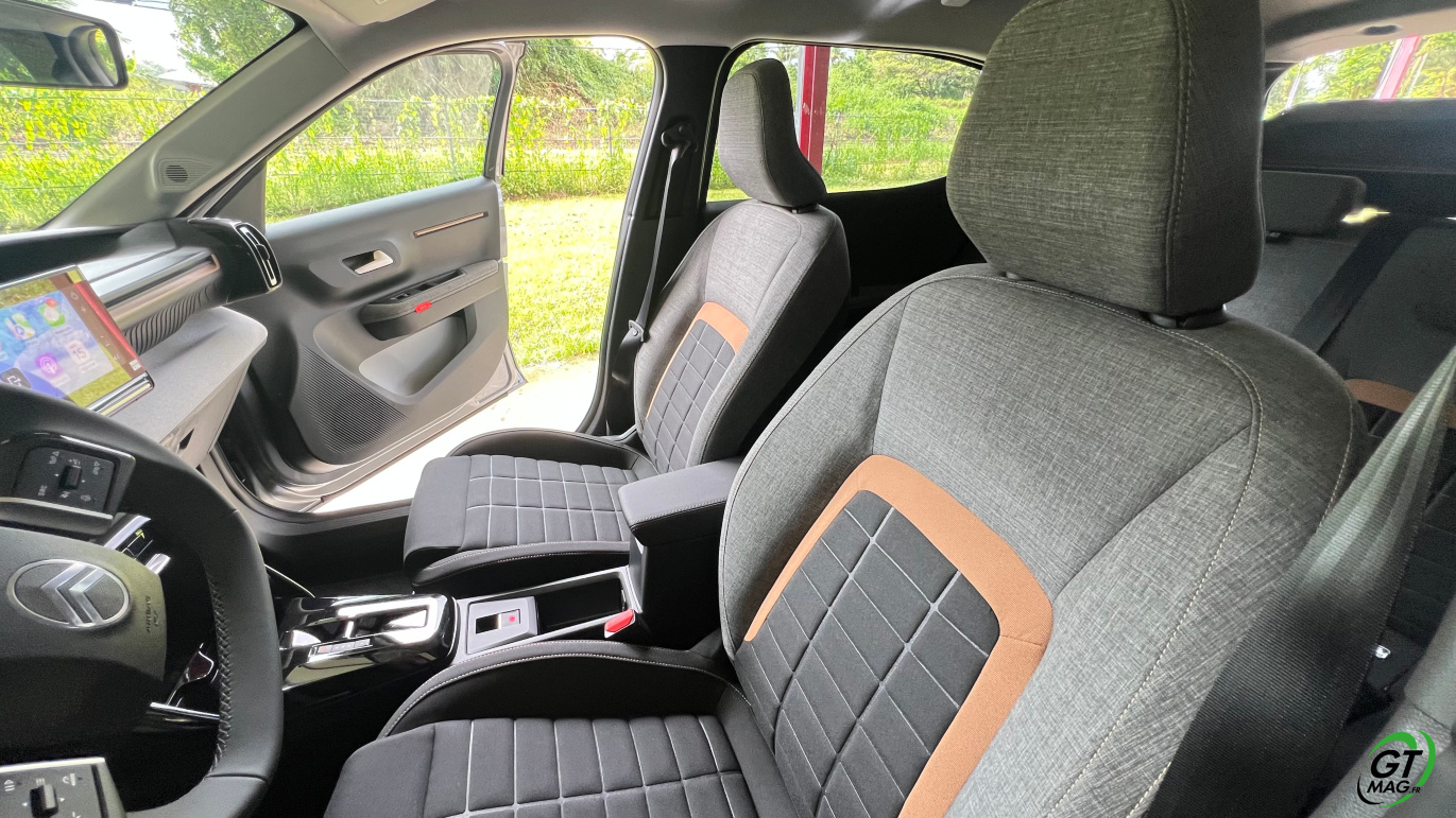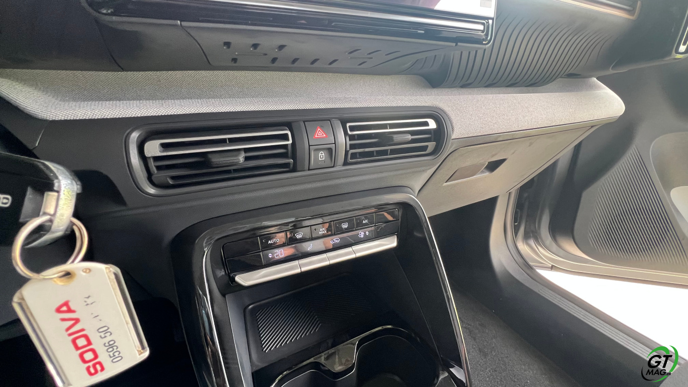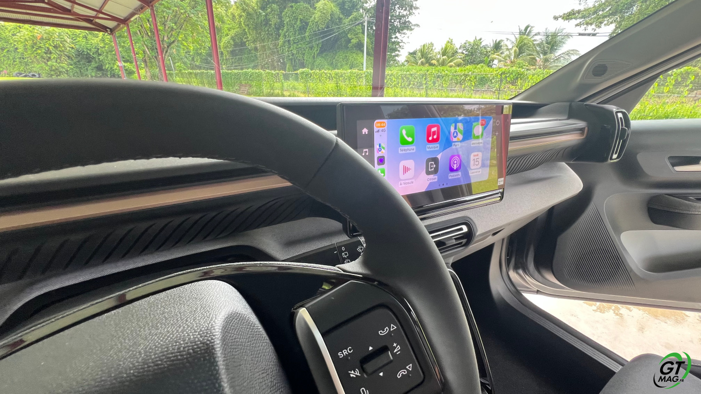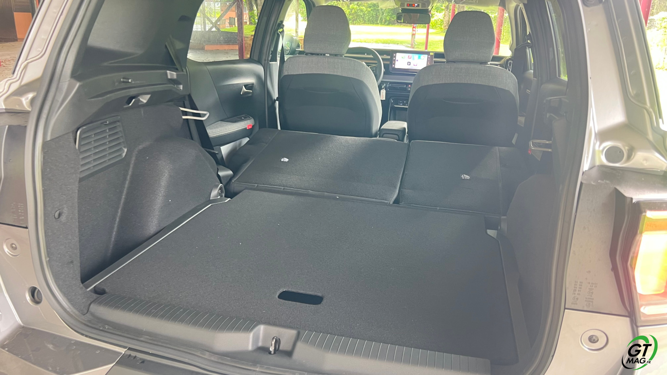 À l’intérieur justement, le design semble épuré voir un peu simpliste mais en y regardant de plus près les rangements sont nombreux et efficaces, les assises accueillantes, et surtout : le confort rationnel saute aux yeux. La planche de bord intègre un grand écran central de 10,25 pouces, fluide, avec la connectivité sans fil CarPlay/Android Auto. La tendance du marché est respectée avec les commandes de clim physiques et c’est vraiment une demande des clients. Dans un monde où tout est digital cela permet de se souvenir que les meilleures idées sont parfois à puiser dans le passé. À l’arrière, l’espace aux jambes est étonnant, même pour les grands gabarits l’habitabilité est probablement l’une des meilleures de la catégorie trois adultes peuvent s’installer sans se sentir comme des sardines en boîte. Le coffre, quant à lui, offre 460 litres en version 5 places, avec un seuil de chargement plat. Citroën propose une option 7 places dans la version hybride uniquement mais les deux sièges du fond ne conviendront qu’à des enfants — et uniquement pour de courts trajets.