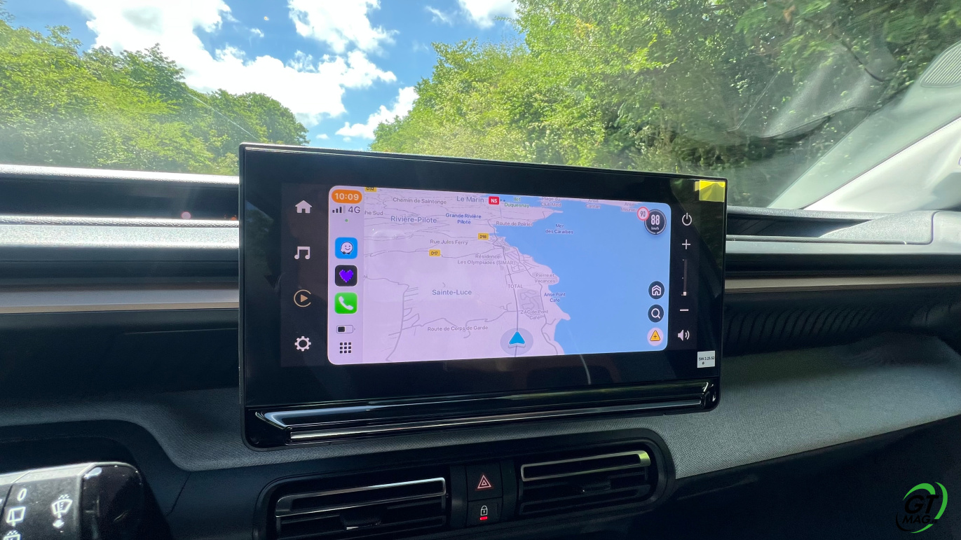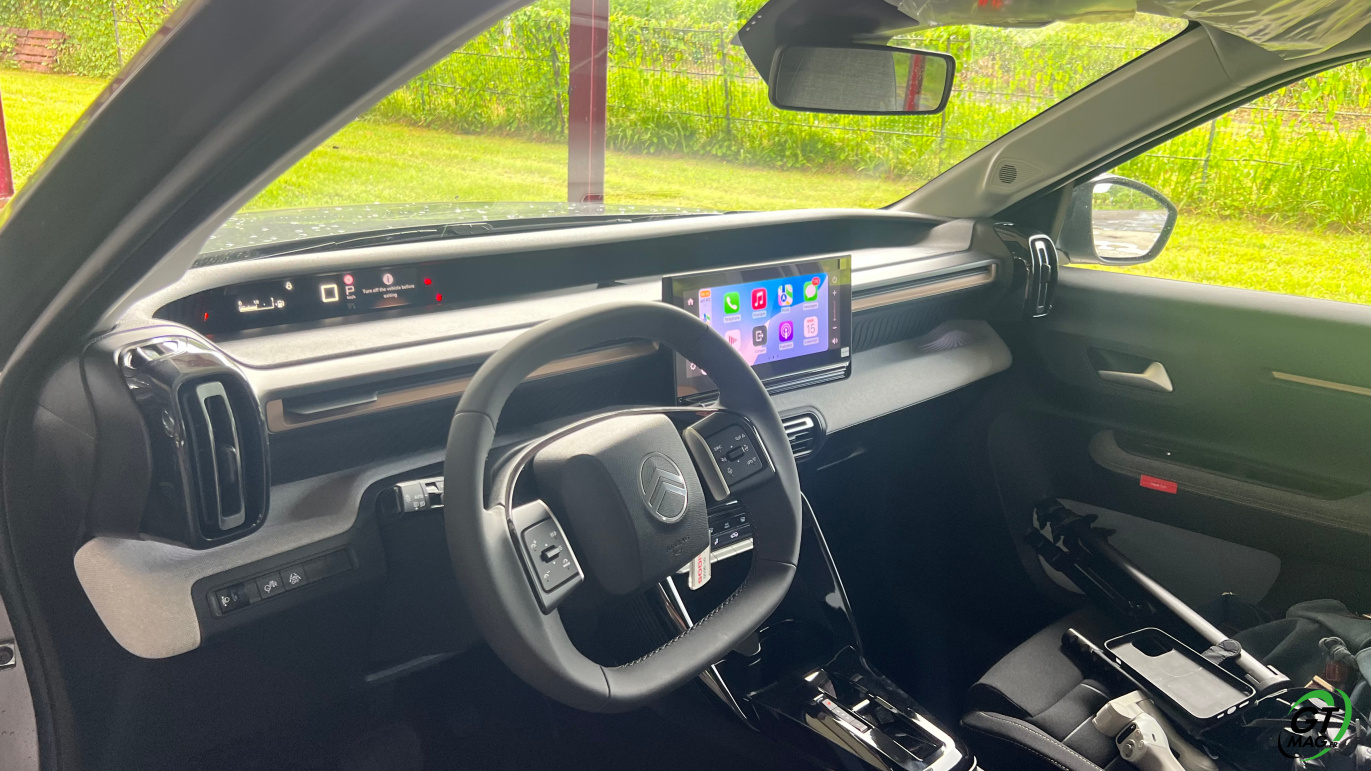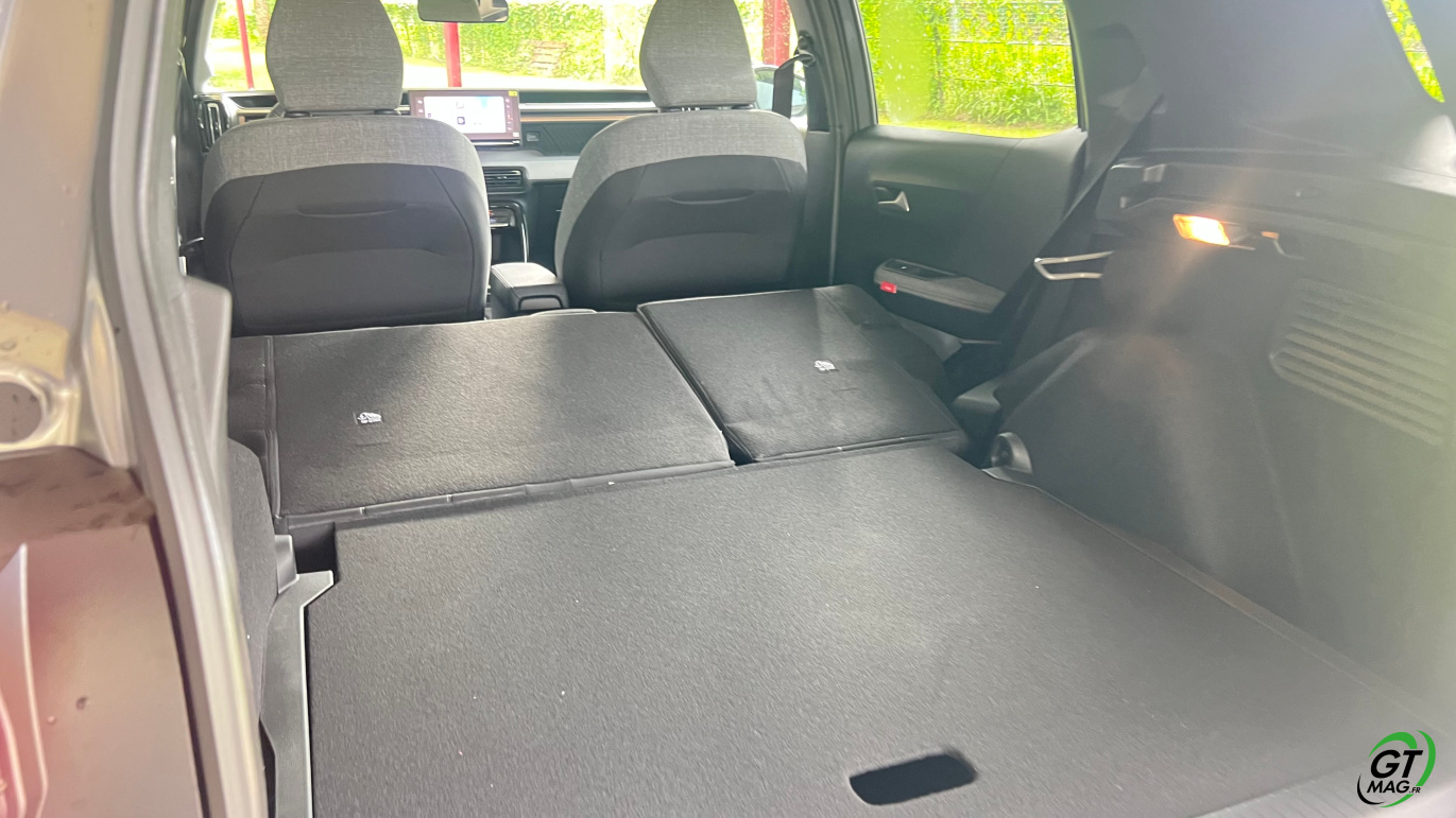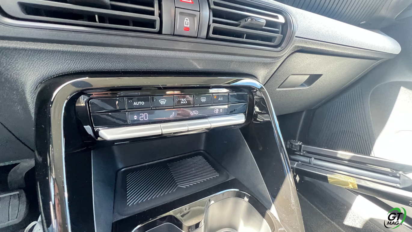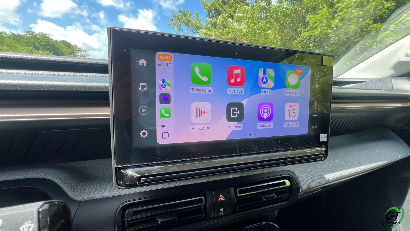 À l’intérieur justement, le design semble épuré voir un peu simpliste mais en y regardant de plus près les rangements sont nombreux et efficaces, les assises accueillantes, et surtout : le confort rationnel saute aux yeux. La planche de bord intègre un grand écran central de 10,25 pouces, fluide, avec la connectivité sans fil CarPlay/Android Auto. La tendance du marché est respectée avec les commandes de clim physiques et c’est vraiment une demande des clients. Dans un monde où tout est digital cela permet de se souvenir que les meilleures idées sont parfois à puiser dans le passé. À l’arrière, l’espace aux jambes est étonnant, même pour les grands gabarits l’habitabilité est probablement l’une des meilleures de la catégorie trois adultes peuvent s’installer sans se sentir comme des sardines en boîte. Le coffre, quant à lui, offre 460 litres en version 5 places, avec un seuil de chargement plat. Citroën propose une option 7 places dans la version hybride uniquement mais les deux sièges du fond ne conviendront qu’à des enfants — et uniquement pour de courts trajets.