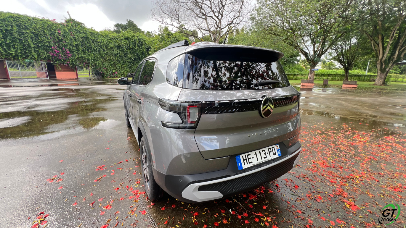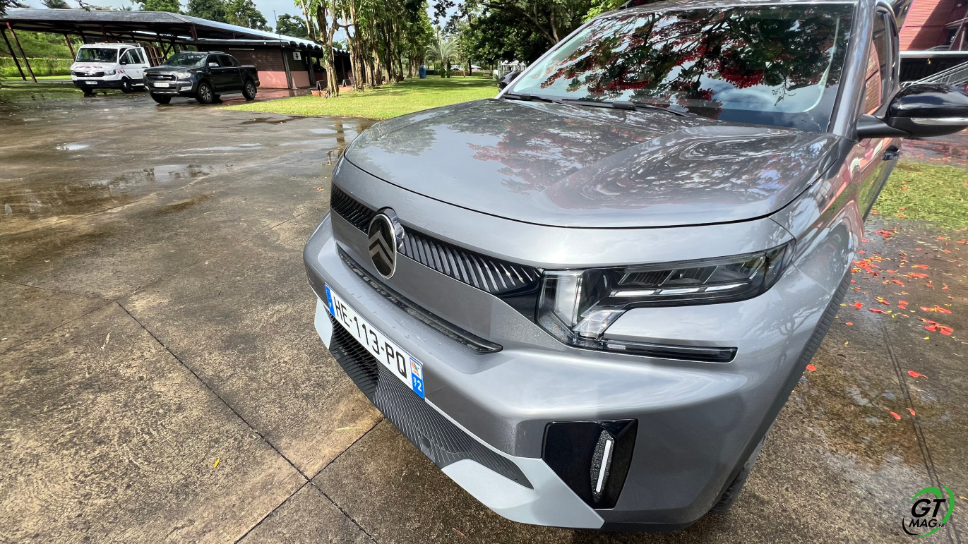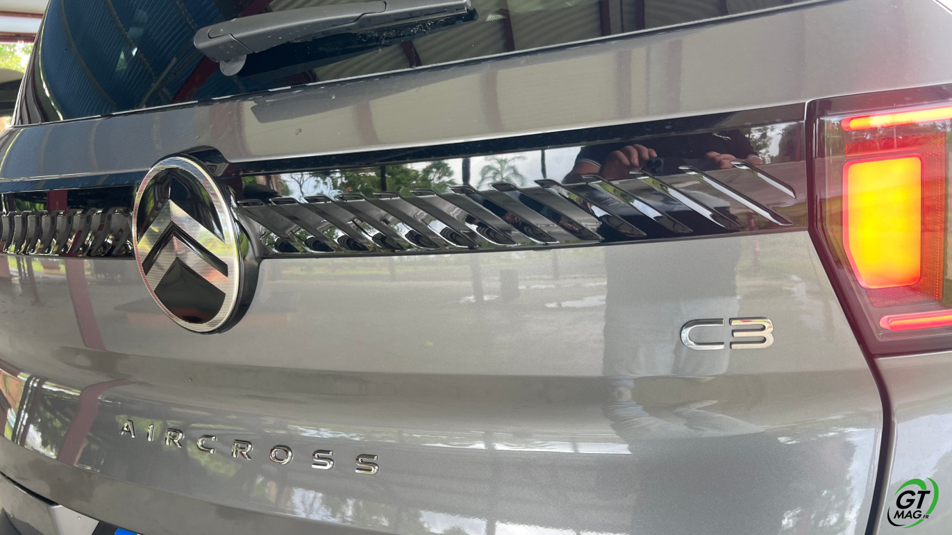 Côté style et premières impressions visuelles : comme promis la marque transforme quasi intégralement les lignes avec un grand tour de magie, celui d’avoir su garder les codifications du modèle précédent plébiscité par les aficionados bravo aux ingénieurs du design Citroën… Comme la dernière C3, sa version SUV Aircross troque les rondeurs pour un design bien plus affirmé, aux angles nets et aux arêtes rectilignes. Bien sûr, tous les éléments se conforme au nouveau langage stylistique de Citroën : le nouveau logo, la signature lumineuse à LED, les bandeaux noirs à chevrons… Je note le capot horizontal… Au final en premières impressions, un peu plus de muscle sur les épaules qui apporte au Nouveau Citroën C3 Aircross Hybride un côté bien plus costaud et donc surement à la conduite bien plus ‘Scotché’ à nos asphaltes secondaires parfois belliqueux en Martinique comme en Guadeloupe…