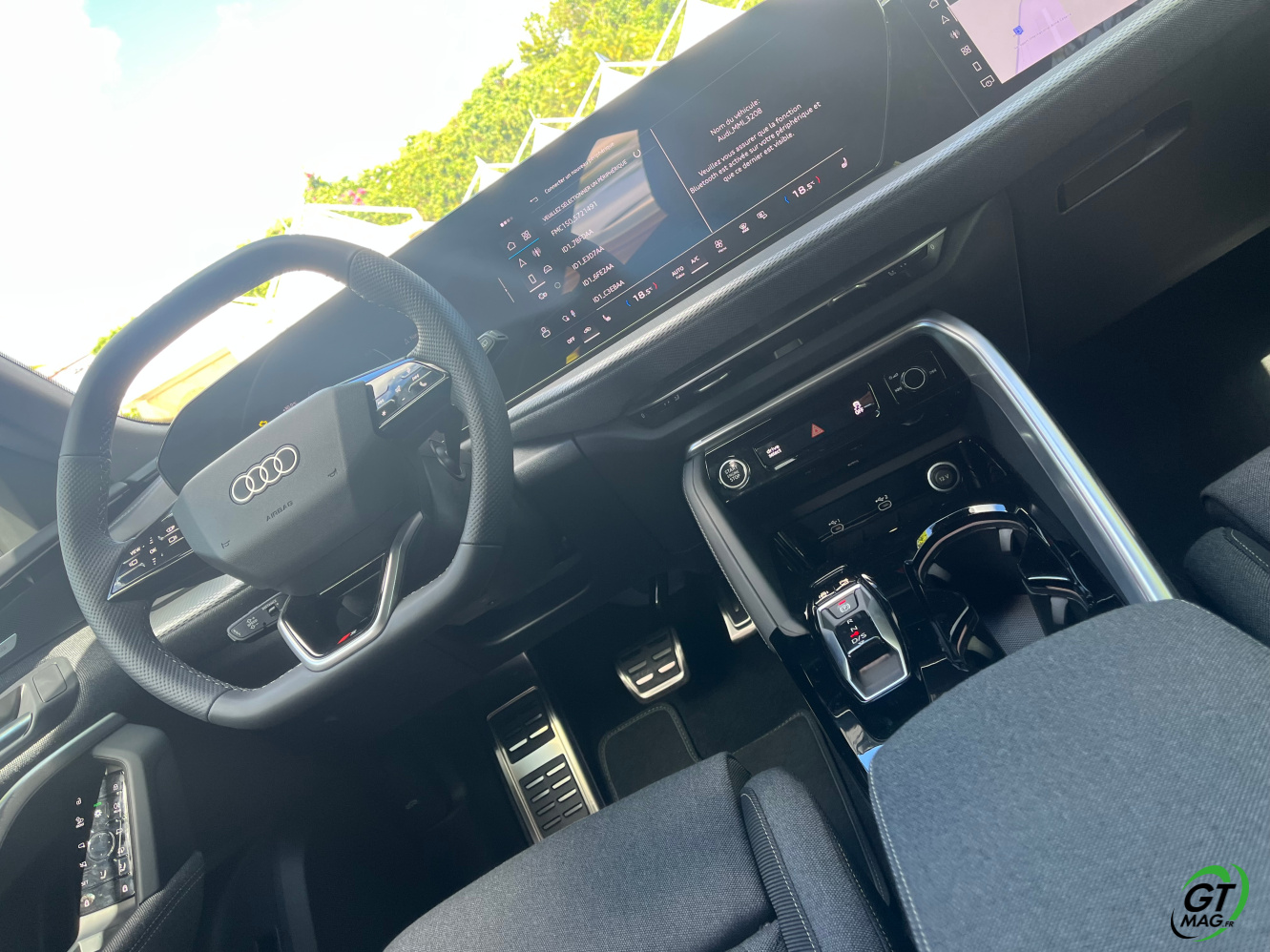 Aux places avant, ce Q5 cuvée 2025 adopte les nouveaux standards en matière de disposition des planches de bord, déjà vus notamment sur les Q6 e-Tron ou Audi A6 e-Tron. Elle se compose désormais d’une double dalle numérique arrondie légèrement tournée vers le conducteur avec une instrumentation numérique de 11,9 pouces et un écran multimédia de 14,5 pouces, pouvant être complétés sur la version SQ5 ou en option par un affichage tête haute et un écran face au passager. Cette disposition va progressivement se généraliser sur les autres modèles de la marque. Le nouveau système d’infodivertissement MMI de l’Audi Q5 fonctionne sous Android Automotive, ce qui signifie que les services Google sont intégrés (en ce compris la navigation via Google Maps) et que des applications tierces comme Spotify ou YouTube peuvent être installées directement, sans passer par un smartphone ! La compatibilité avec Apple CarPlay et Android Auto sans fil est bien entendu assurée…De plus les deux écrans peuvent se voir complétés en option par un troisième écran en face du passager, de 10,5 pouces, dont la fonction "Privacy" empêche le conducteur de voir ce qu'il diffuse en roulant. Il permet au passager de contrôler le multimédia, la connectivité smartphone, la navigation, ou même de jouer à des jeux. L'écran central permet aussi ce divertissement, mais à l'arrêt seulement.
