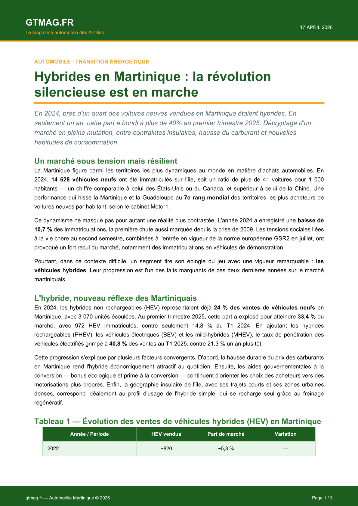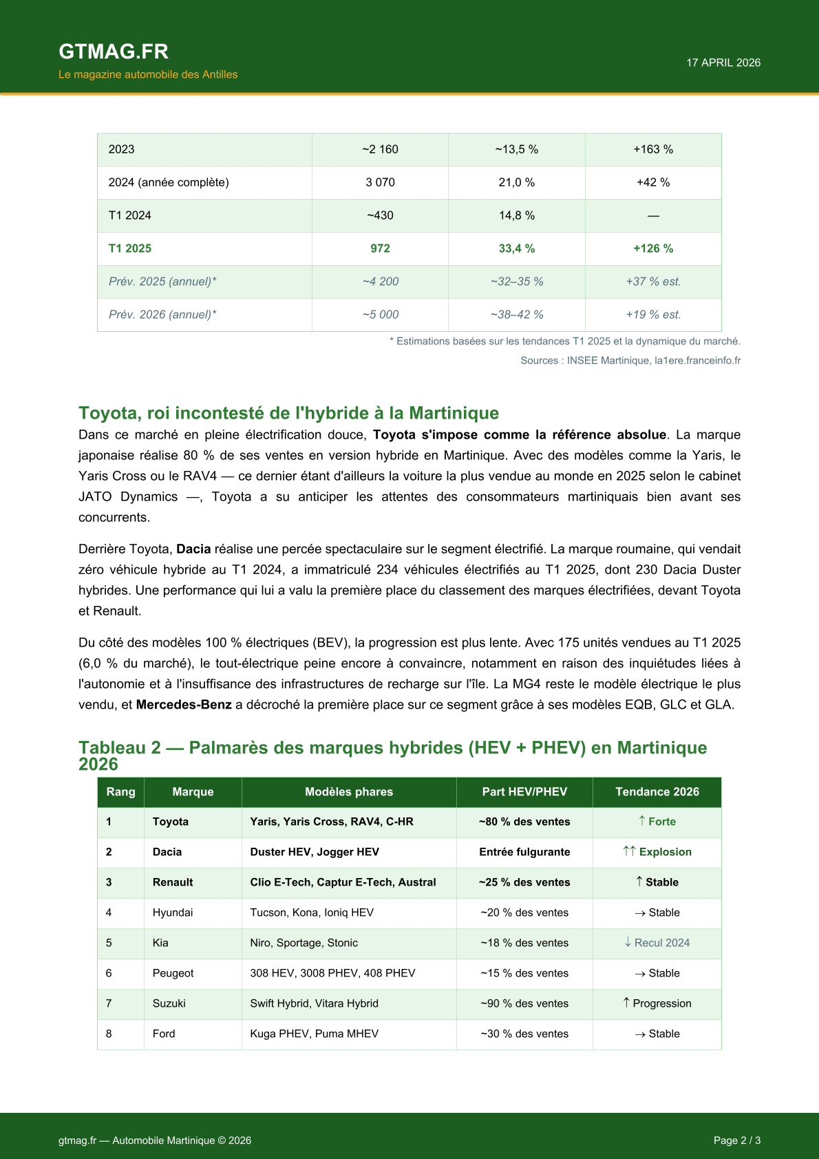 La Martinique figure parmi les territoires les plus acheteurs de voitures neuves au monde, avec plus de 41 véhicules pour 1 000 habitants. Malgré un marché global en recul de 10,7 % en 2024 — première chute depuis 2009 — le segment hybride connaît une progression spectaculaire. En 2024, les hybrides non rechargeables représentaient déjà 24 % des ventes, avant de bondir à 33,4 % au premier trimestre 2025. Au total, en incluant toutes les formes d'électrification, 40,8 % des véhicules neufs vendus au T1 2025 étaient électrifiés, contre seulement 21,3 % un an plus tôt. Toyota domine ce segment avec 80 % de ses ventes en hybride, tandis que Dacia crée la surprise en devenant la première marque électrifiée du T1 2025 grâce au Duster hybride. Cette adoption rapide s'explique par la hausse du prix du carburant, la géographie… L'article ci-dessous par la rédaction de gtmag.fr :
