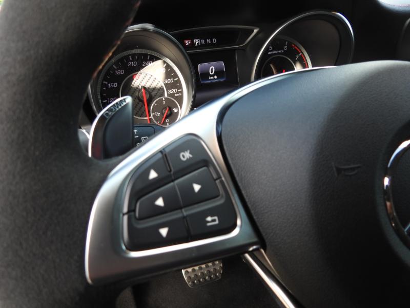"Oui le fameux volant cuir Mercedes et son méplat… Avec l'indication du midi pile comme pour une sportive de circuits… Les palettes sont proéminentes par rapport aux modèles de séries Mercedes… Le double embrayage à été travaillé par AMG pour supprimer les temps de réponses eux associés à une boîte auto 7 rapports… Moteur et volant en aluminium sertis du sigle AMG pour le plaisir de son conducteur…"
