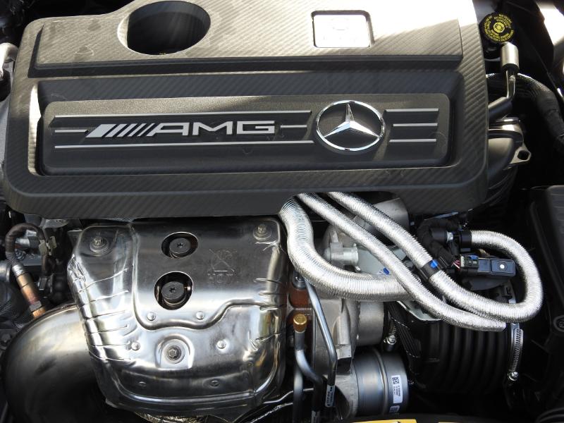 "Sous le capot de notreAMG A45 se trouve un délicieux 2 litres Turbo qui développe 381 cv… Cela en fait le 2l turbo le plus plus puissant d'origine au monde avec un couple de 475 Nm… Nous avons du coup un véhicule qui bat tous les records de ventesAMG chez Mercedes avec ce 4 cylindres en ligne qui s'adapte aux classes A,CLA etGLA contre habituellement les V6 et autres V8…"