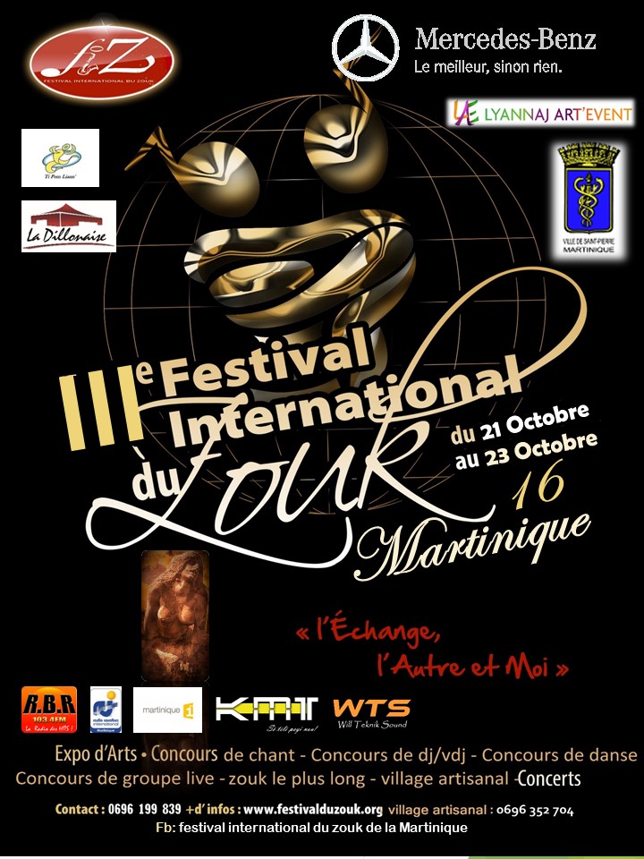 Le festival à pour vocation de faire la promotion de la culture Zouk à l'international… Cette très belle musique de nos Antilles. Nous cherchons également à servir de tremplin à des talents qui souhaiteraient entrer dans le monde musical mais aussi à promouvoir ceux qui œuvres déjà dans ce monde comme interprètes ou compositeurs et qui cherchent à percer et mieux êtres connus… le festival leur permet de rencontrer des artistes confirmés et de bénéficier de conseils précieux voir d'être repérés… A savoir que suite aux différents concours organisés pendant ces 3 jours, les heureux gagnants pourront réaliser un album avec les conseils de tous les professionnels partenaires du festival… Concours de groupe live, concours de Dj, concours de chants… Tout un programme et de nombreux jeunes talents vont concourir… Il faut venir les encourager… Nous comptons sur la population martiniquaise…
