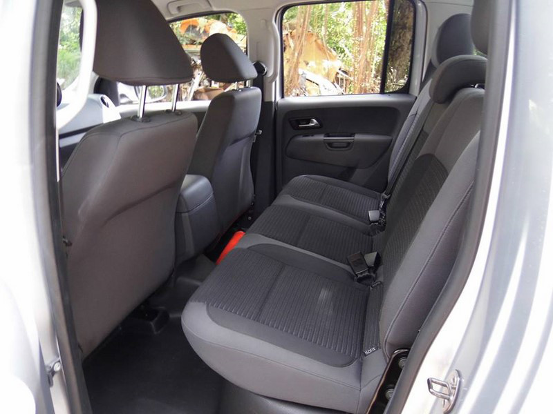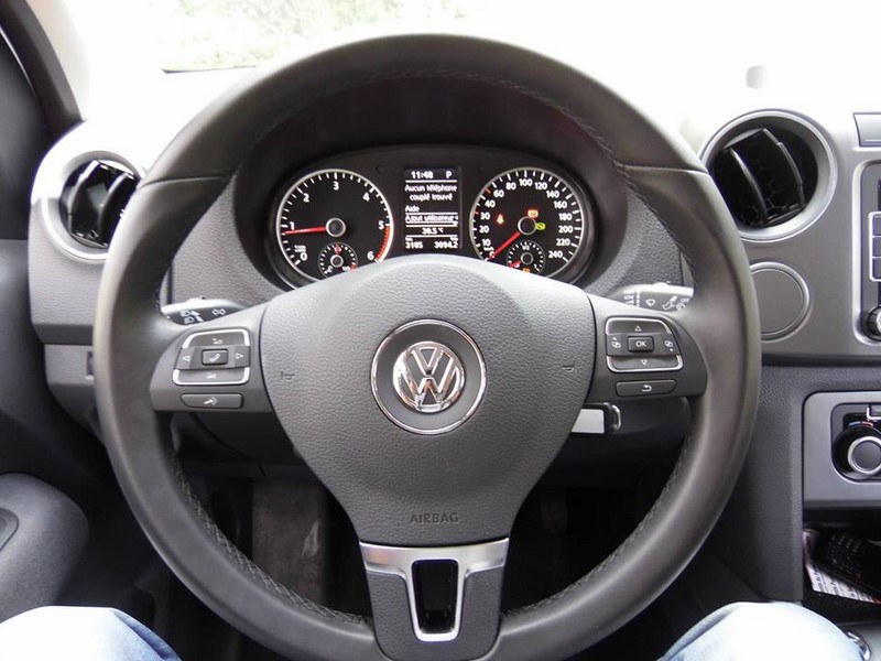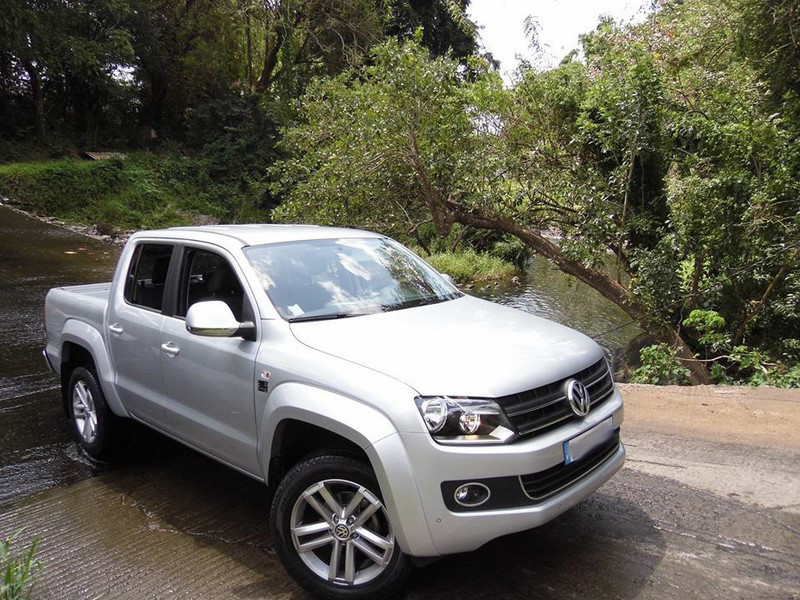La marque Allemande nous propose ce Pick up avec des intentions très clairs nous semble t’il… Première impression : Nous avons vraiment le sentiment d’entrer dans un vrai 4x4 et une vraie Volkswagen… Voyons côté confort et roulage… Whao !!! Dans le mille !!! En effet l’AMAROKdispose des arguments d’un vrai 4x4 côté confort et suspensions… Nous abordons la rocade avec le réel sentiment d’être au volant d’un véhicule confortable adapté aux gens des Mornes… Eux surement soucieux d’acquérir un véhicule absolument utilitaire mais offrant du plaisir de roulage en mode journalier… Côté intérieur la double cabine propose 2 vraies places à l’arrière spacieuses et suffisantes. VW à bien sur soigné les matières et l’on comprend également que celles-ci sont faites pour affronter le quotidien parfois rude des ‘BTistes’ et leurs outils. Avec près de 1160 kg environ à charger la benne offre une disponibilité qu’apprécierons les Pros. Comptez 2.50 m2, l’équivalent d’une palette de bois standard…Mais là ou nous sommes le plus conquis c’est côté machine… Le puissant 180 ch de l’AMAROKavec un couple maxi de 420 Nm emporte les 2 tonnes de la bête sans sourcilier… Le moteur de notre Pick up Volkswagen assure un compromis agrément/prestation/consommation plus qu’acceptable… Bien joué aussi cher AMAROK car côté insonorisation nous sommes également dans la qualité et le bien-être voulu par la marque pour ses utilisateurs en labeurs…