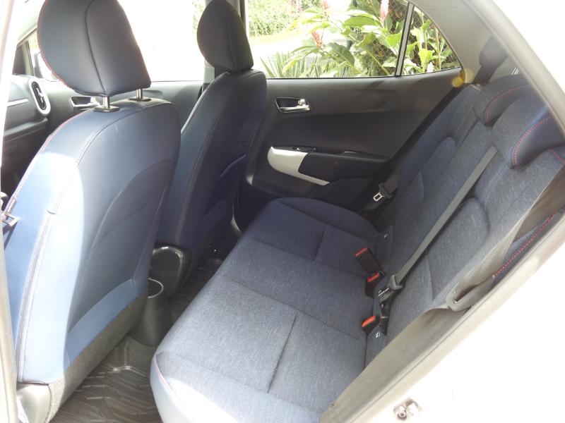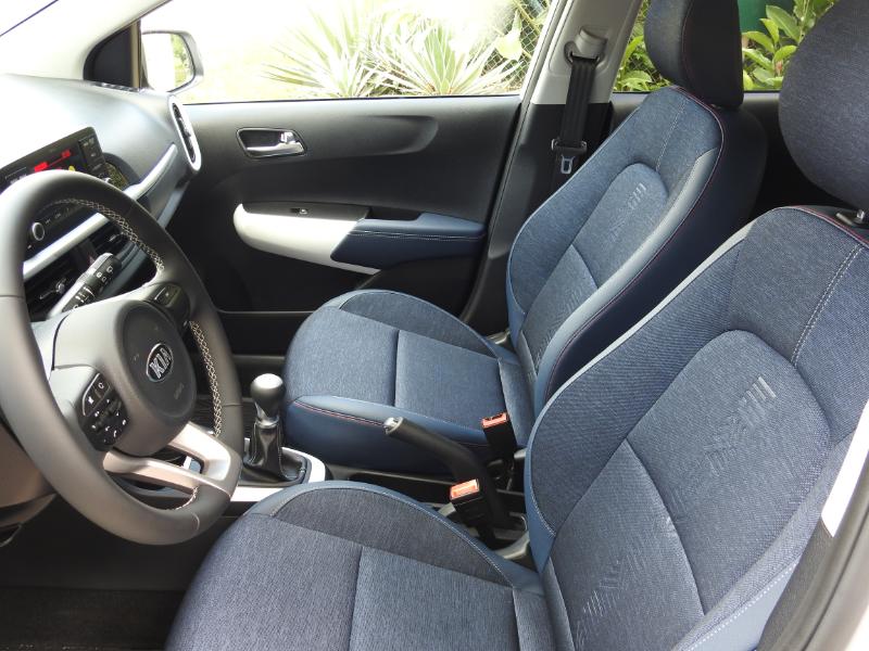 Pour la touche féminine, le miroir de courtoisie reçoit un bandeau d’éclairage supplémentaire. La GT Line dispose en plus, et c’est une première, d’un accoudoir centrale coulissant sur 55mm. Certes de petite contenance, vous y rangerez une petite bouteille ou quelques petits objets. Elle propose également la climatisation automatique, la caméra de recul, le volant à méplat et un habillage de siège imitation cuir. Le toit ouvrant électrique et le chargeur de smartphone par induction sont en option. Par rapport à la concurrence, les places arrière de la Picanto disposent en moyenne de 20mm d’espace aux jambes en plus.