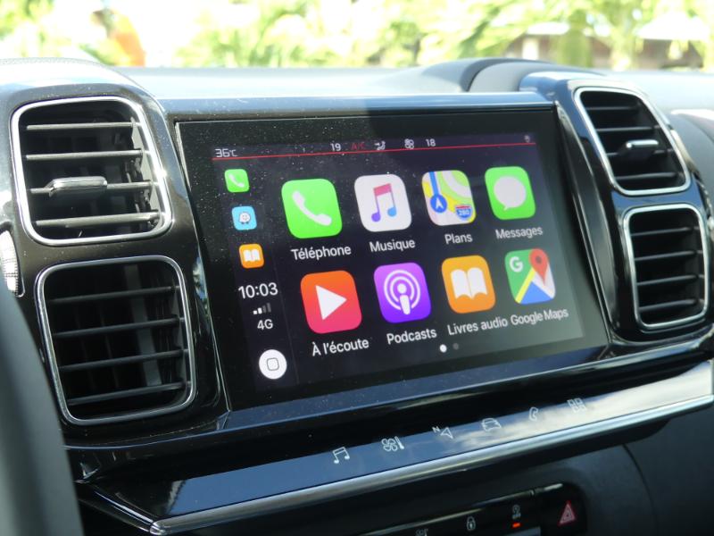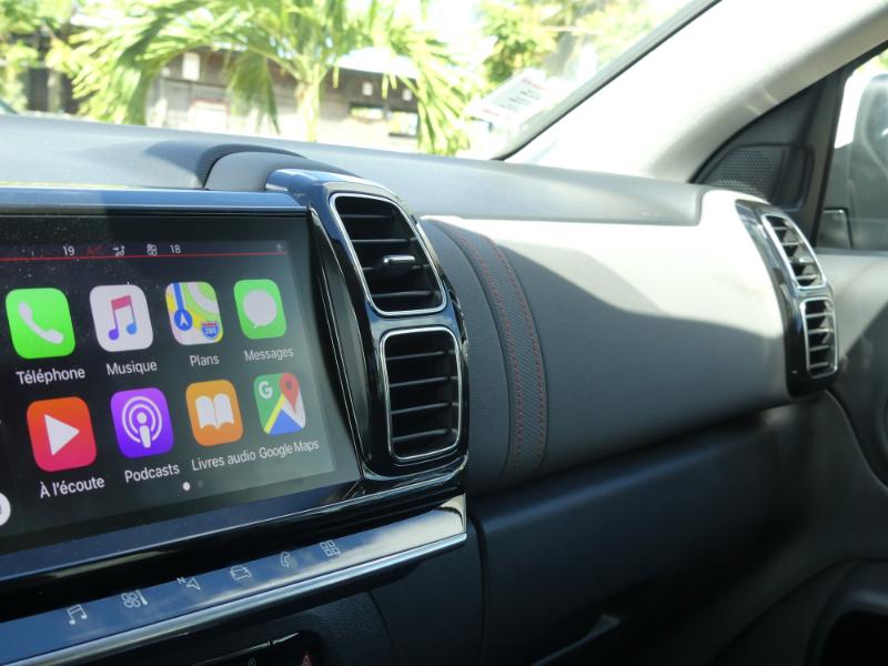 Merci aux suspensions à double butées hydrauliques, inaugurées sur certaines C4 Cactus début 2018 et présentes de série sur tous les nouveaux C5 Aircross. Une technologie indispensable, et moins coûteuse que la suspension pilotée couplée à une caméra « liseuse » de bosses employée sur le cousin DS7 Crossback. Il faut dire que le C5 Aircross est plus abordable, en matière de tarifs. C'est la première arme et la première impression en arrivant sur Carrère cette fameuse suspension double butées… Oui la déformation de l'asphalte, raviné par les camions, s’absorbe sans broncher… Le C5 Aircross avale et avale encore les nids de poules en vous laissant comme sur du coton…