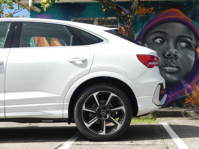 L’Audi Q3 Sportback affiche une longueur de 4,50 mètres, une largeur de 1,84 m et une hauteur de 1,56 m. Son empattement est de 2,68 m. Un aspect plus sport, une ligne de toit plongeante, avec sa face avant musclée au premier regard ce Q3 coupé attire la foule. Le design de la version Sportback respecte les traditions de l’esprit coupé et sportif de la marque allemande. On se retourne dans la rue pour admirer ce très réussi SUV Coupé. Avec cette finition S-Line, ses jantes de 19 pouces, sa calandre full black, sa teinte de carrosserie blanche, la configuration est parfaite pour mettre en valeur ses courbes latines.